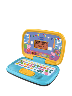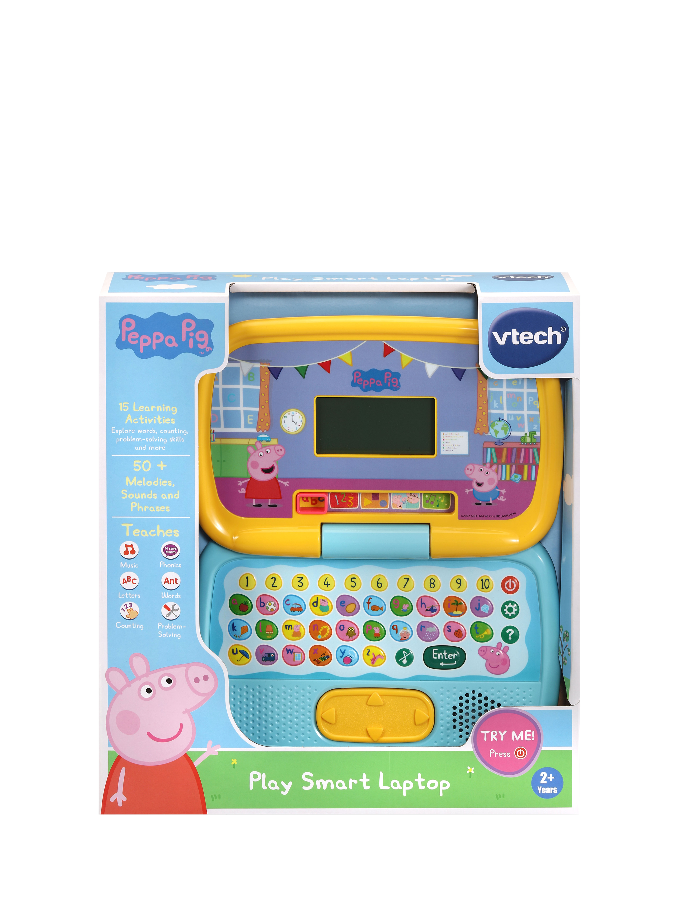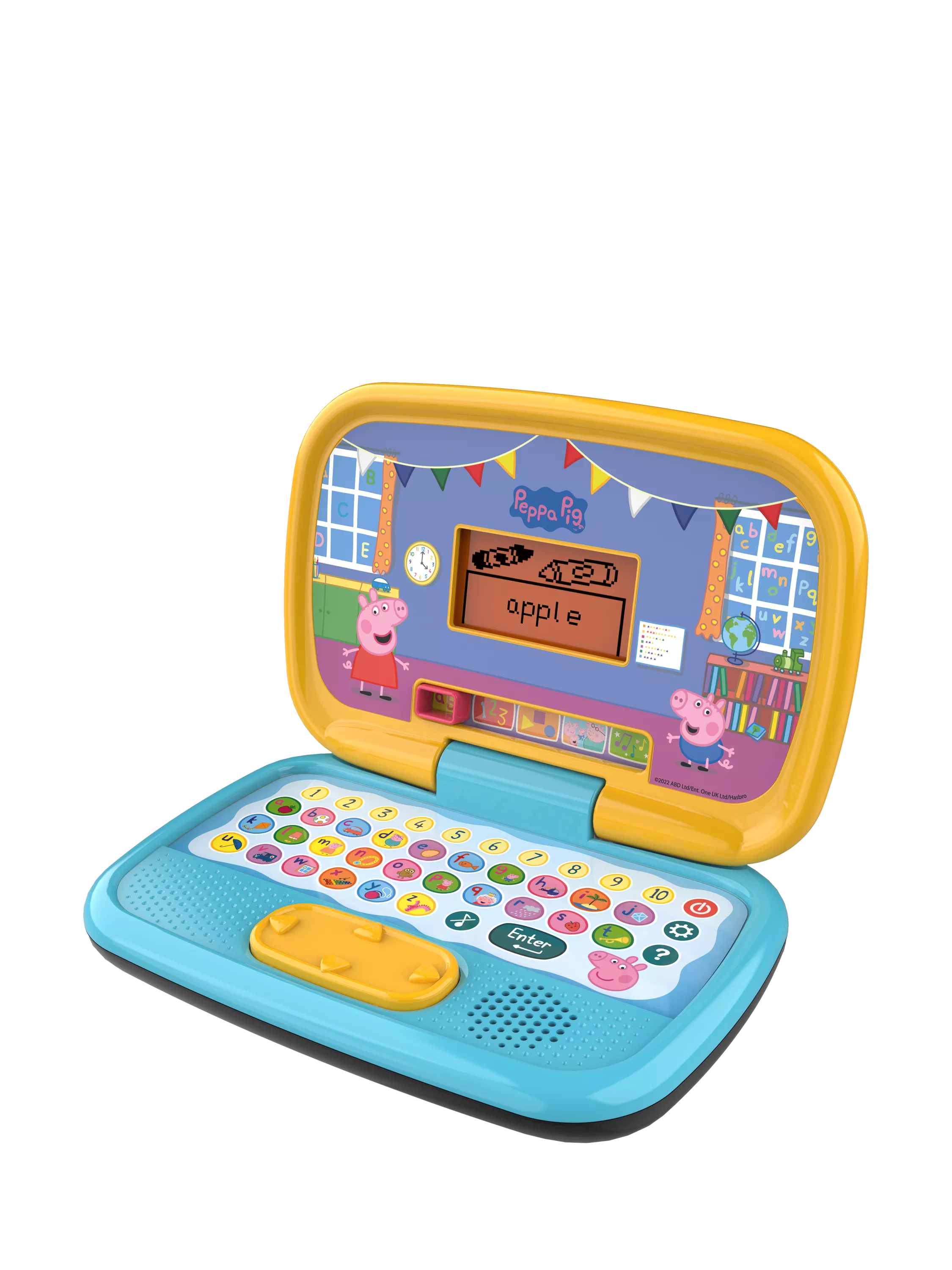 Join Peppa & her friends as they learn with the Peppa Pig Play Smart Laptop by VTech®. This cute laptop encourages role-play and is packed with 15 games and activities. Press the letter buttons to explore each letter and its sound, all while Suzy Sheep and Peppa draw pictures. Help Peppa and George find the correct number of apples or help Peppa guess what is hiding behind objects.