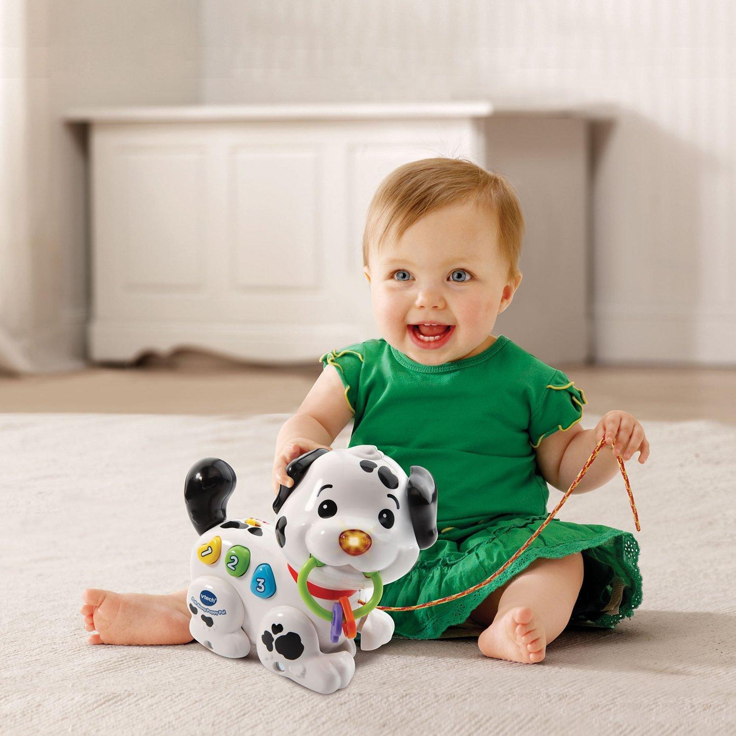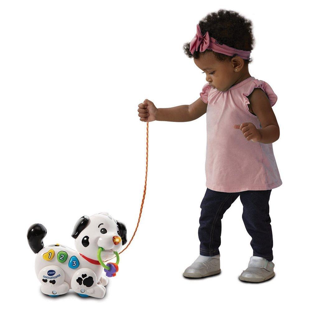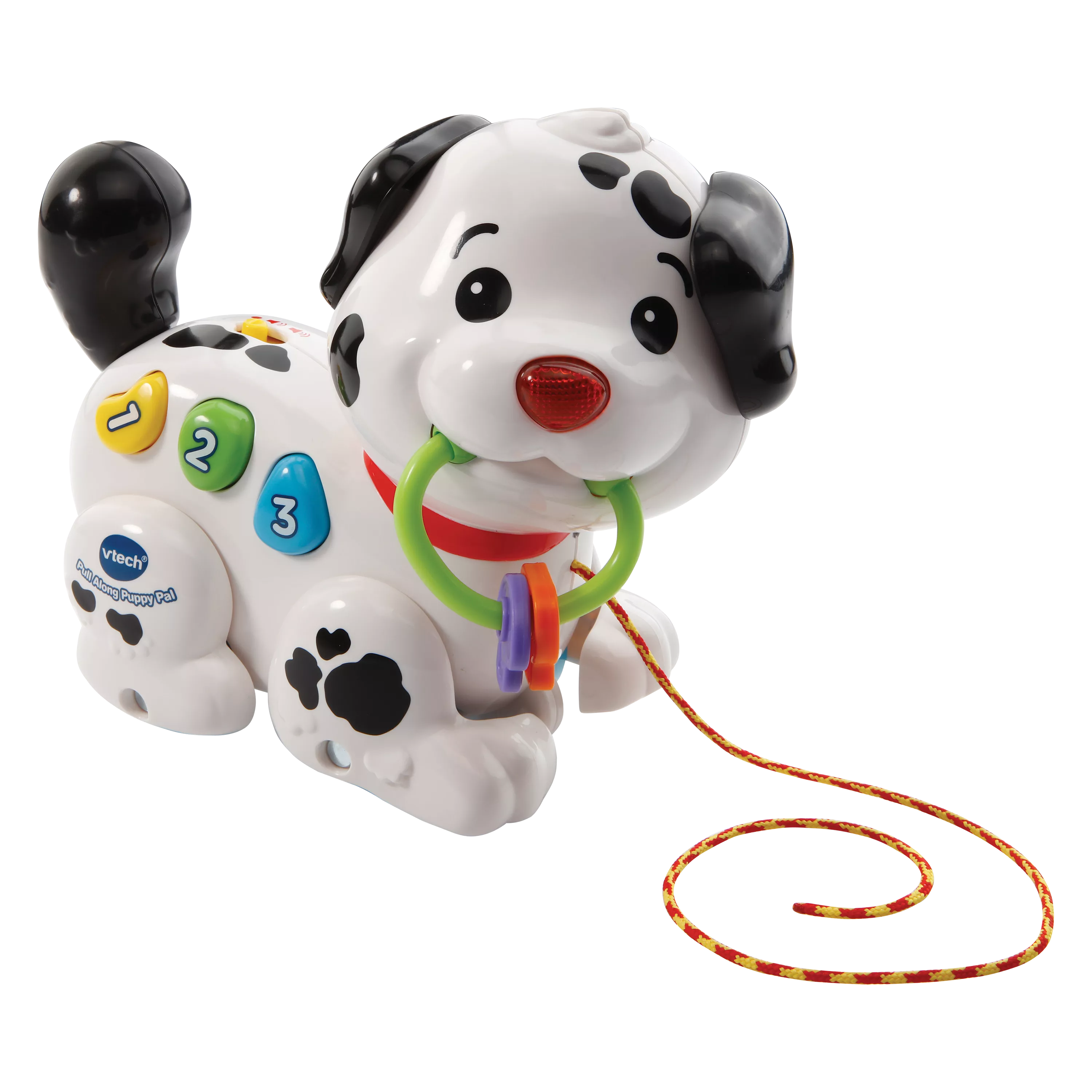 Take the Puppy Pal for walks to hear puppy sounds and melodies. Press the buttons on the side of the puppy to hear fun phrases, songs, melodies and sounds. The Puppy Pal helps develop motor skills and teaches cause & effect. Puppy’s legs move when pulled along and his ears and tail can be spun. Includes 3 sing-along songs and 20 melodies.