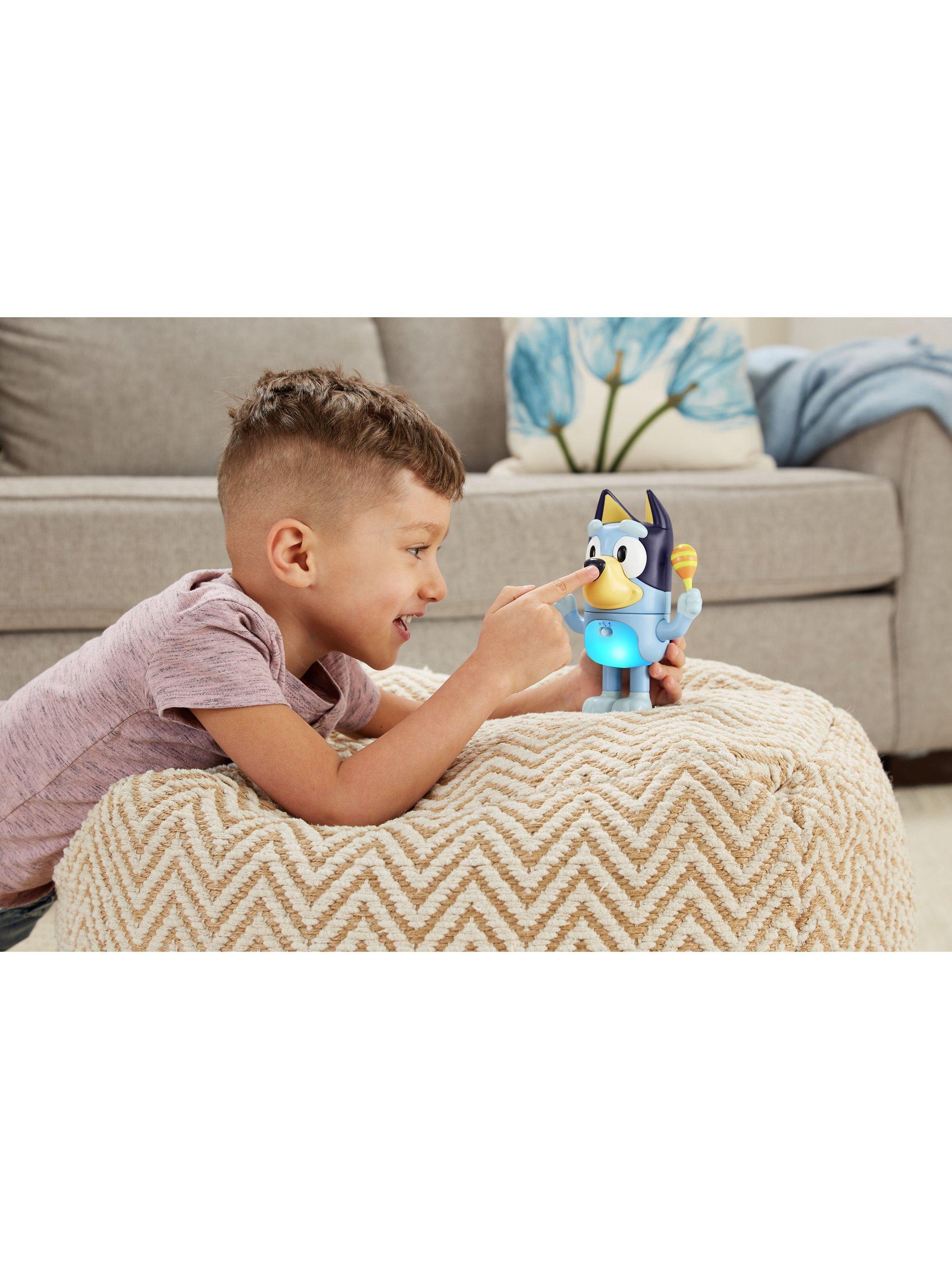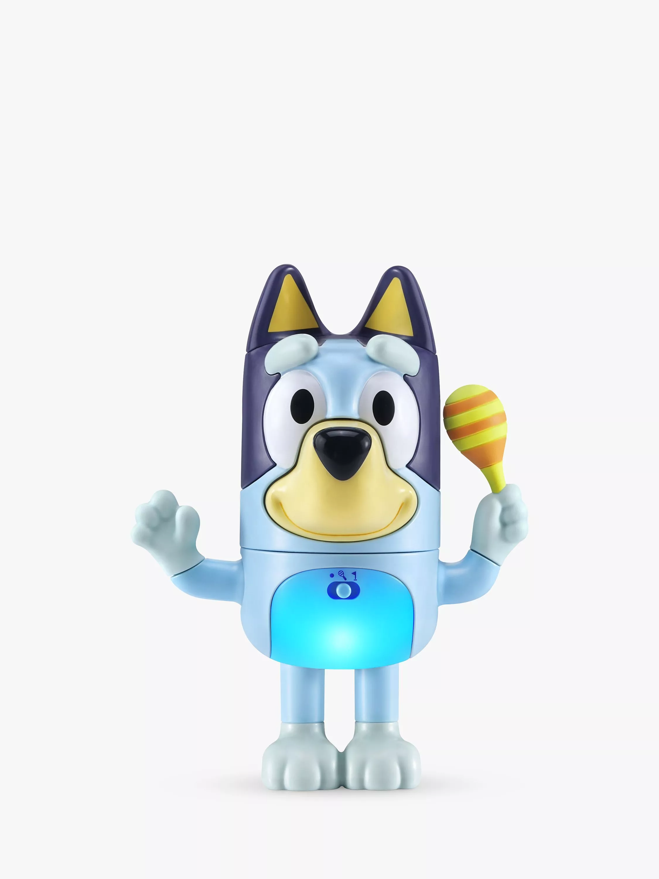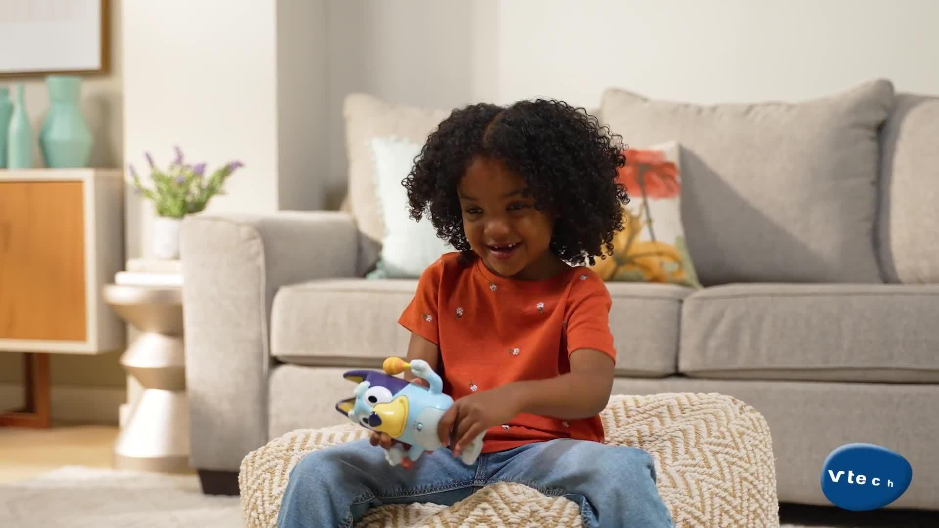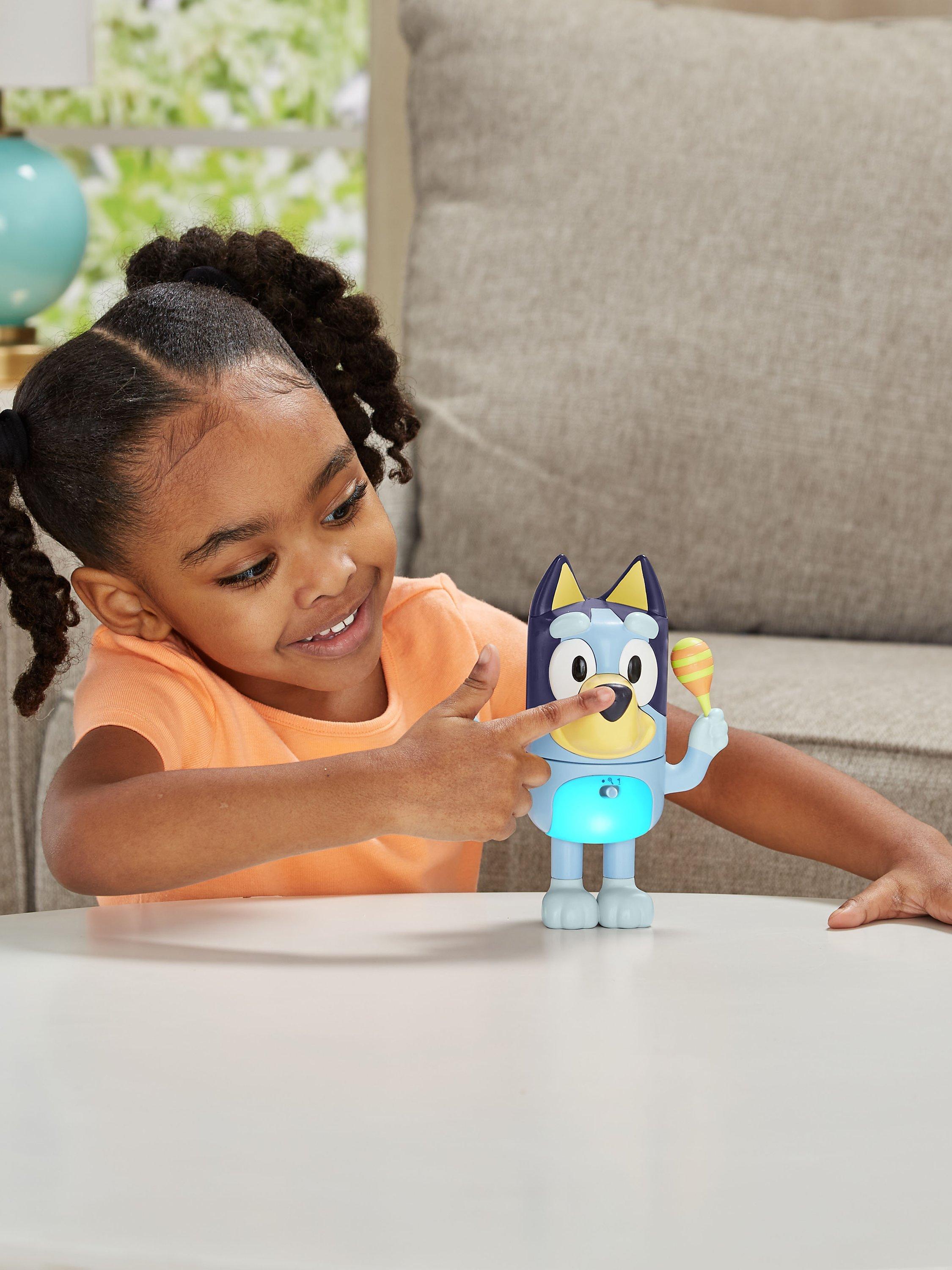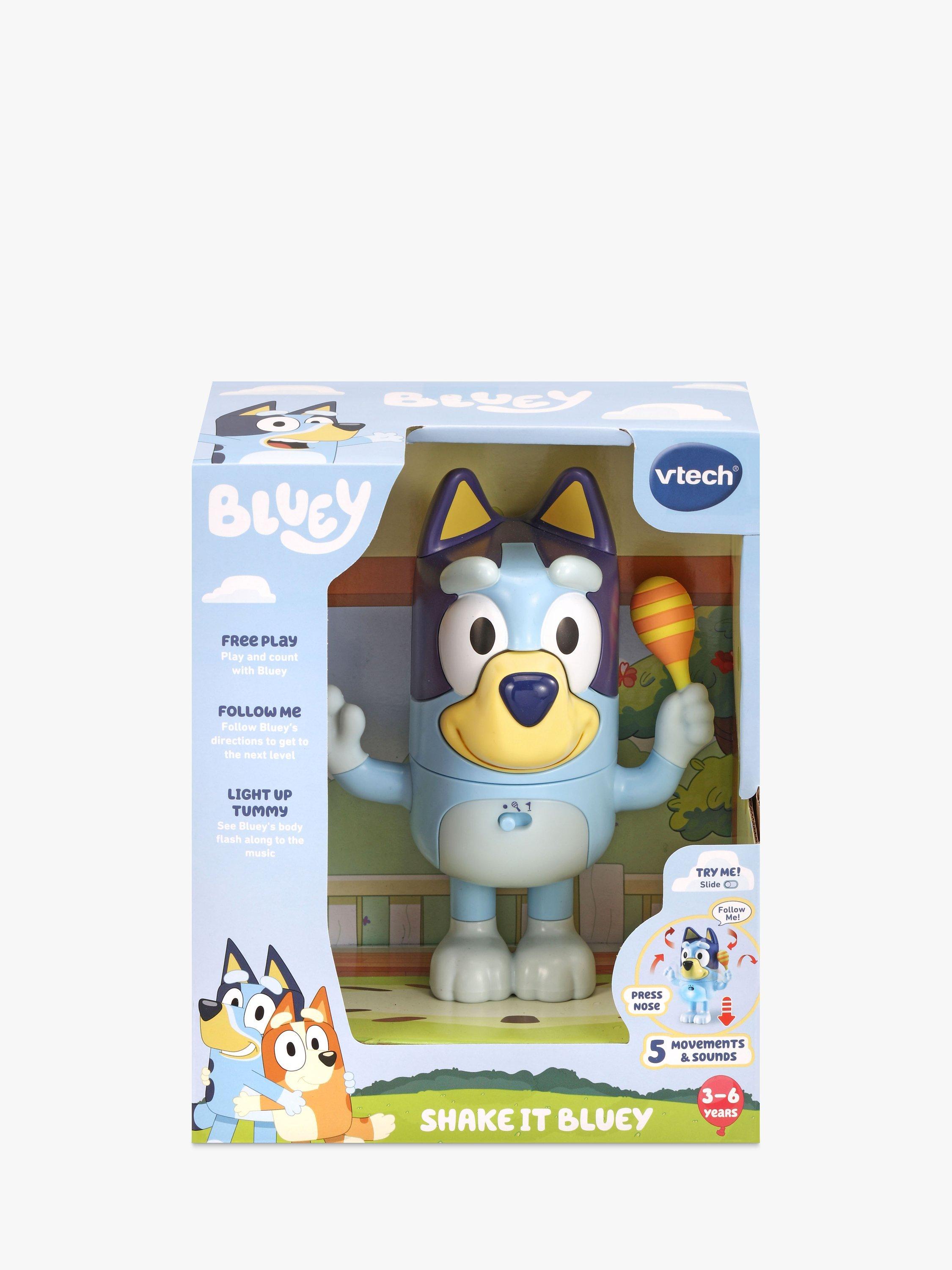 Shake It Bluey! Press Bluey's nose, wave her right arm, turn her head, shake the shaker or bop her body down to hear sounds and phrases in Free Play mode. In Follow Me mode, follow the sequence to move to the next level.