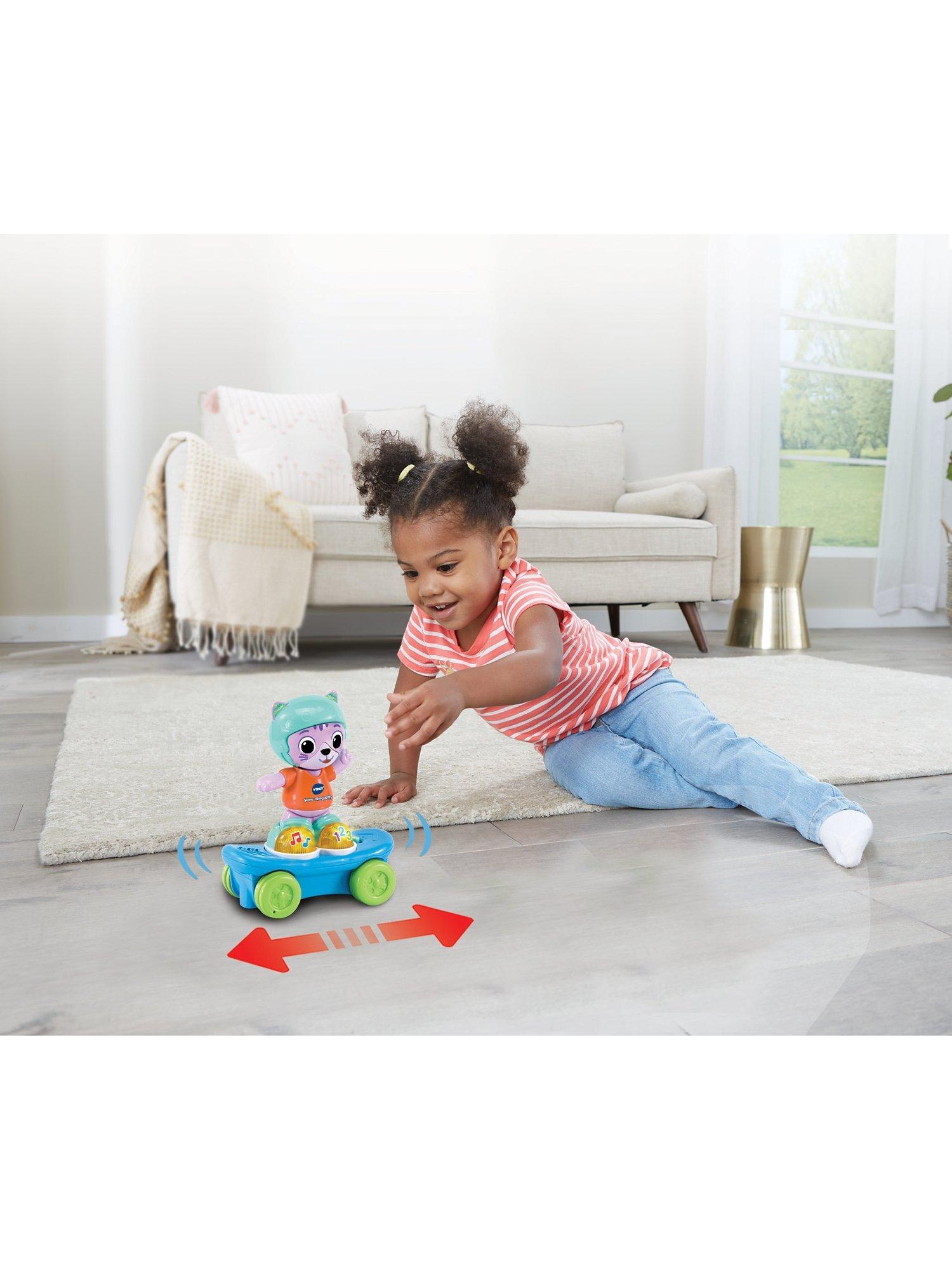 The two light-up buttons on Kitten's shoes introduce numbers, fun phrases, sounds and music. Pull the skateboard back, release and she will move back and forth rhythmically, encouraging little ones to learn cause-and-effect relationships and gross motor skills.