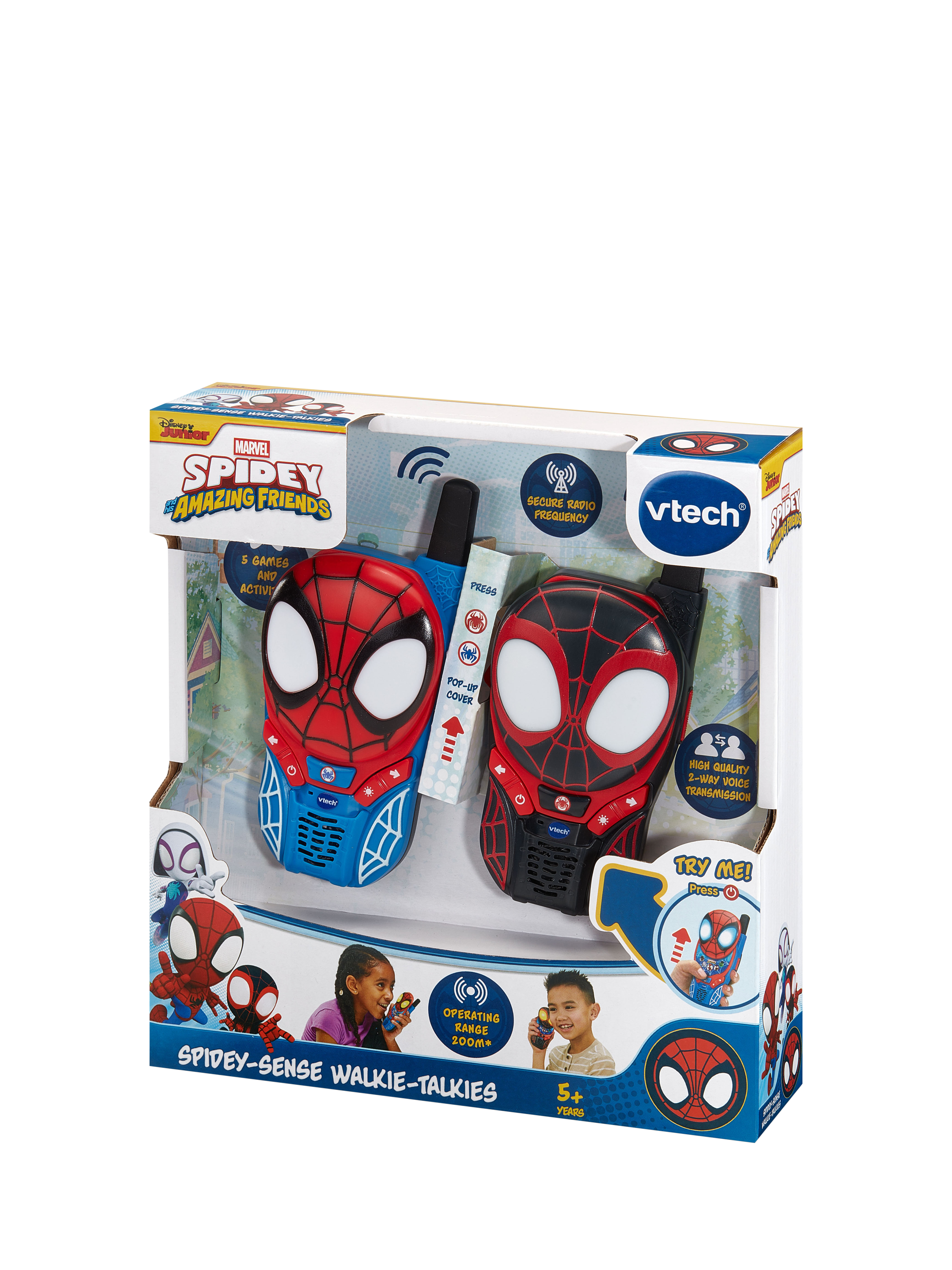 Come in, Spidey fans, over! It's the Spidey-Sense Walkie-Talkies by VTech®! Keep in touch indoors and out, at home or on-the-go with real walkie-talkie communication. These child-safe two-way walkie talkies keep your child’s conversations encrypted and secure, preventing other walkie-talkie users from listening in on their secret Spidey mission conversations!