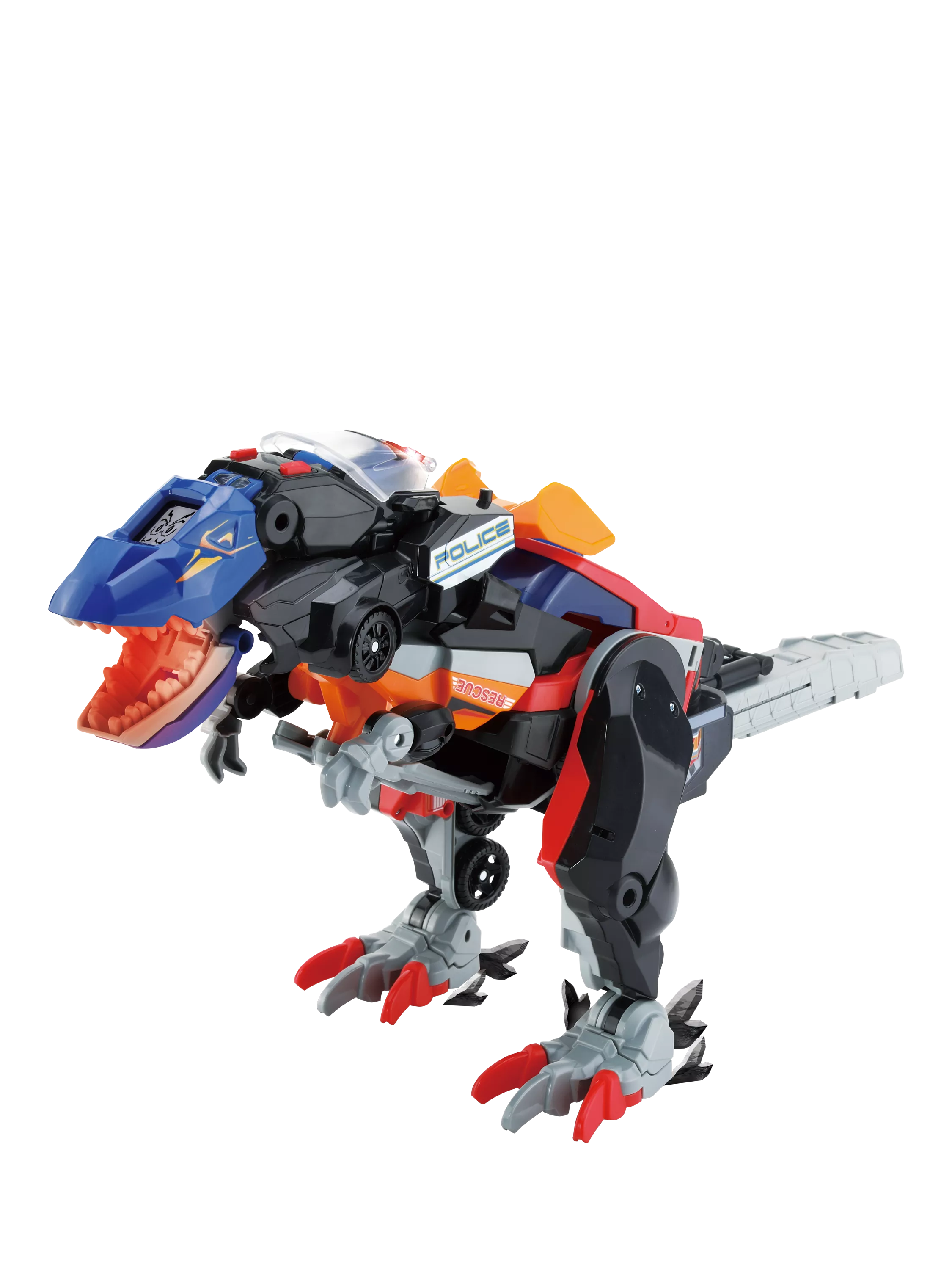 Three mighty rescue vehicles - police car, helicopter and fire engine - combine together in a few simple steps to become a truly mega Rescue-Rex! Hear lively sound effects and fun phrases as you switch and go. See cool dino eye and driver animations on the LCD screen, lights illuminate the Rescue-Rex mouth and the police car emergency lights. For added fun, extend and spin the fire engine ladder, spin the helicopter rotor blades and bring the Rescue-Rex to life with over twenty articulations!