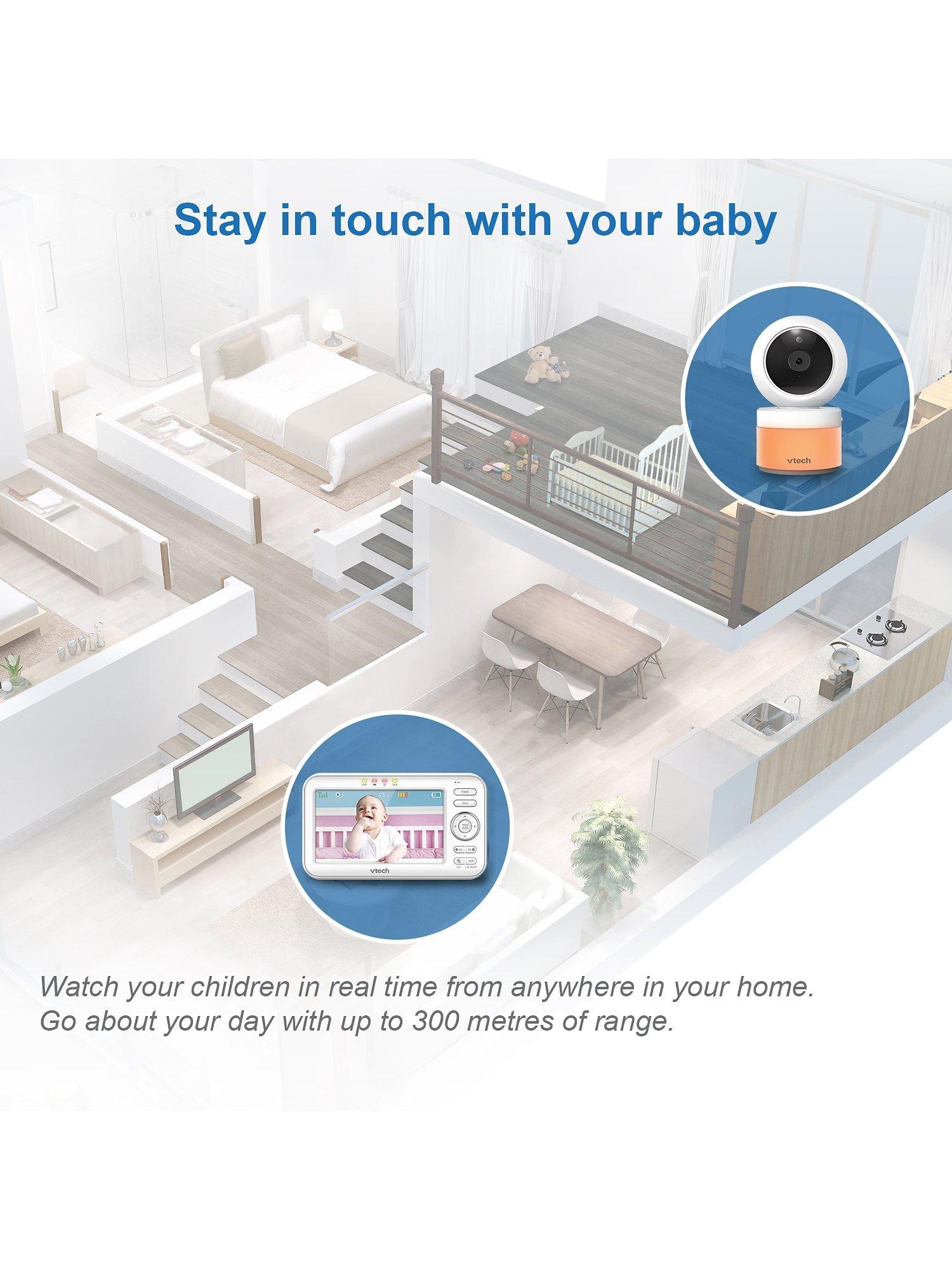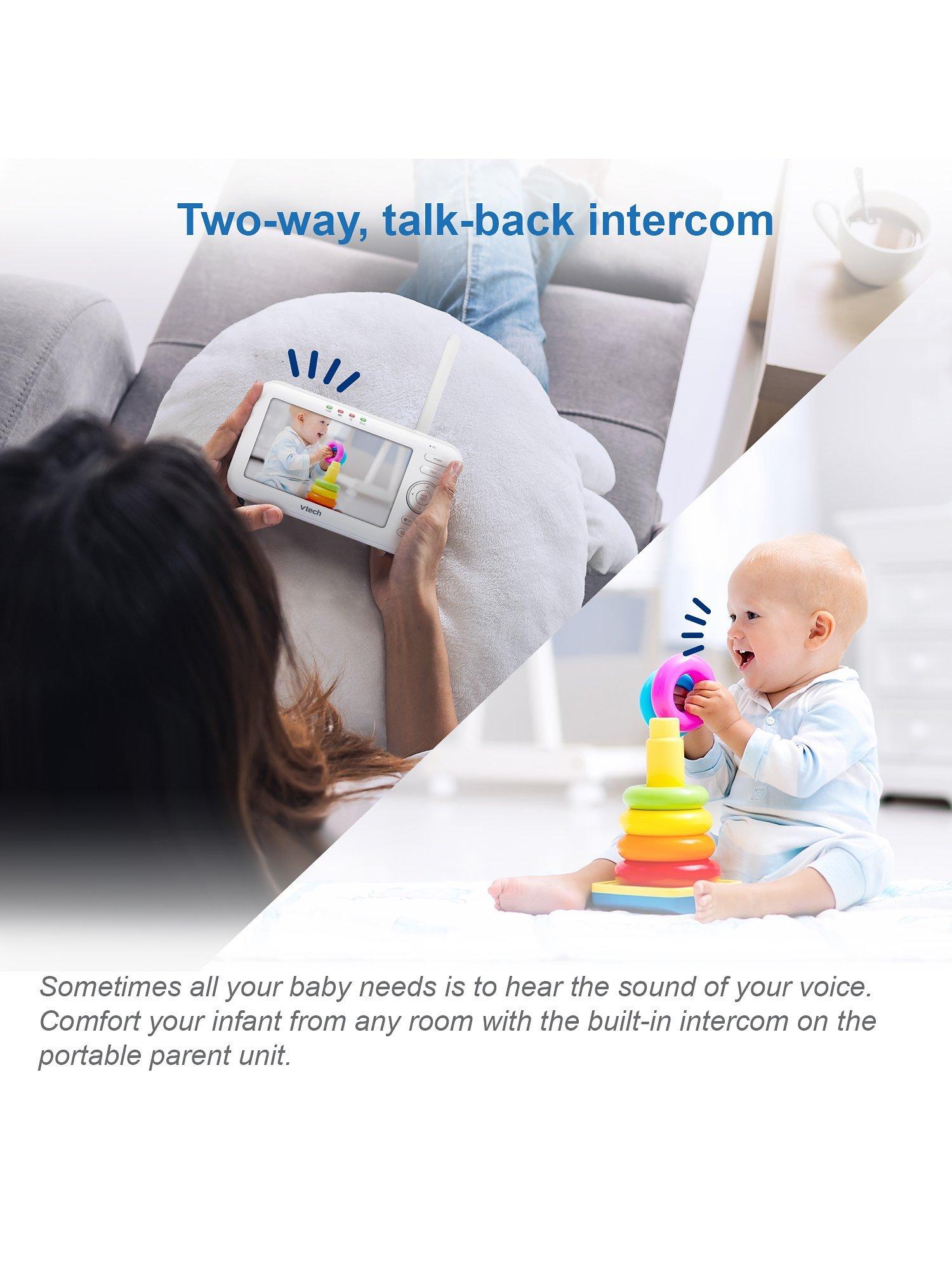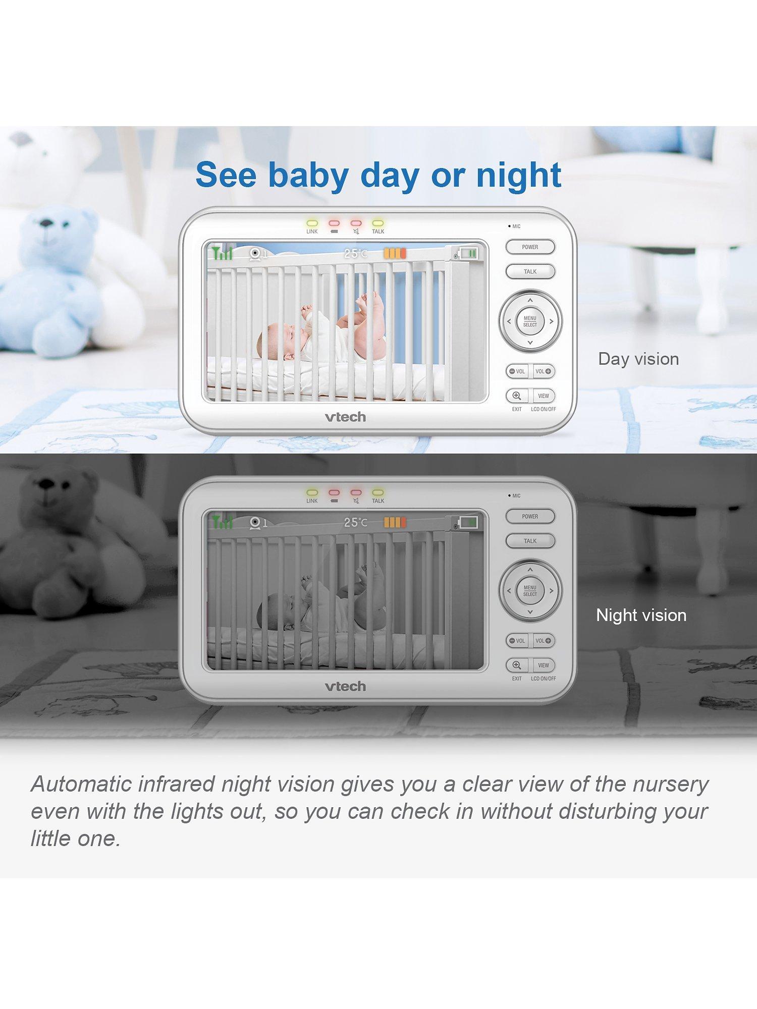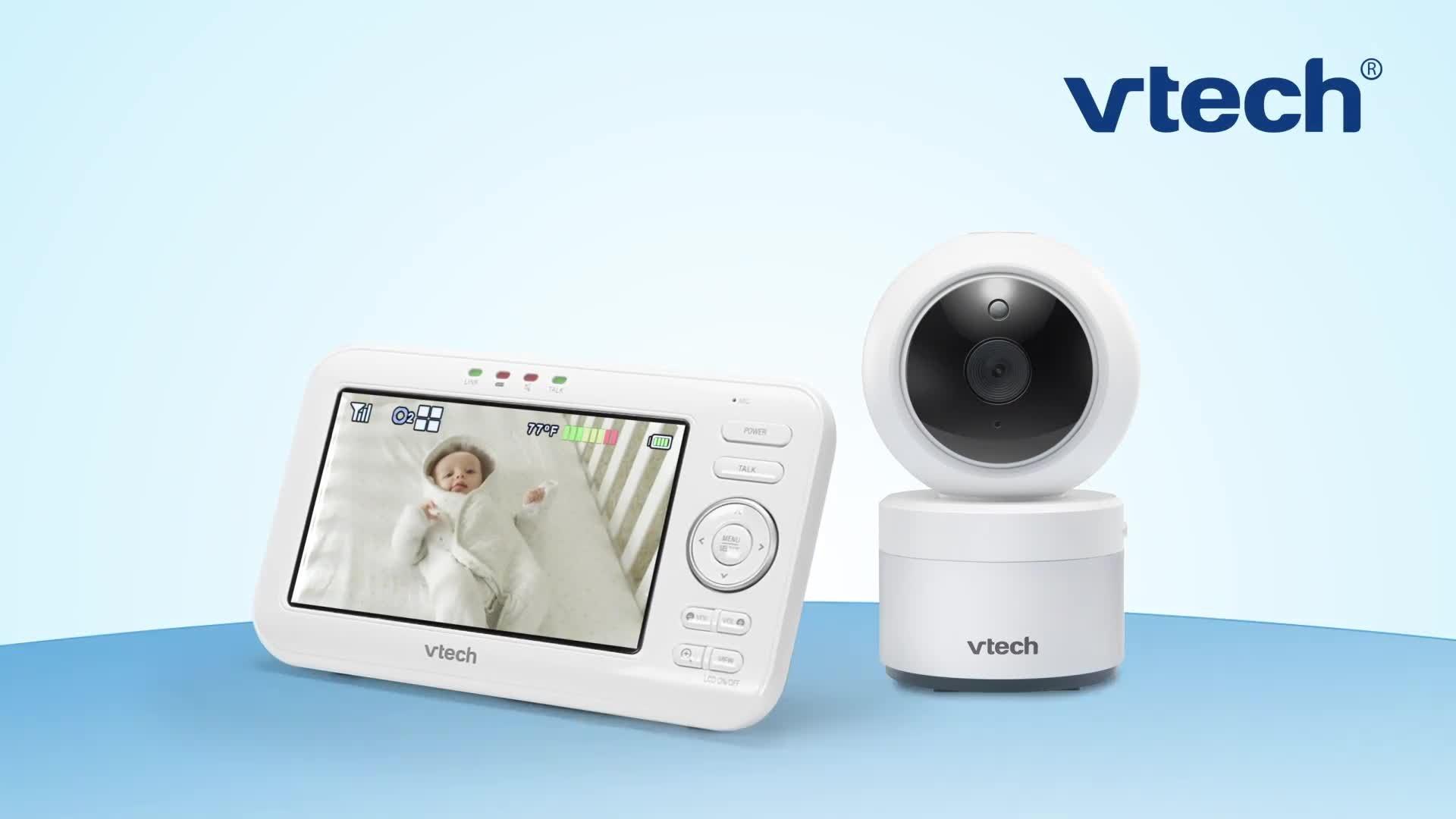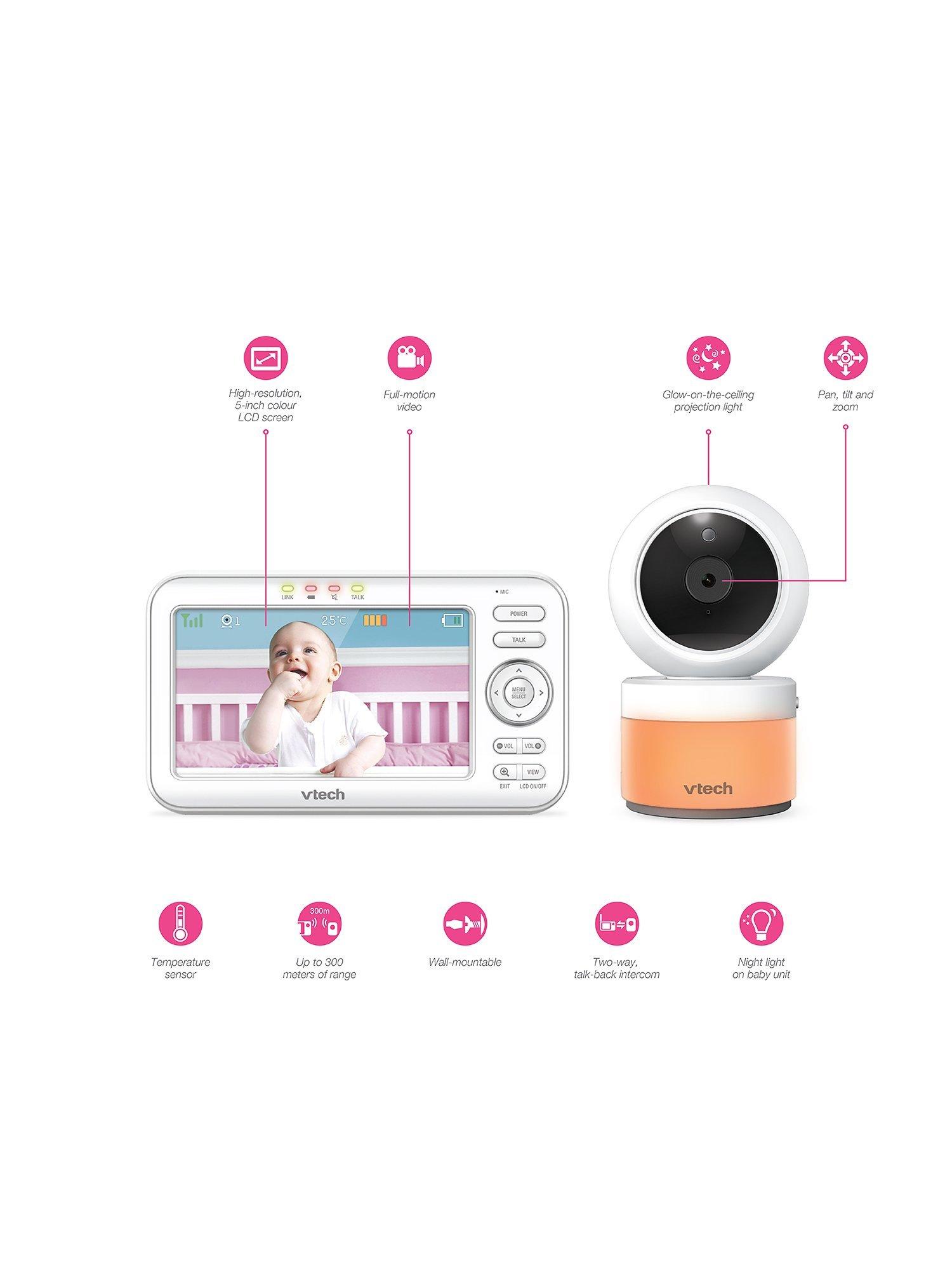 Be there for baby with the VM5463 5inch Digital Video Baby Monitor with Pan & Tilt Camera, Glow-on-the-ceiling light and Night Light from VTech. This video monitor lets you pan and tilt to get a better look at every angle in the nursery using the long-range parent unit. Talk to baby from anywhere in the house thanks to the built-in talk-back intercom so your little one knows you're on your way.