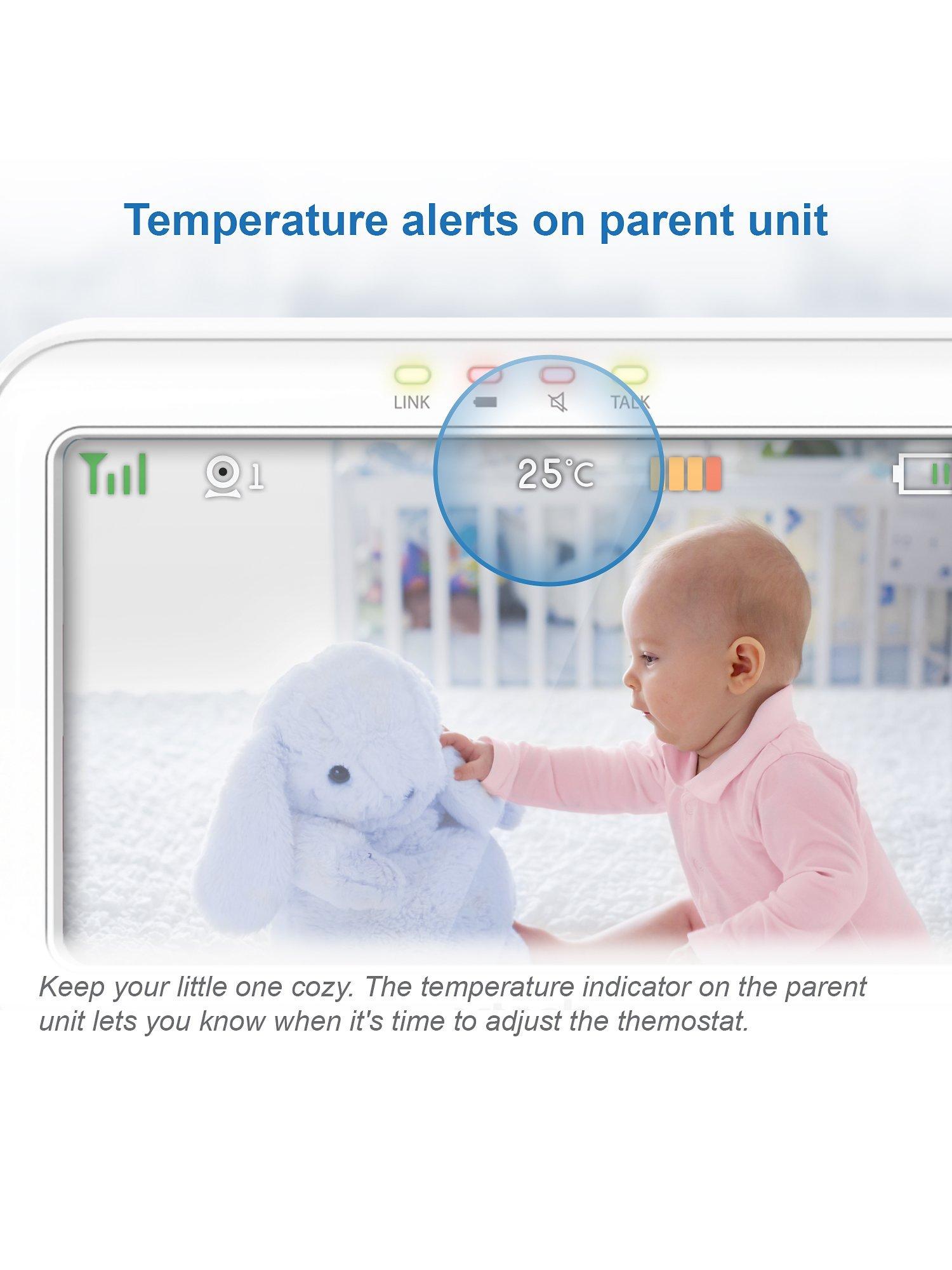 This versatile device also helps you soothe baby using the glow-on-the-ceiling light, night light and lullabies and soft sounds that play right from the baby unit. Plus, you can make sure your infant is cozy by monitoring the nursery temperature that's displayed right on the large 5inch LCD screen. Best of all, you can check in during nap time or after dark thanks to automatic infrared night vision.