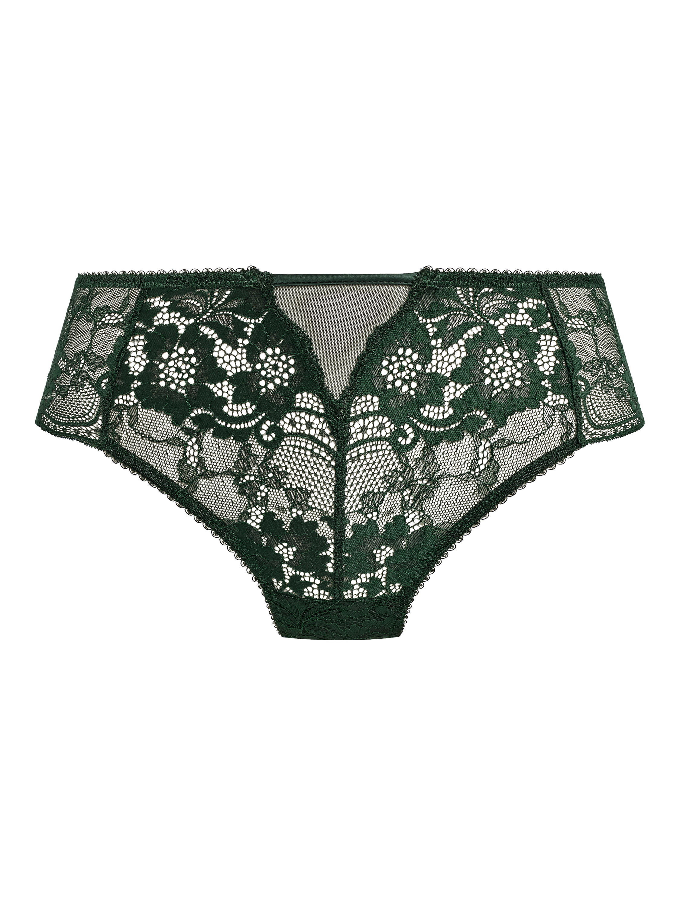 Natsuki lace styles feature delicate matte stretch lace with luxurious satin accents. The stretch lace front brief features a mid-rise waist with full back coverage, a pretty decorative back waist and front leg elastics, as well as lace scallop detail at the centre front V mesh insert. Satin binding at the top.