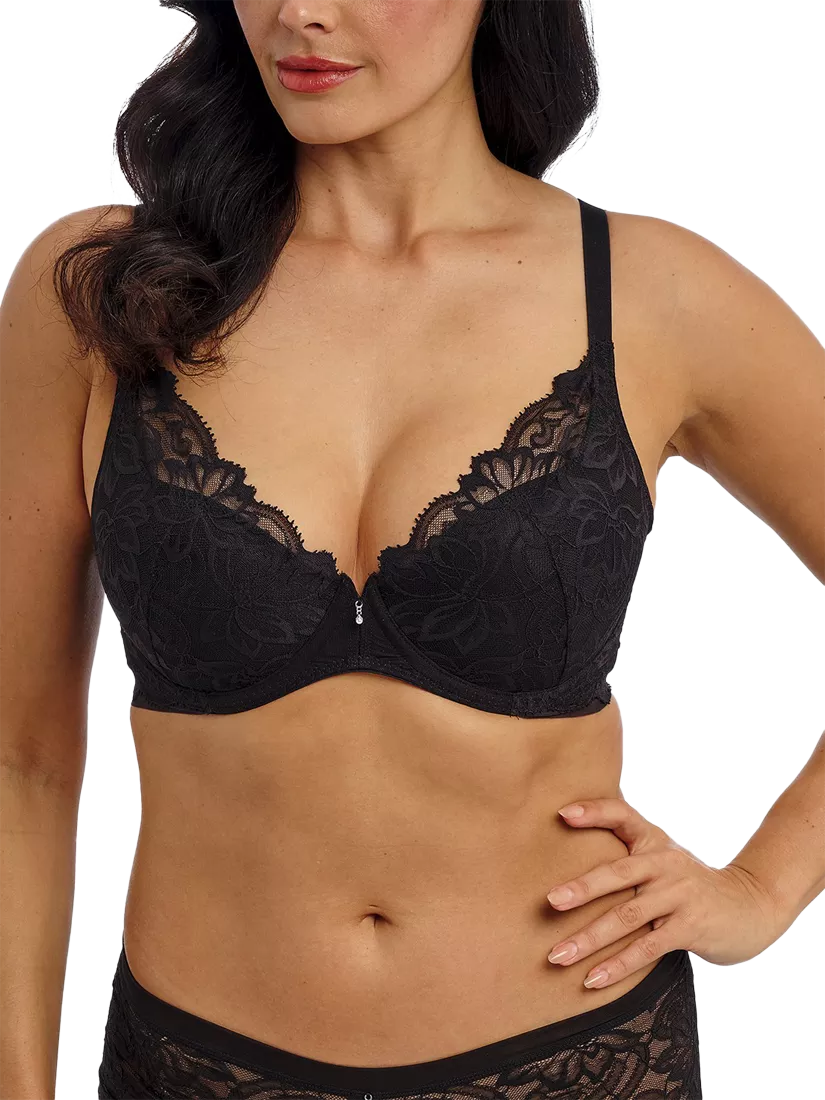 Abéllia features a super-soft floral stretch lace combined with a lightweight mesh with a selvedge finish that contours the body’s silhouette for a soft and comfortable fit. The Underwire Plunge Bra features scallop edge stretch lace outer darted cup, ultra-soft and light push up pad which gives cleavage, uplift and adds dimension as well as fully adjustable stretch straps. Lace wing features an innovative selvedge stretch mesh liner for comfort. Pearl drop effect trim detail at the centre front completes the look. 2-hook fastening on all sizes.