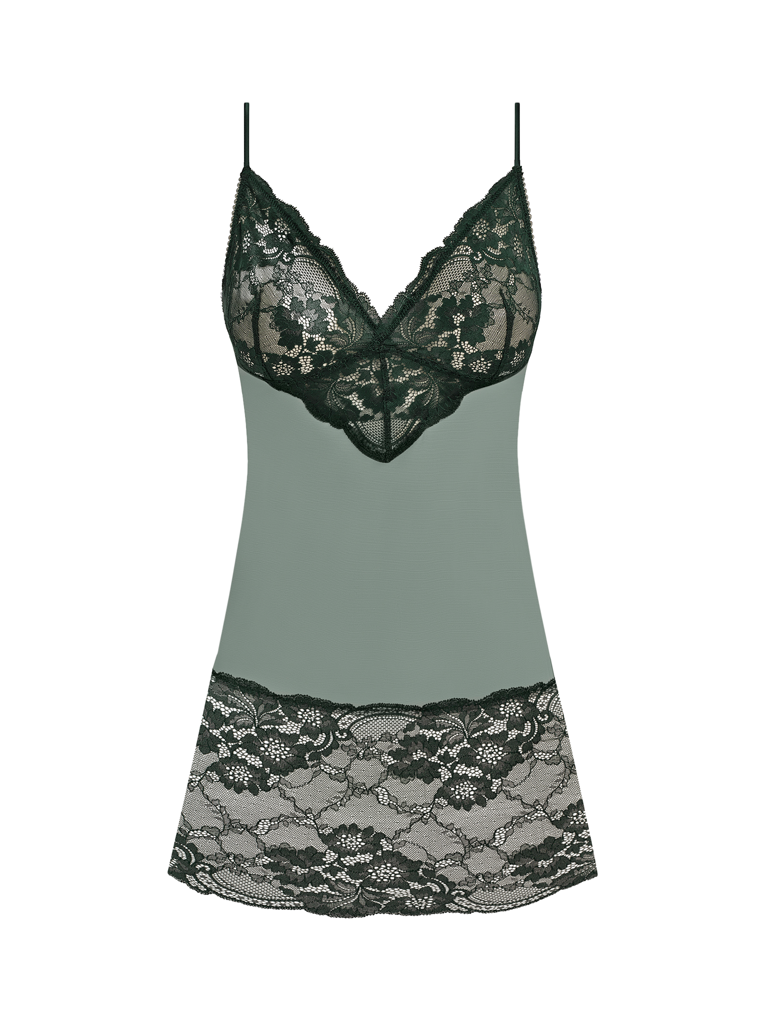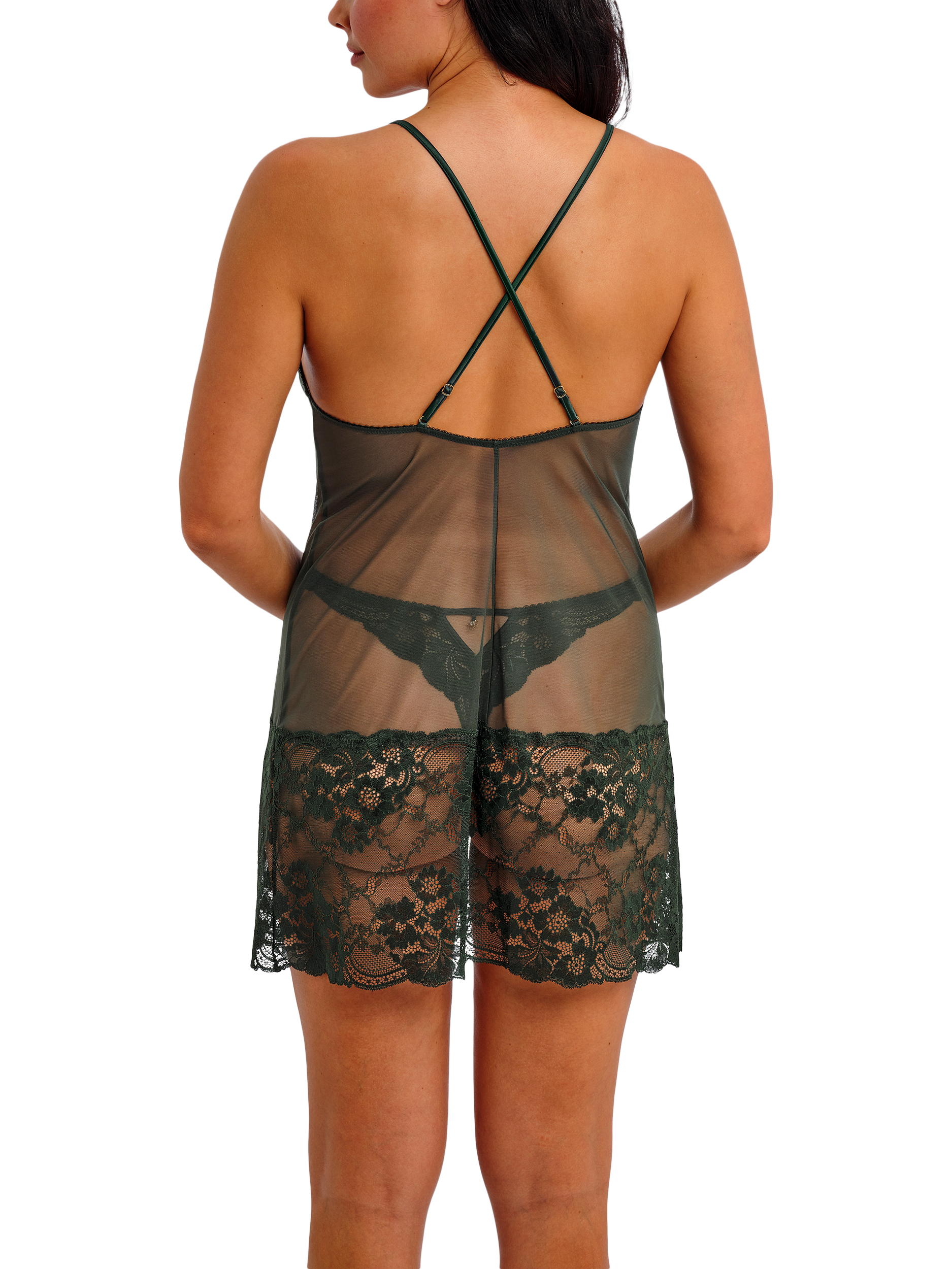 Natsuki lace features delicate matte stretch lace with luxurious satin accents. The chemise has a stretch lace triangular-shaped cup with scallop edges at the neckline and a dart for shape, with cross-over detail at the centre front and satin binding detail for a luxurious touch. Front and back hem features the full-width galloon stretch lace. Lower back, with a cross-over strap feature. Relaxed fit stretch mesh body. Stretch satin fully adjustable rouleau spaghetti straps.