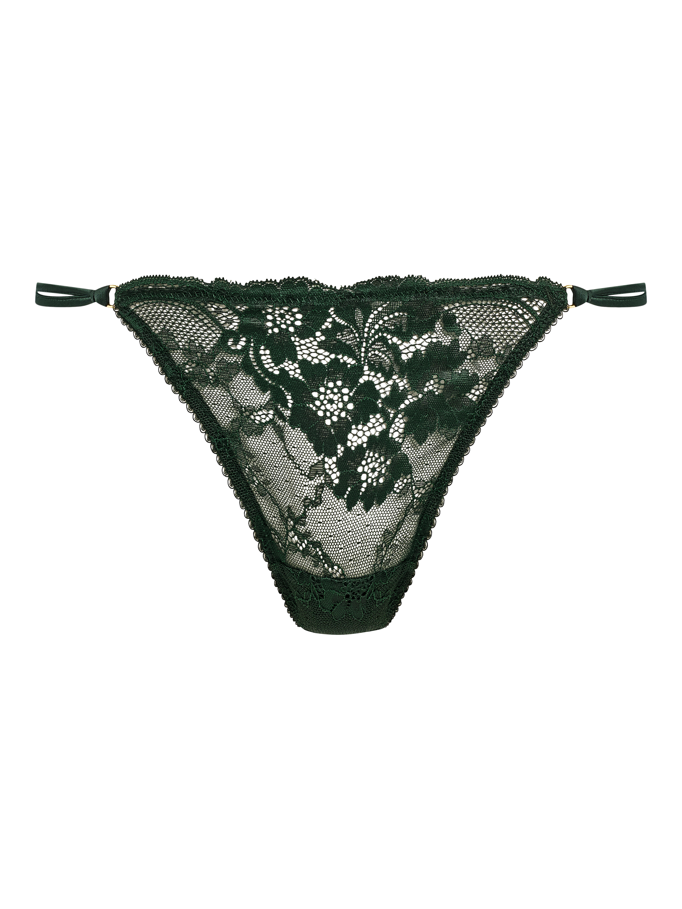 Natsuki lace styles feature delicate matte stretch lace with luxurious satin accents. The tanga has a stretch lace front and sheer fine elastic along the inside front waist to maintain fit. Low-rise waist with minimal back coverage and centre back triangular cut out detail featuring satin binding. Stretch satin double rouleau spaghetti at sides with ring detail at side fronts and charm detail at centre back completes the look.