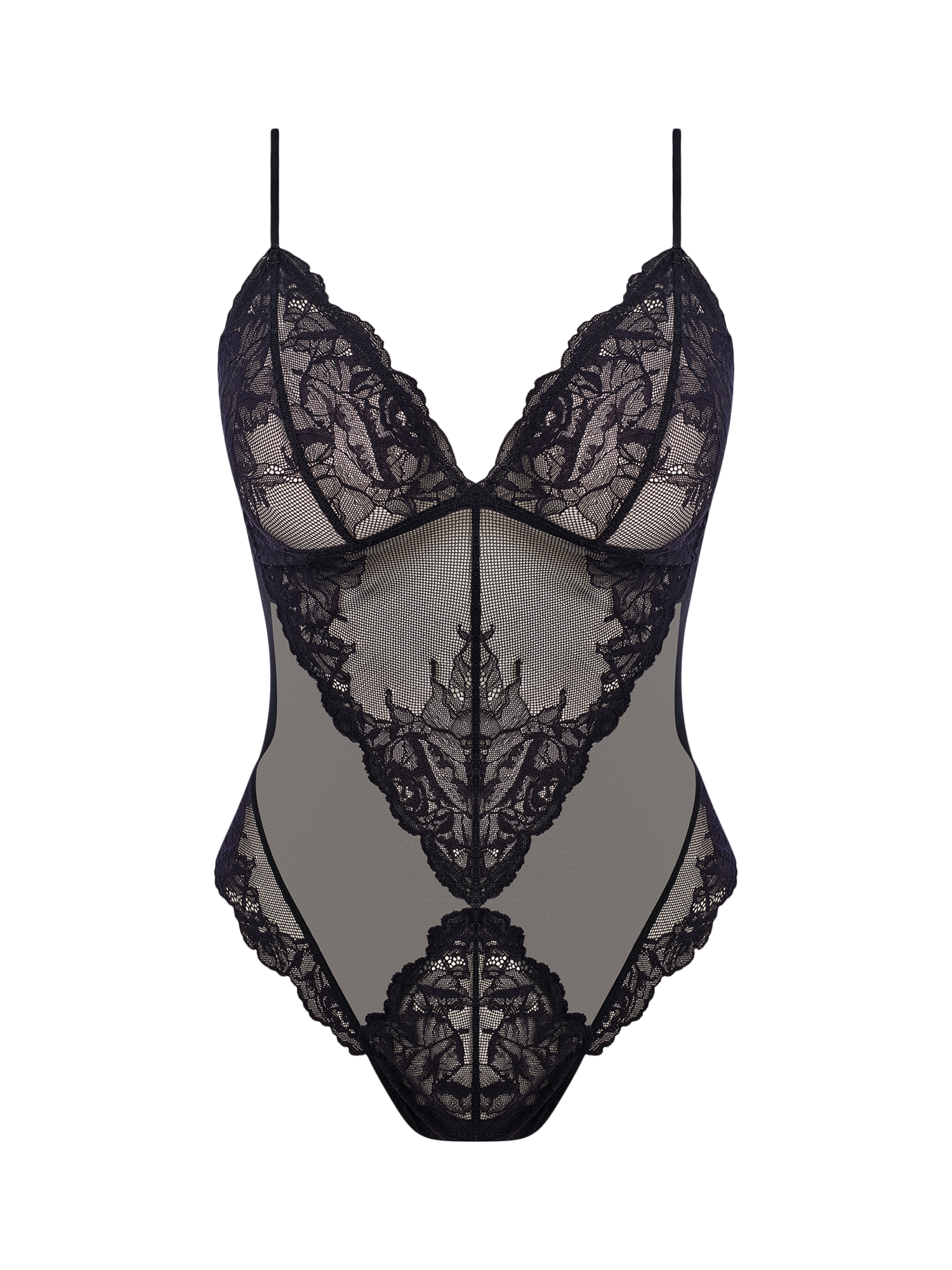 Vivid Attraction features a stretch lace with a striking floral motif on a sheer net ground. The all-lace body is a stand-out style and perfect for under a jacket for the intimates as outerwear trend. Fully adjustable straps for a customized fit, thong back and cotton gusset with no hook and eye fastening.