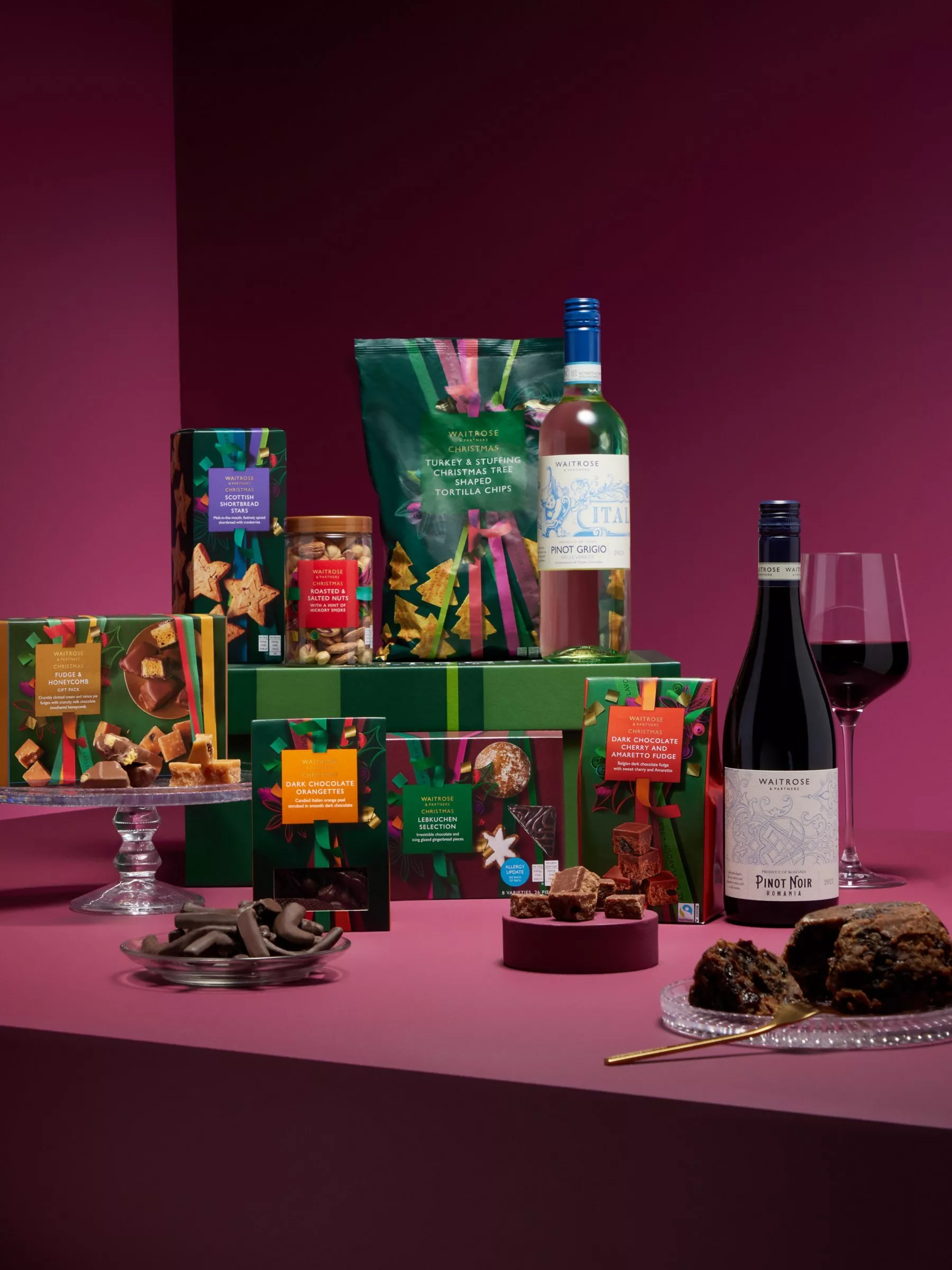 - Waitrose Christmas Lebkuchen Selection 300gWaitrose Richly Fruited Christmas Pudding 400gWaitrose Christmas Dark Chocolate Orangettes 175gWaitrose Christmas Roasted Salted Nuts with Hickory 210gWaitrose Chocolate, Cherry & Amaretto Fudge 130gWaitrose Fudge & Honeycomb Selection Box 260gWaitrose Christmas Turkey & Stuffing Tortilla ShapedChristmas Trees 200gWaitrose Pinot Grigio Veneto Italy (Blueprint) 75clWaitrose Romanian Pinot Noir (Blueprint) 75clWaitrose Christmas Shortbread Stars 130g