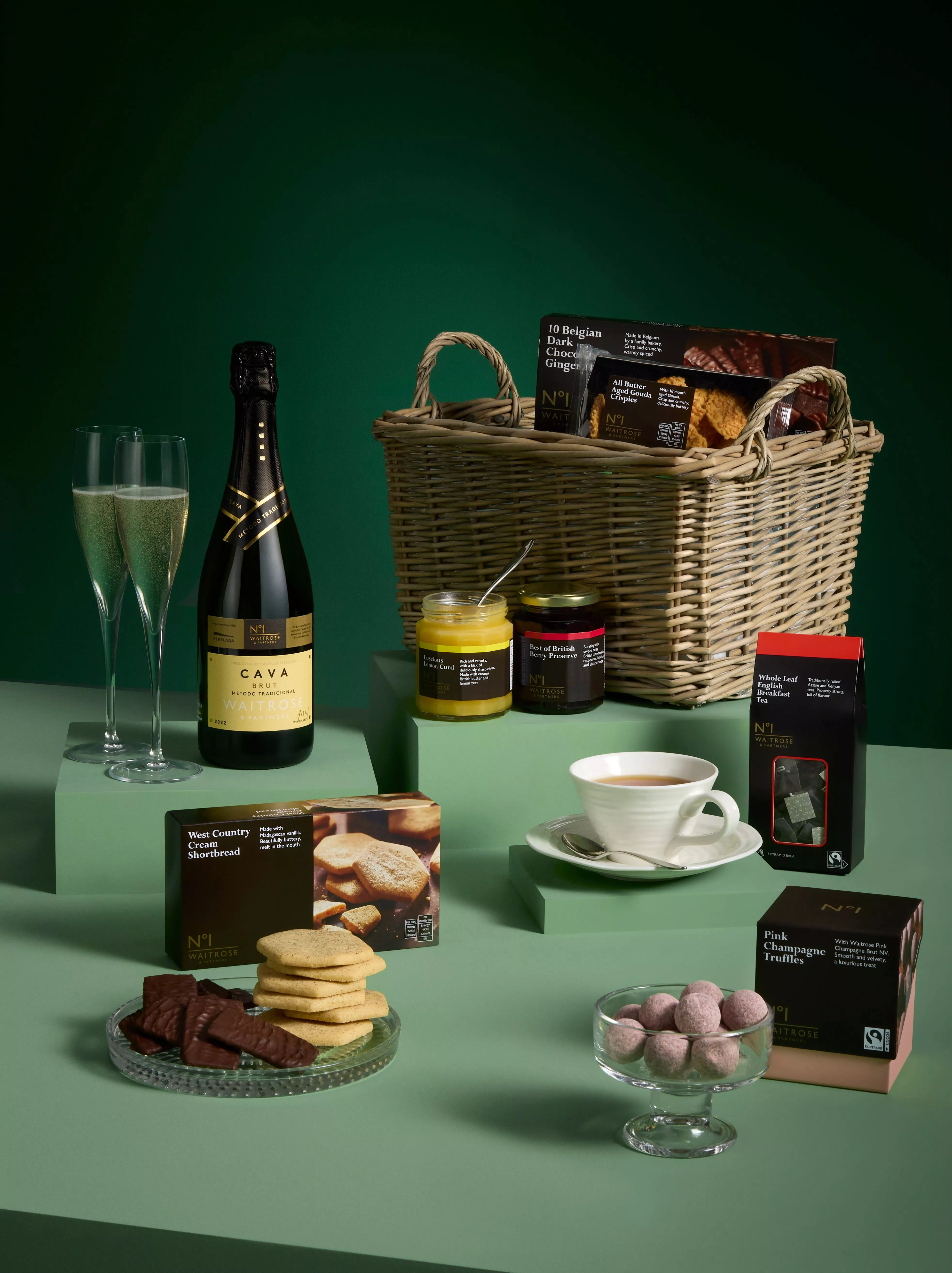 - Waitrose No1 English Breakfast Tea 15 Teabags 50gWaitrose No.1 All Butter Aged Gouda Crispies 75gWaitrose No 1 Dark Chocolate Ginger Thins 100gWaitrose No.1 Pink Champagne Truffles 120gWaitrose No.1 West Country Cream Shortbread 160gWaitrose No1 Luscious Lemon Curd 320gWaitrose No.1 Best of British Berry Jam 320gWaitrose No 1 Cava Brut 75cl