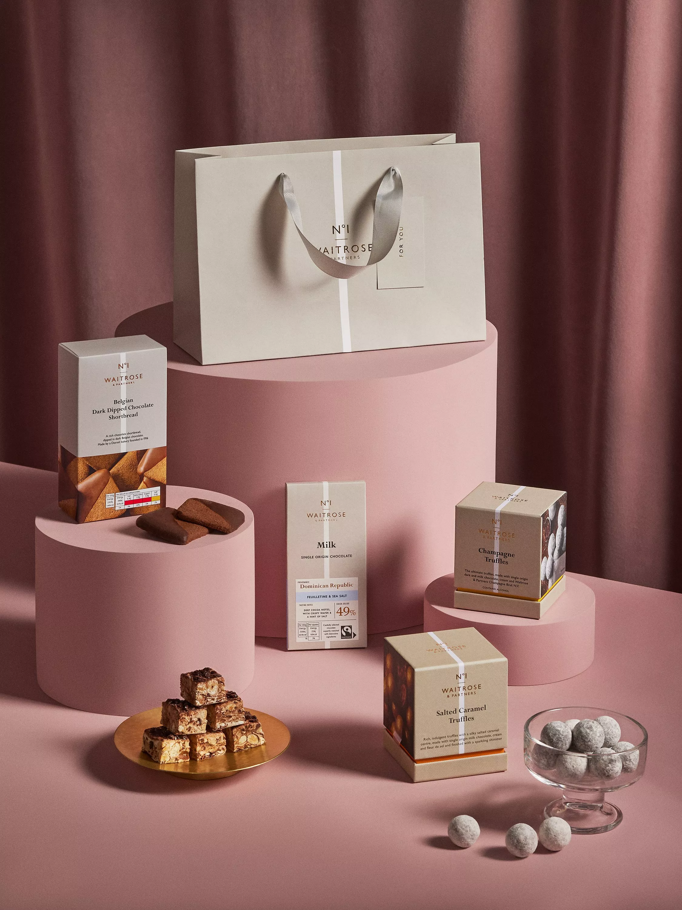 - Waitrose No 1 Belgian Dark Dipped Chocolate Shortbread 135g Waitrose No 1 Champagne Truffles 120g Waitrose No 1 Milk Chocolate Bar with Feuillentine & Salt 100g Waitrose No 1 Salted Caramel Truffles 120g Waitrose No 1 Dark Chocolate Hazelnut Nougat 100g