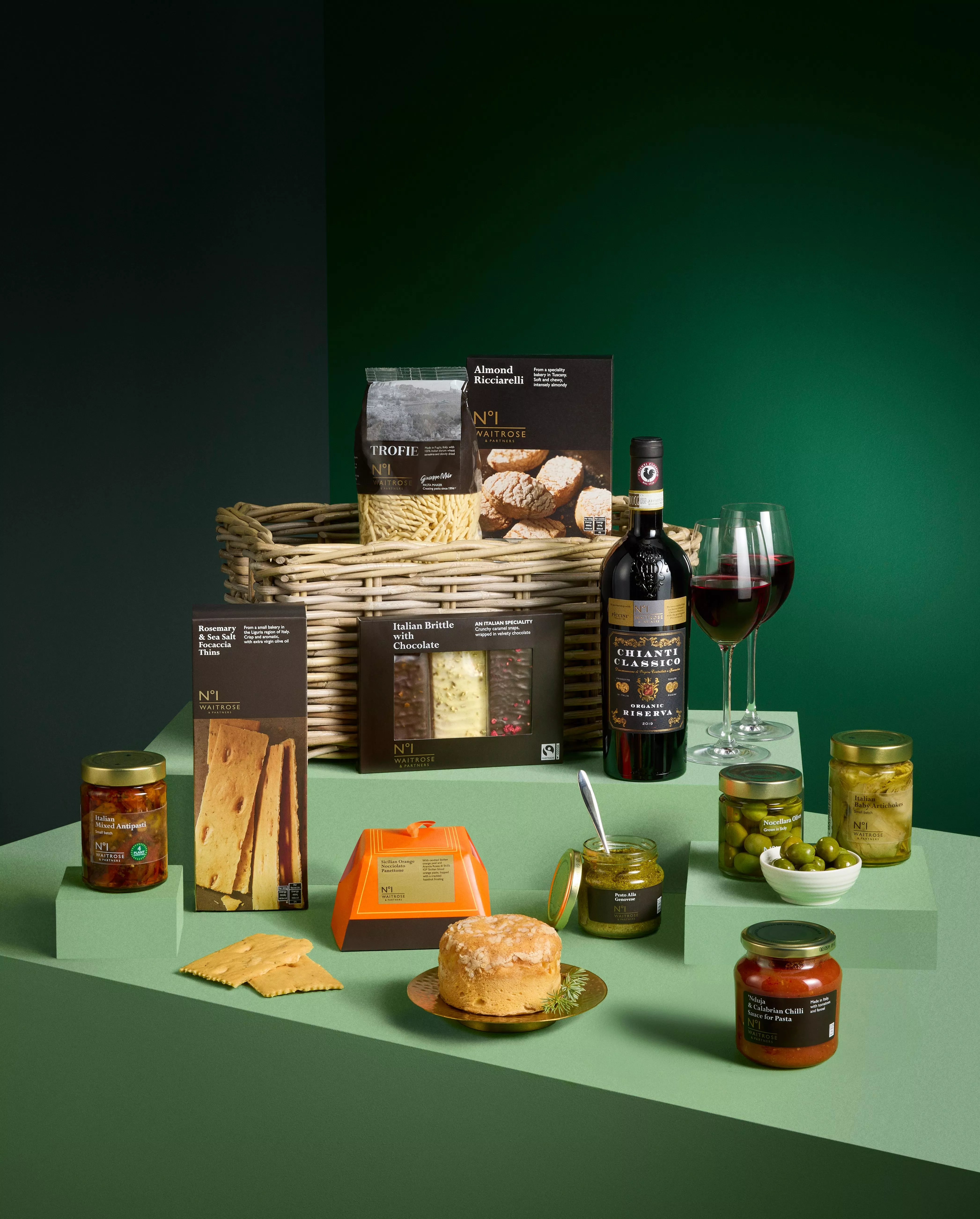 - Waitrose No.1 Mini Sicilian Orange Nocciolate Panettone 100gWaitrose No.1 Nocellara Olives 200gWaitrose No 1 Italian Brittle with Chocolate 120gWaitrose No.1 Rosemary & Sea Salt Focaccia Thins 150gWaitrose No.1 Almond Ricciarelli Biscuits 180gWaitrose No.1 Pesto Alla Genovese 190gWaitrose No.1 'Nduja & Calabrian Chilli Sauce for Pasta 290gWaitrose No1 Italian Baby Artichokes 290gWaitrose No1 Italian Mixed Vegetable Antipasti 290gWaitrose No.1 Trofie Pasta 500gWaitrose No.1 Chianti Classico Riserva 75cl