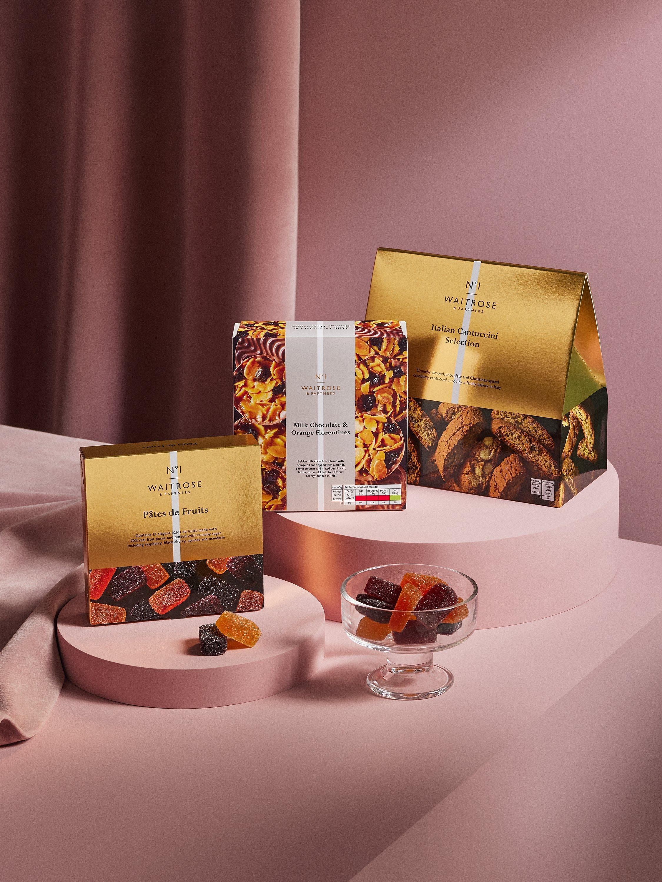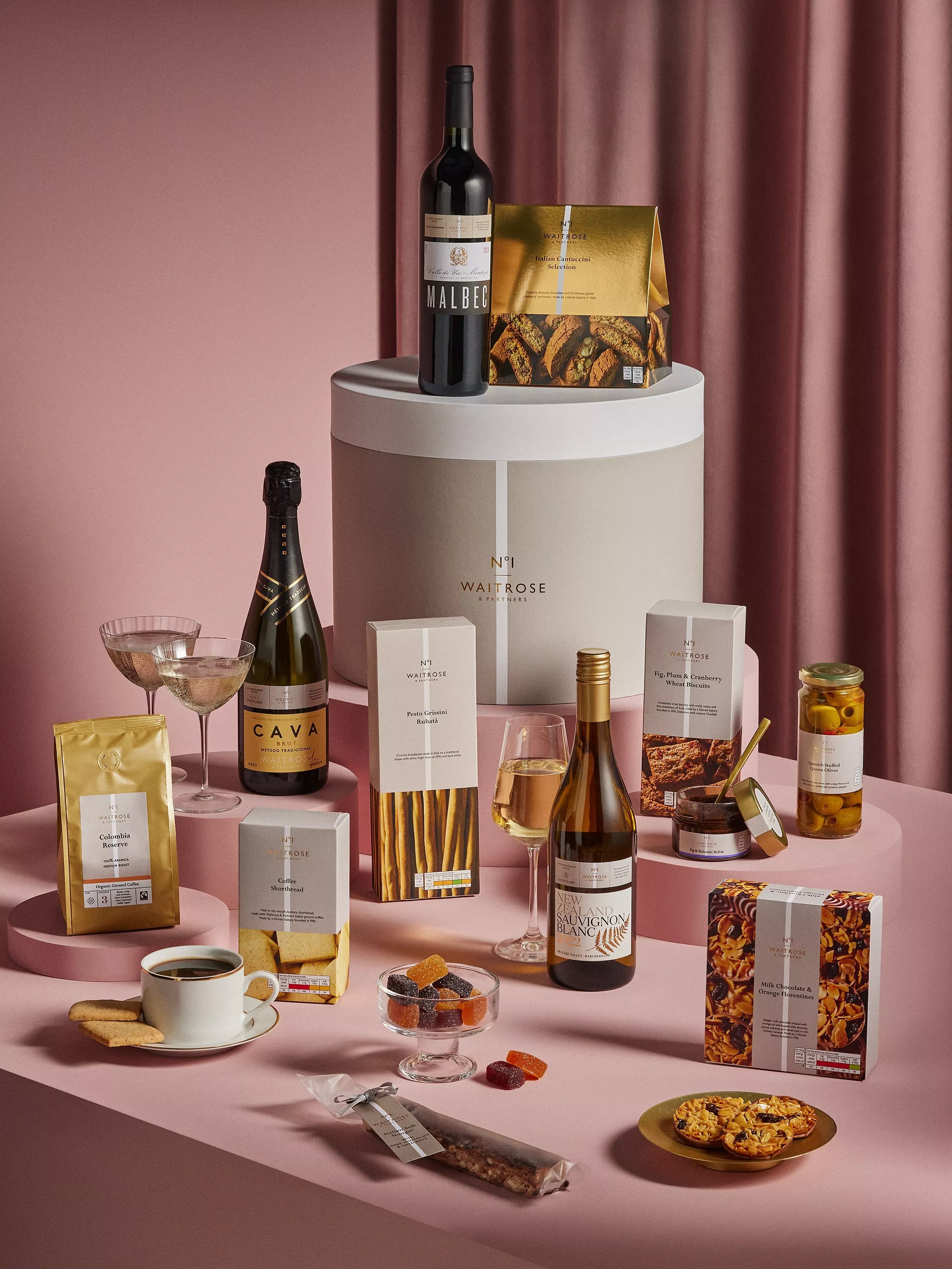 - Waitrose No 1 Italian Cantuccini Selection 240g Waitrose No 1 Malbec 75cl Waitrose Cava Brut Castillo Perelada 75cl Waitrose Astrolabe Awatere Sauvignon Blanc 75cl Waitrose No 1 Coffee Shortbread 135g Waitrose No 1 Milk Chocolate & Orange Florentines 150g Waitrose No 1 Fig & Balsamic Relish 140g Waitrose No 1 Organic Colombian Reserve Ground Coffee 227g Waitrose No 1 Dark Chocolate Hazelnut Nougat 100g Waitrose No 1 Pates de Fruits 120g Waitrose No 1 Spanish Stuffed Queen Olives 340g Waitrose No 1 Fig Plum & Cranberry Wheat Biscuits 130g Waitrose No 1 Pesto Grissini Rubata 140g