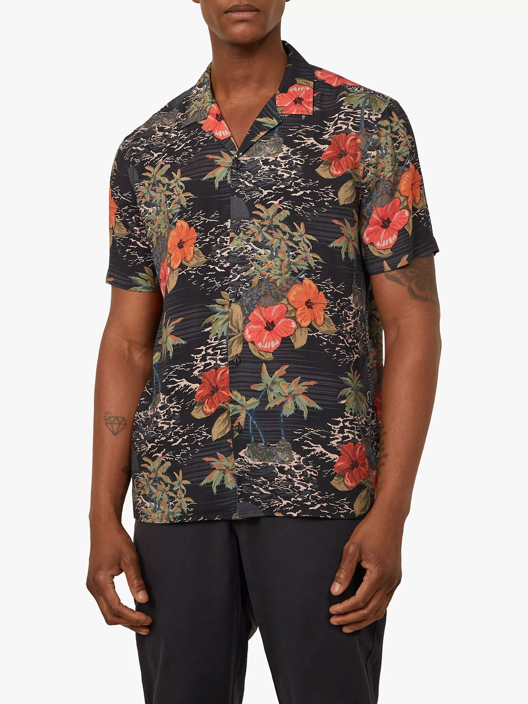 Build upon your summer looks in an iconic style from British fashion favourites Warehouse. A laid back alternative to your usual shirting, this one's all about the hours after the 9-5. Unashamedly relaxed, yet no less sophisticated than a traditional button-down, this shirt is framed by a Cuban collar and short sleeve cut. Finished in a vibrant Hawaiian print decoration, this top is destined for slim chino shorts and espadrille combinations.