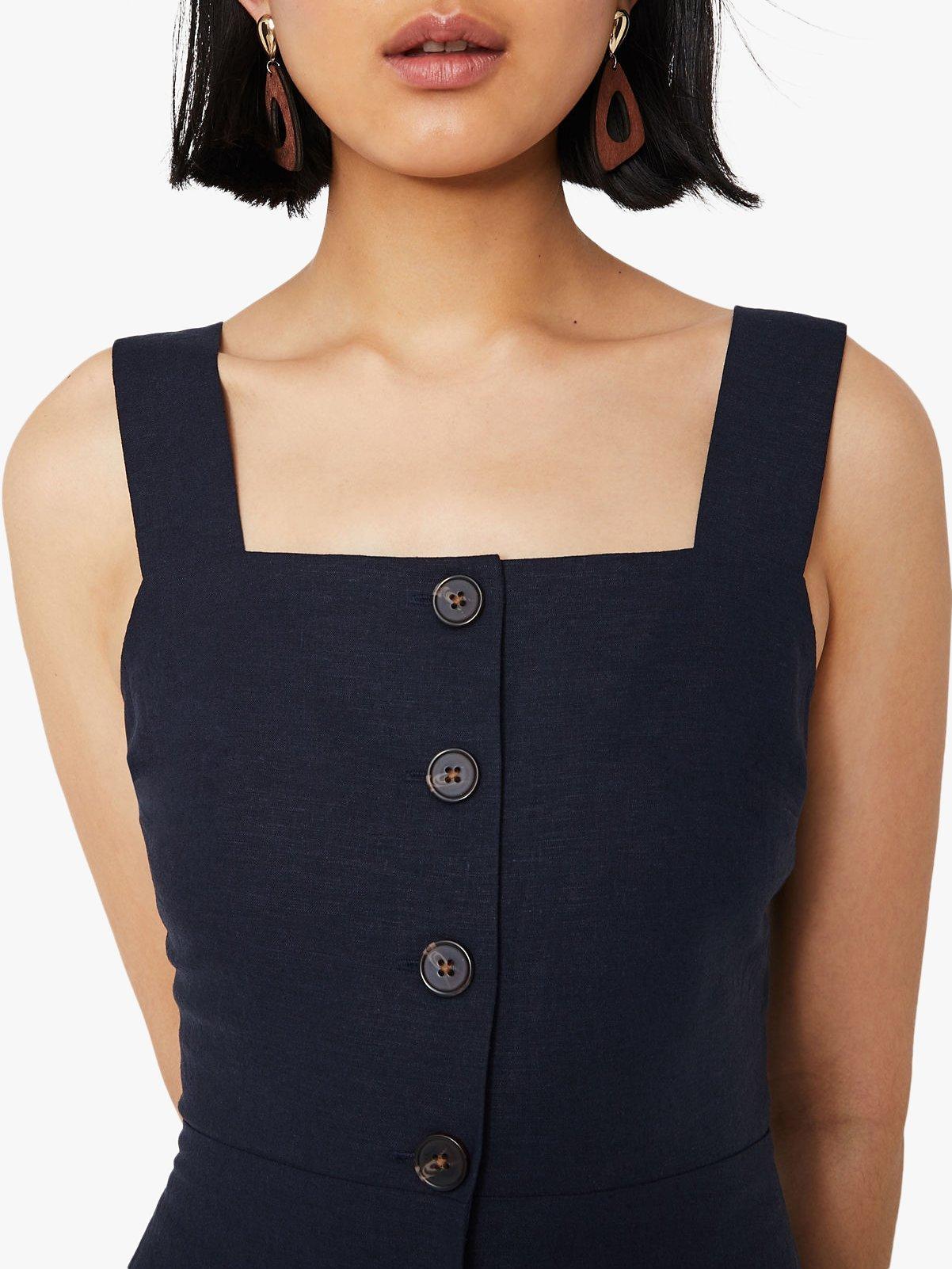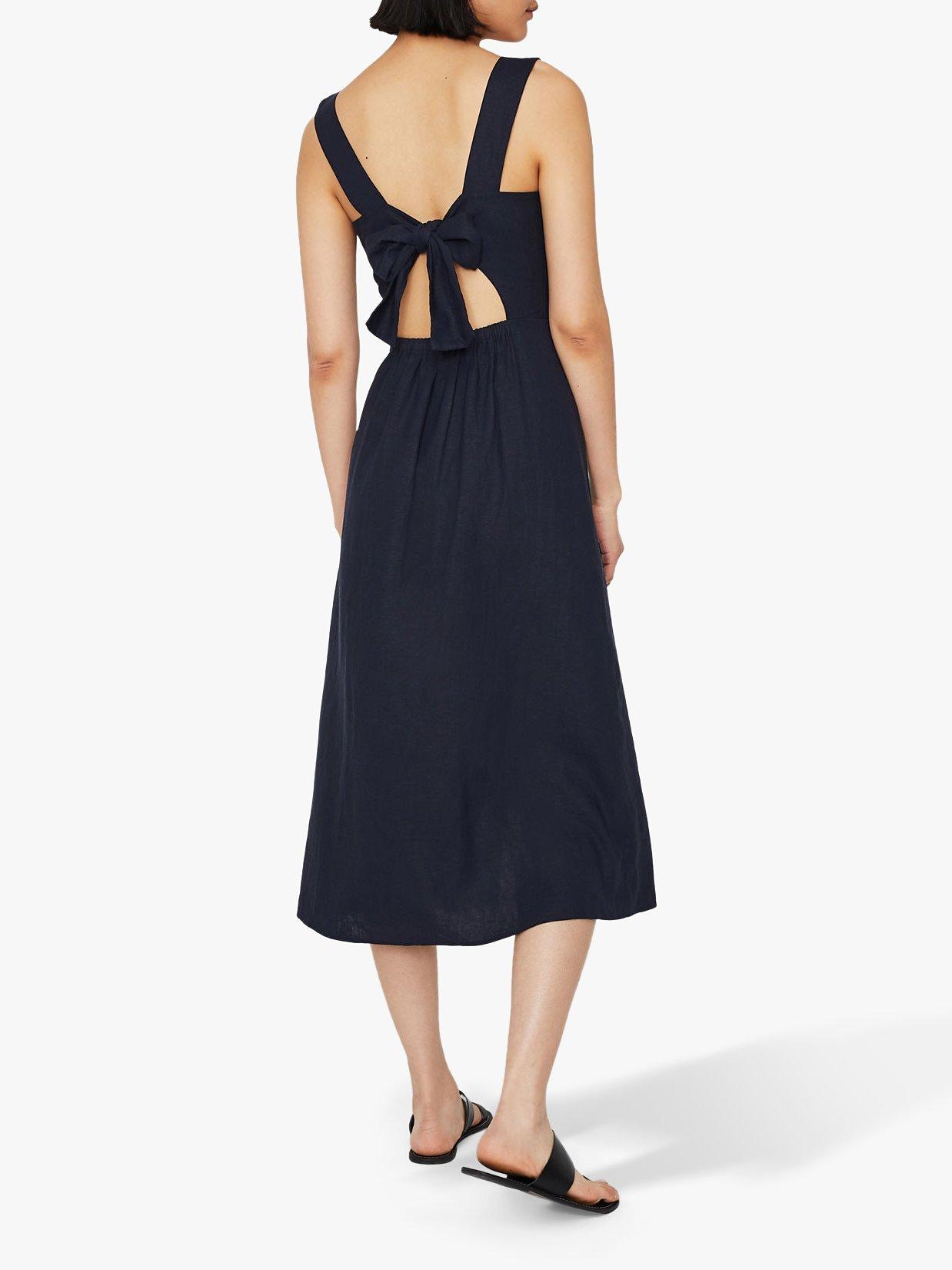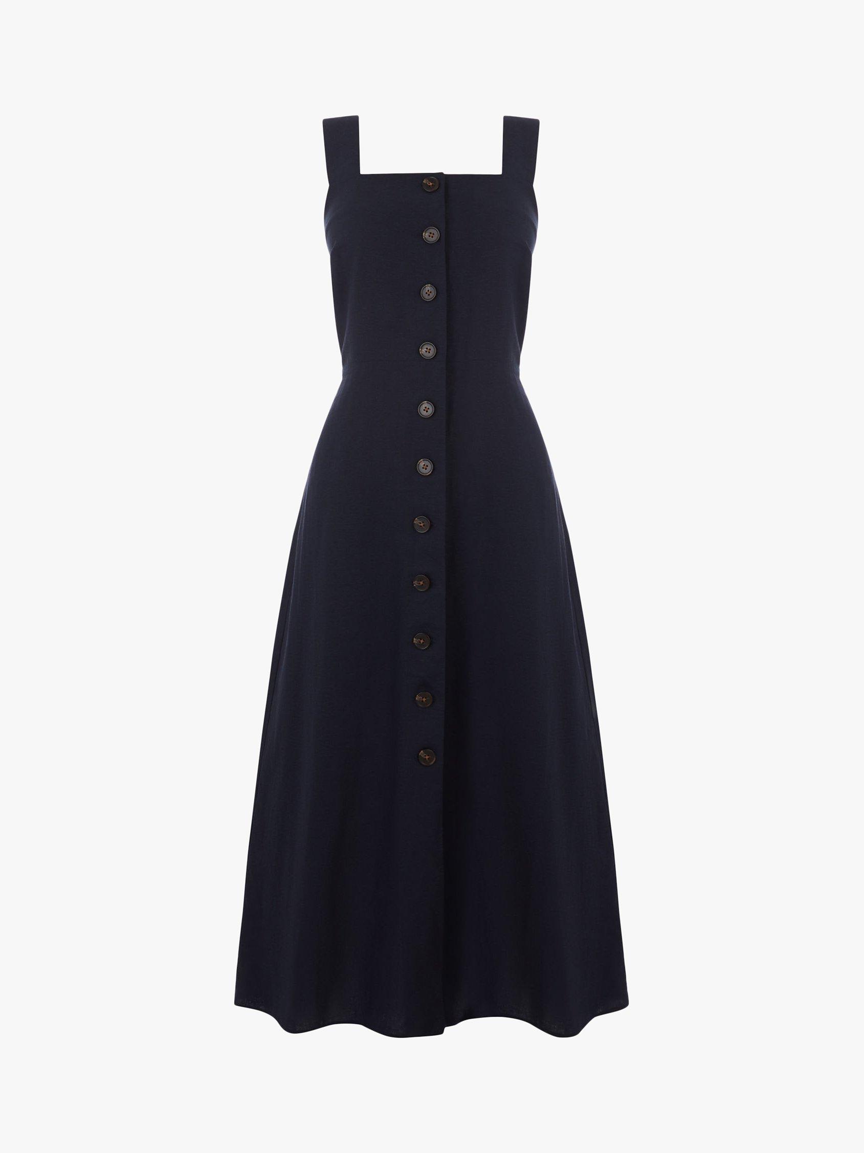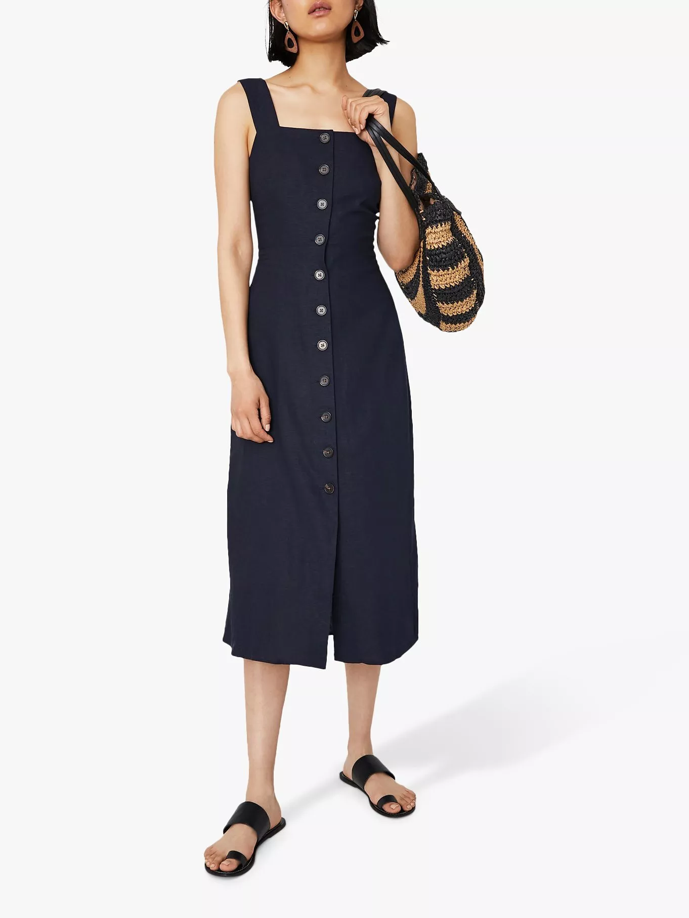 Styled with a button through front, this midi-length dress is a framed by a square neckline and finished with a feminine tie back detailing.
