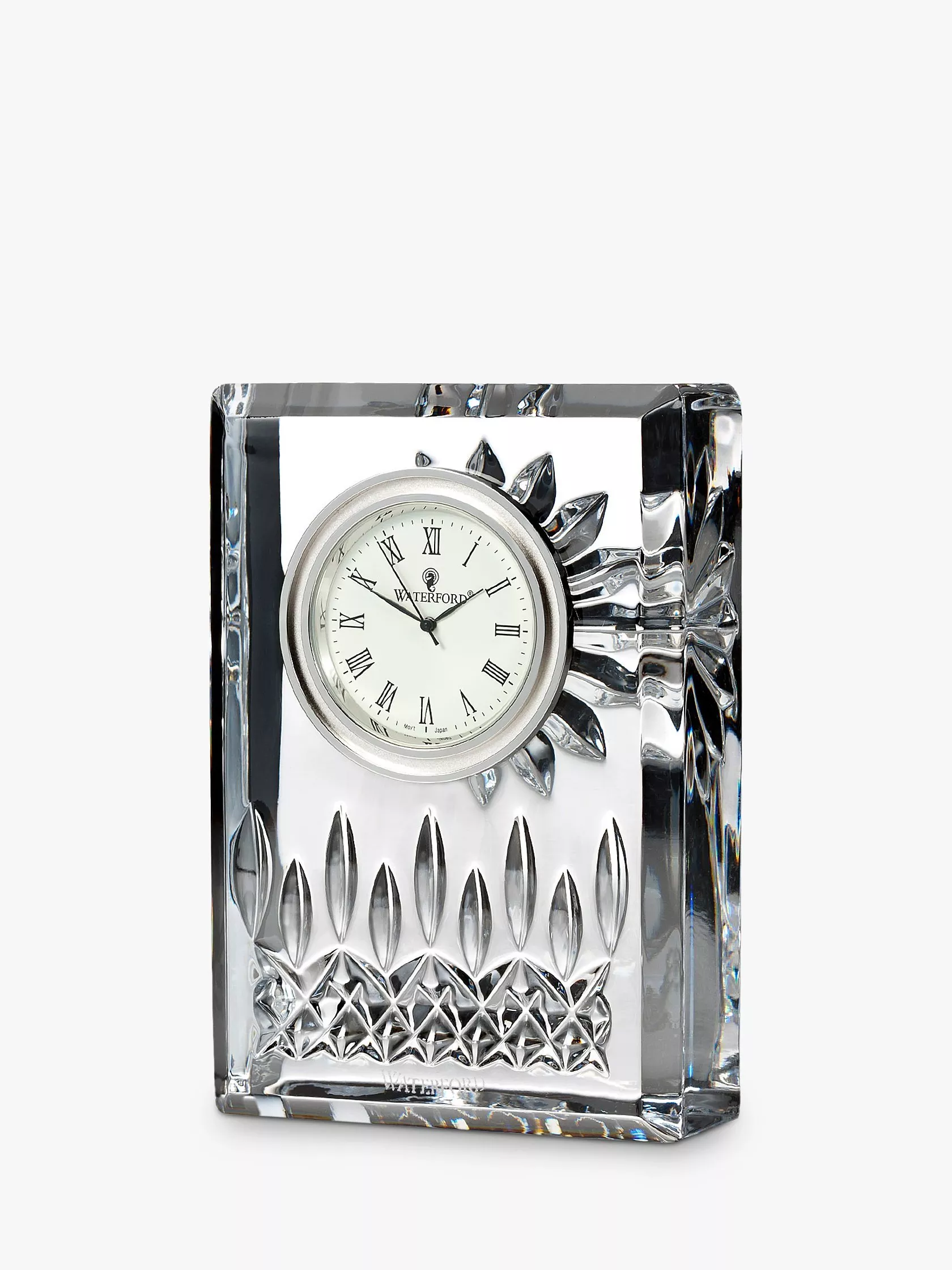 Featuring the stunning Lismore pattern, this Waterford clock is handcrafted from crystal intricately decorated with the signature diamond and wedge cuts. This elegant decoration is carried through to the cream clockface with Roman numerals and brass finish.