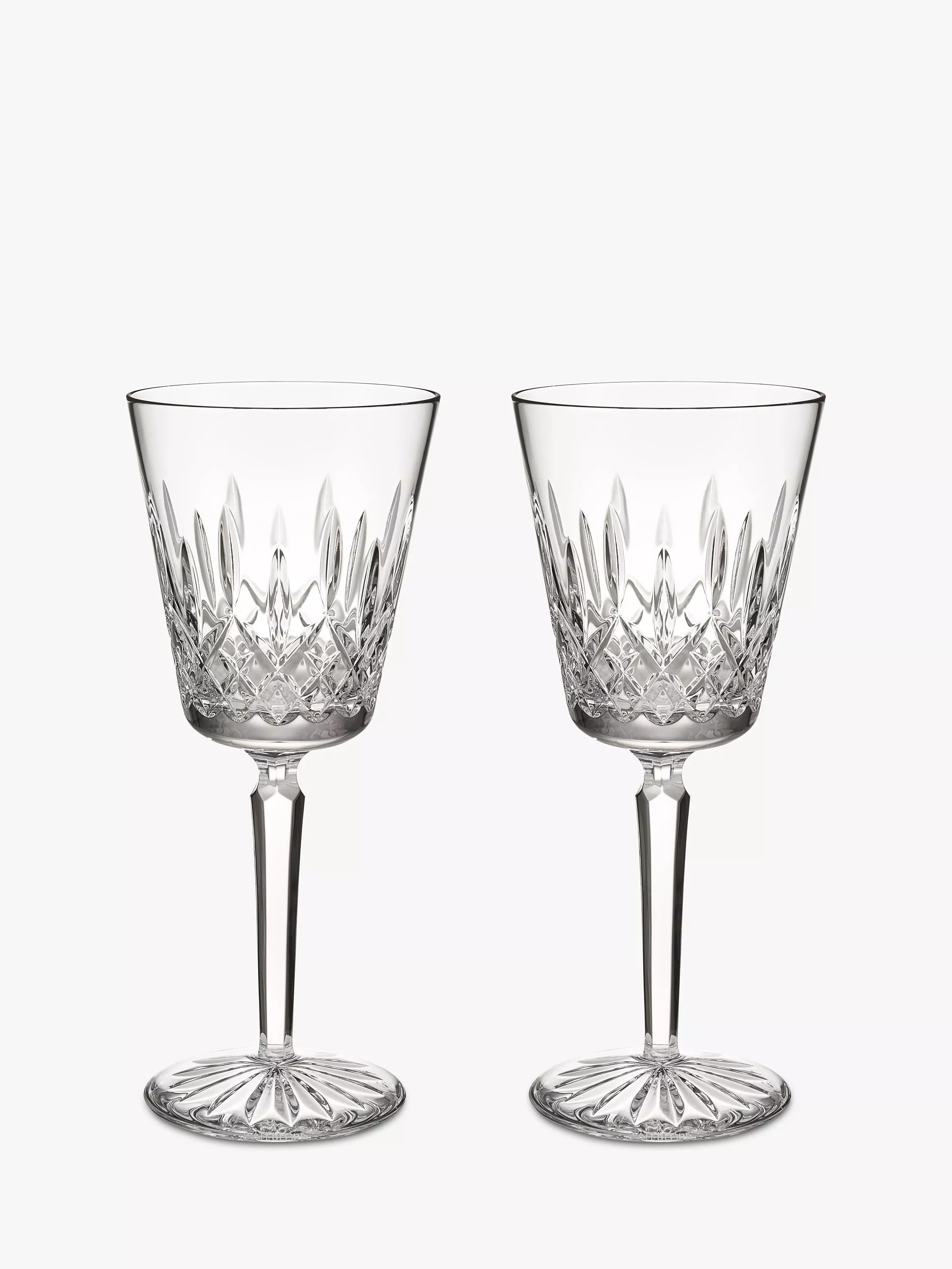 A pair of tall wine glasses from the Lismore collection by Waterford Crystal. The cut crystal glass enhances the colour, clarity and enjoyment of both fine red and white wines.