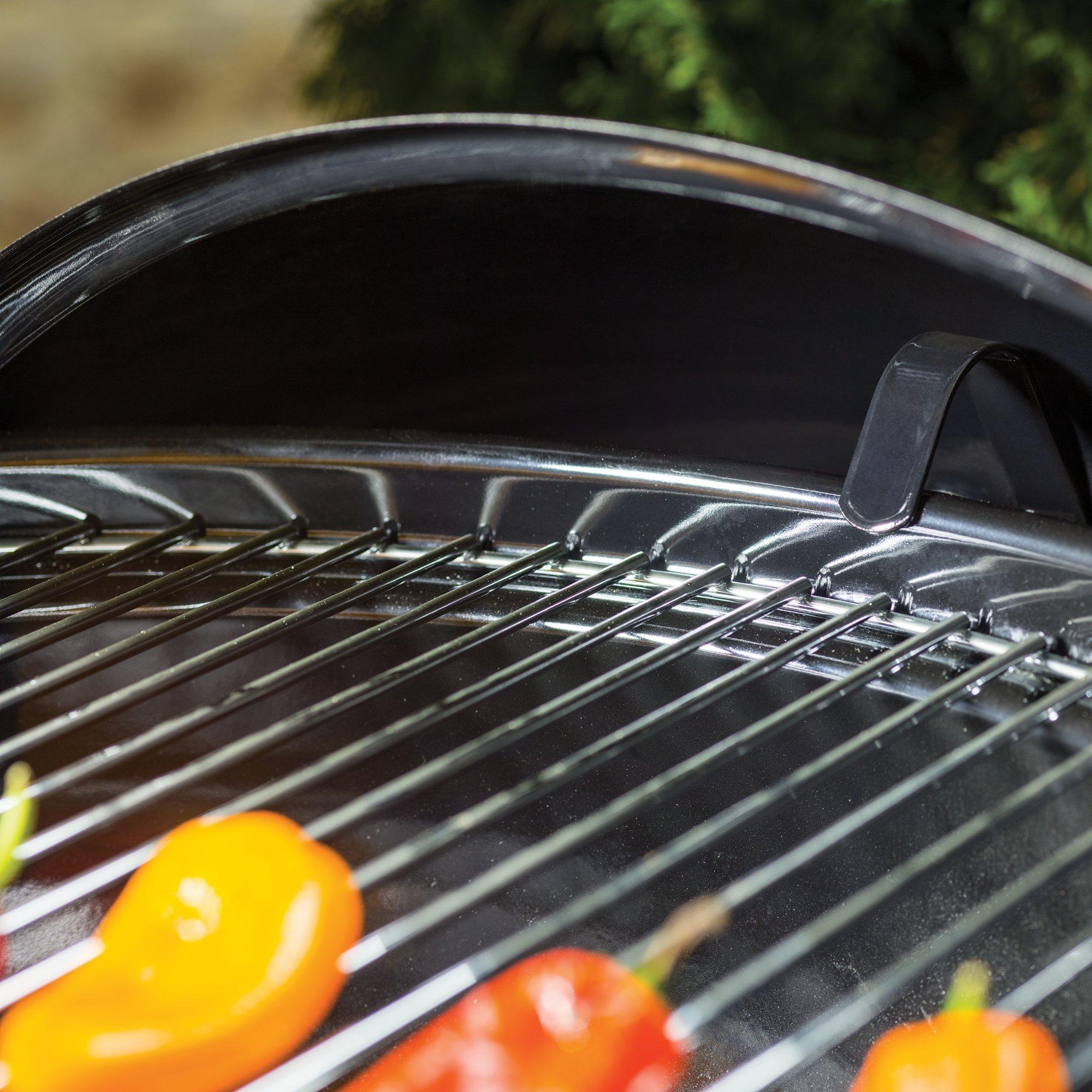 - Porcelain enamel body, plated steel cooking grate