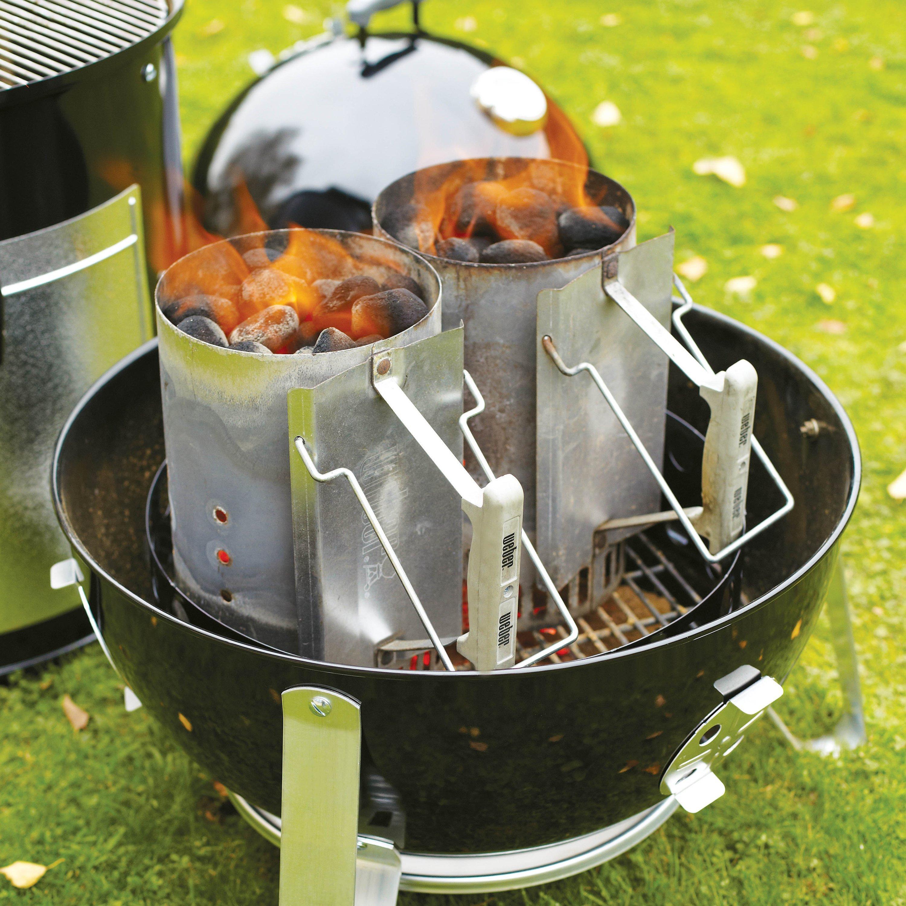 The chimney starter speeds up the heating time of coals so that you can get your charcoal barbecue cooking sooner. The large capacity will hold enough briquettes for a 57cm diameter kettle grill. It works best with Weber lighter cubes.