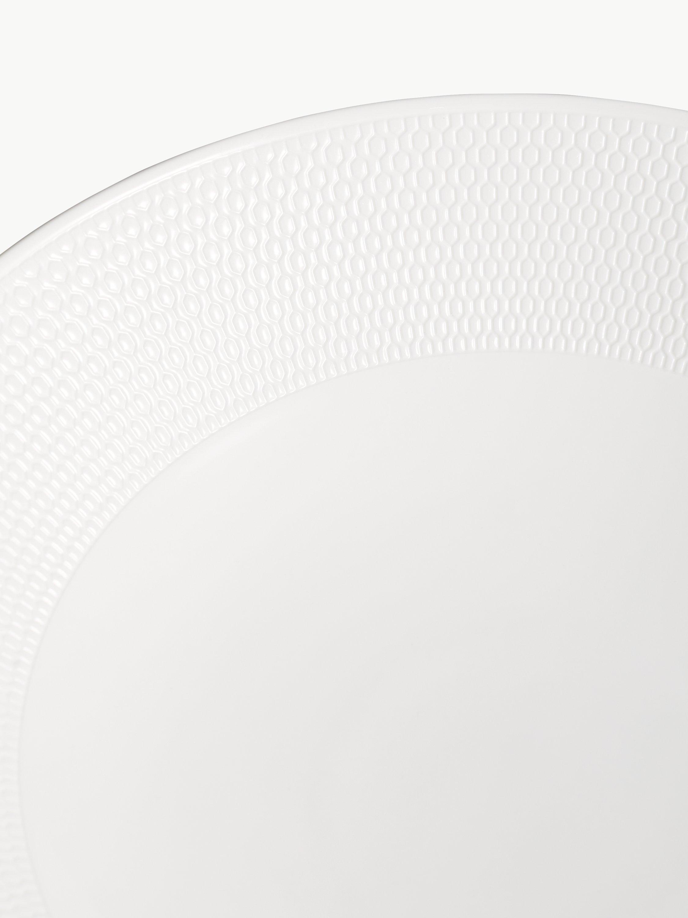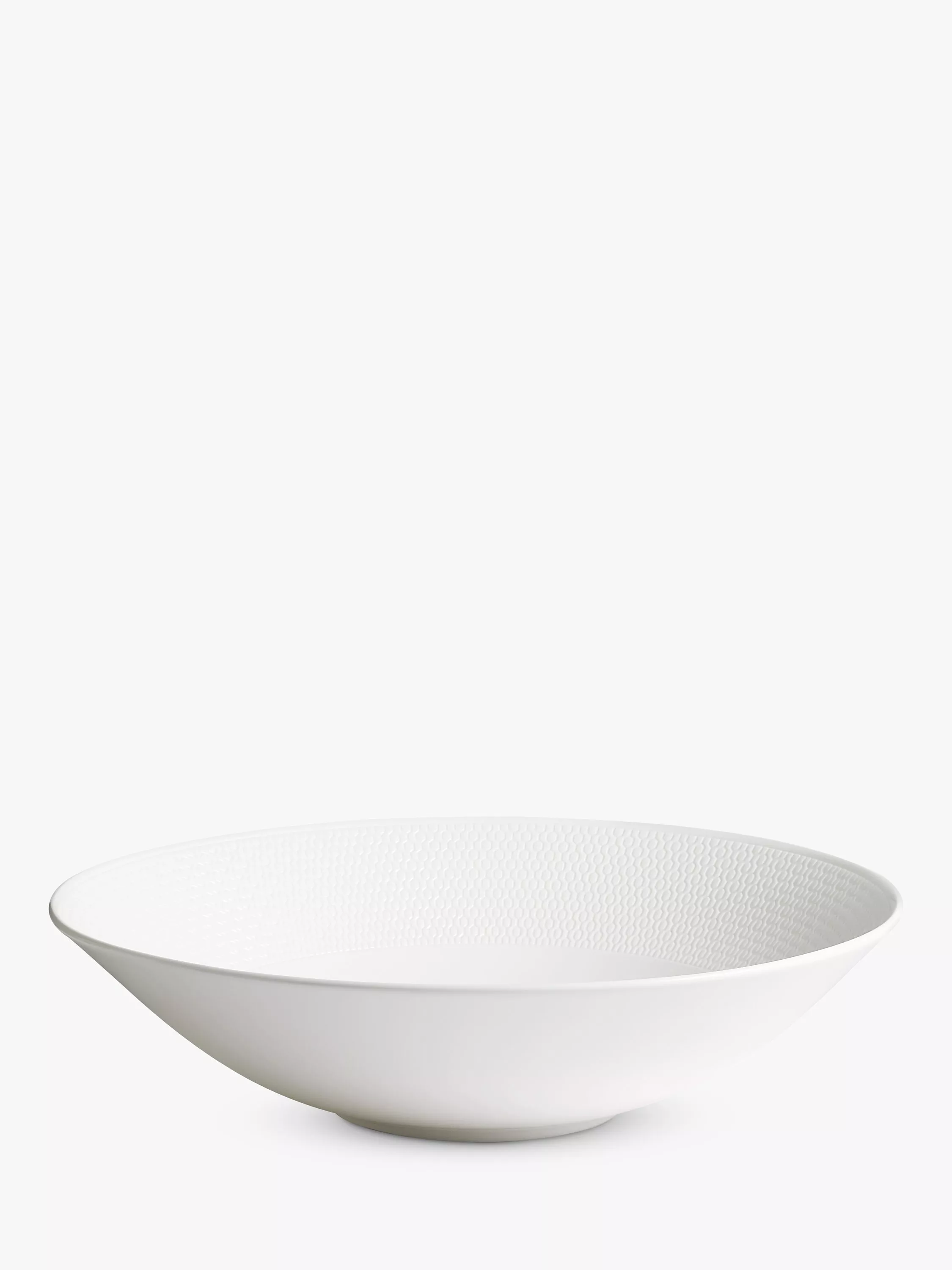 Large serving bowl from the Wedgwood Gio collection crafted from stylish white, fine bone china. Each piece features an Intaglio texture carefully created with the design sunk into the surface. Clean and contemporary, the tableware is microwave-safe and dishwasher-safe, although washing by hand is recommended. Designed to mix and layer with other Wedgwood collections.