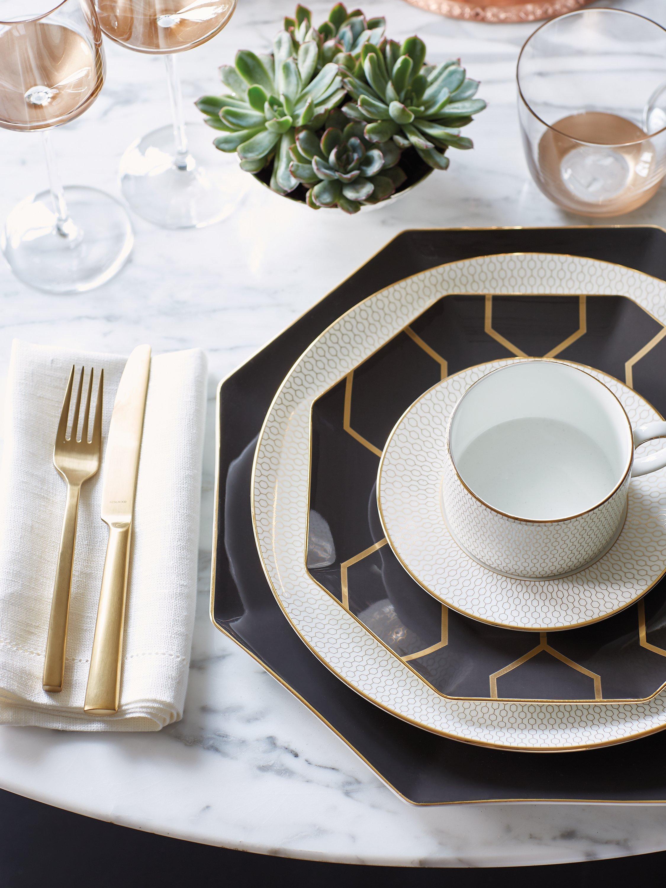 A decorative four-piece dinnerware set from Wedgwood's Gio Gold range of tableware. The Gio Gold fine bone china range features opulent metallic accents and Arabian-influenced geometric patterns, creating a luxurious look for morning coffee, afternoon tea or dinner parties.