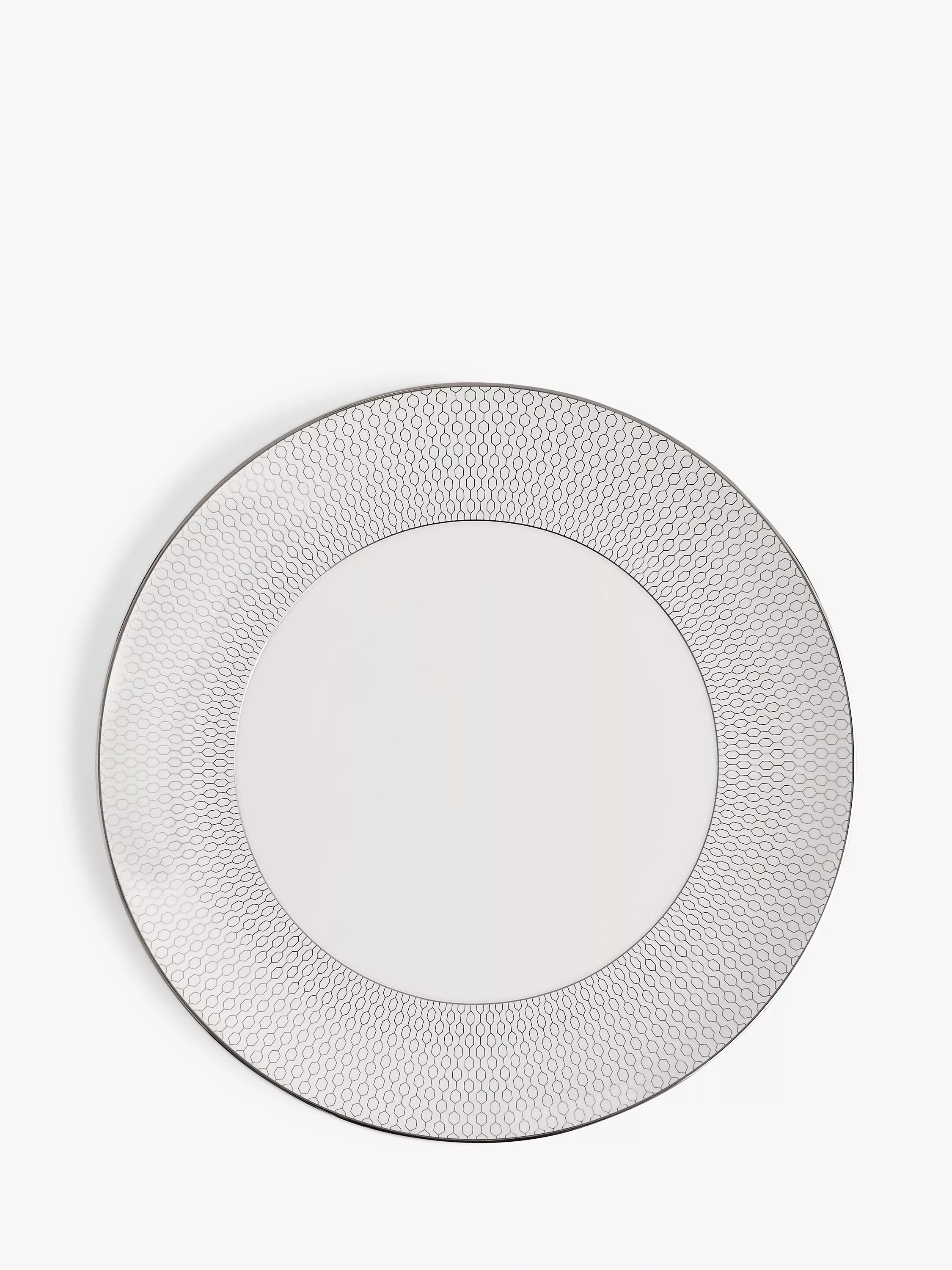 Wedgwood Gio Platinum tableware features a metallic geometric pattern on white fine bone china. This dinner plate from the range is a contemporary design that's dishwasher safe for easy cleaning. Mix and layer with other Wedgwood collections to refresh your tableware.