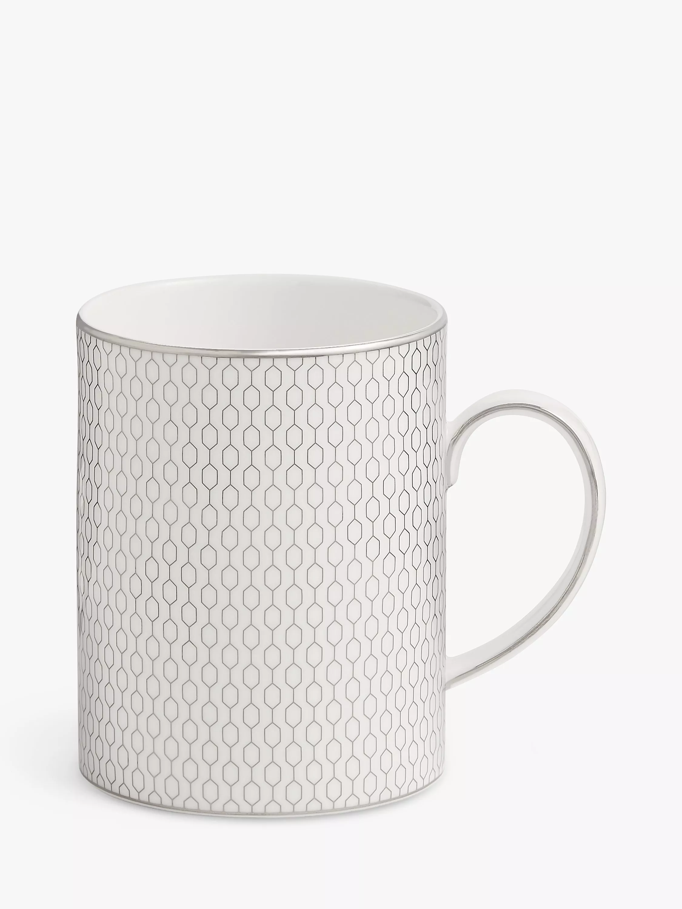 Wedgwood Gio Platinum tableware features a metallic geometric pattern on white fine bone china. This mug from the range is a contemporary design that's dishwasher safe for easy cleaning. Mix and layer with other Wedgwood collections to refresh your tableware.