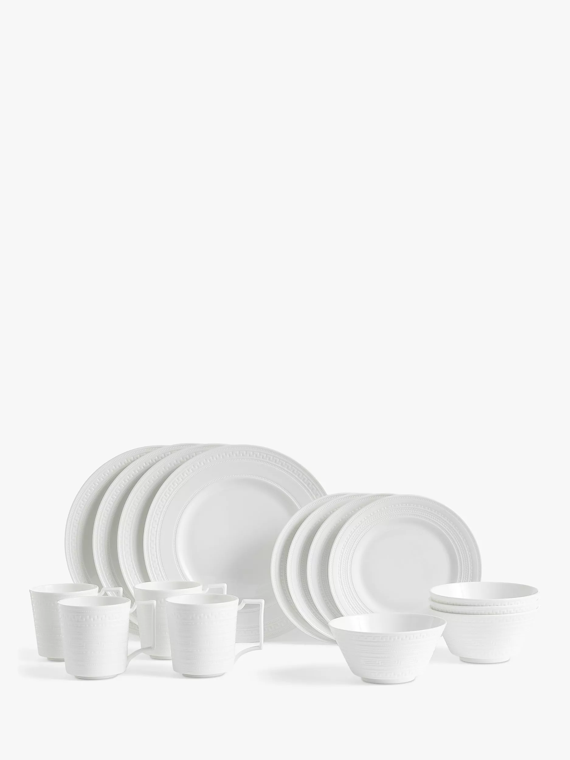 16-piece dinnerware set from the Wedgwood Intaglio collection crafted from stylish white, fine bone china. Each piece features an embossed pattern reminiscent of designs from ancient Rome and Greece, for a classic feel with a modern geometric edge. The range is clean and contemporary and both dishwasher and microwave-safe. Mix and layer with other Wedgwood collections.
