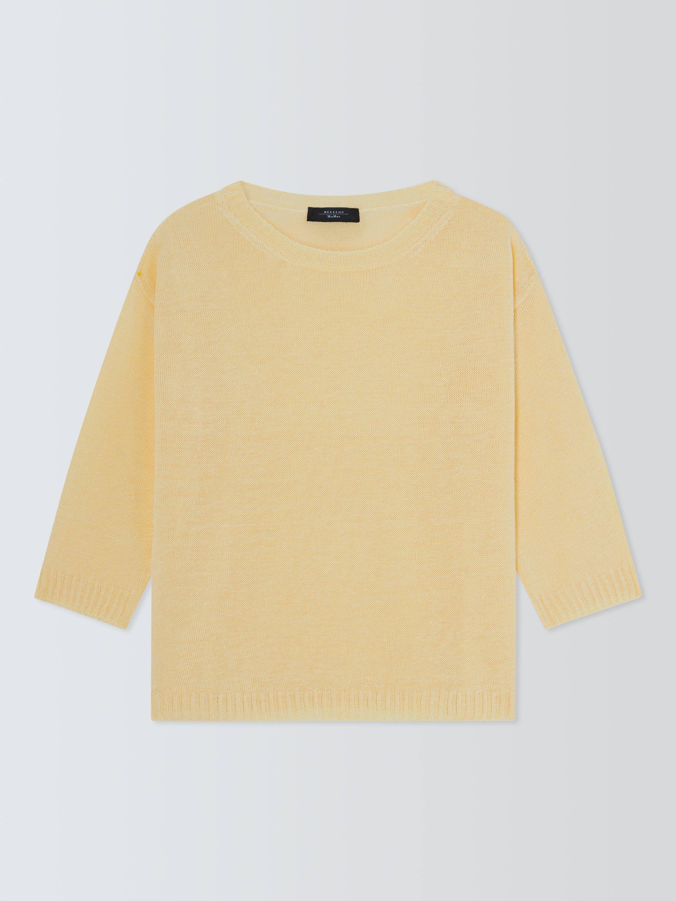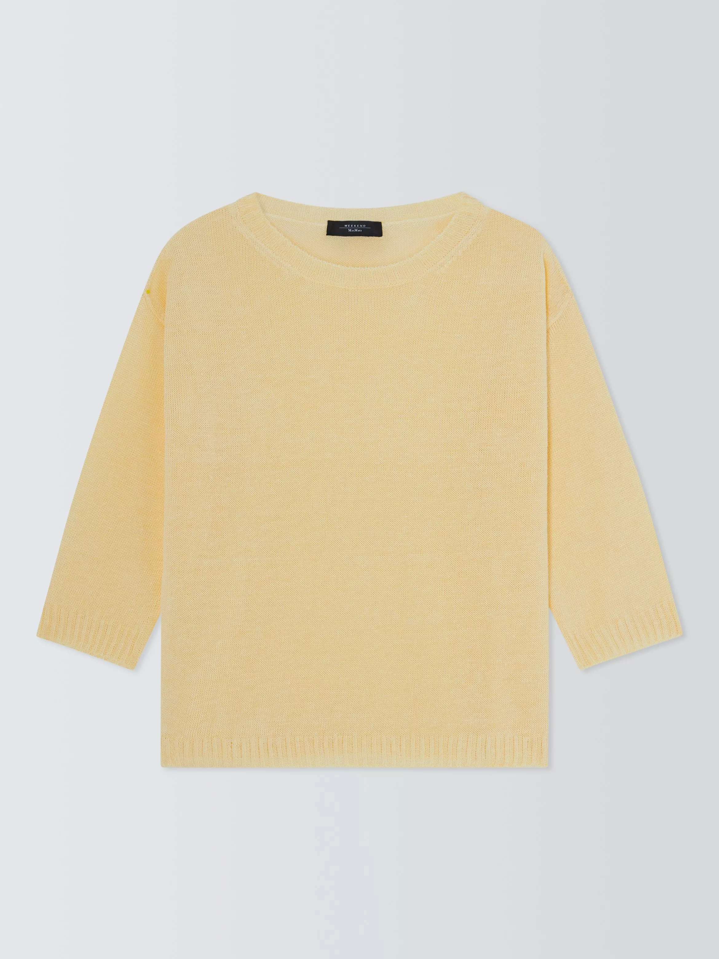 Short jumper with a relaxed, oversized fit, knitted entirely in stocking stitch. Made of breathable linen, it features a boat neckline, ribbed trims and low-set three-quarter sleeves.