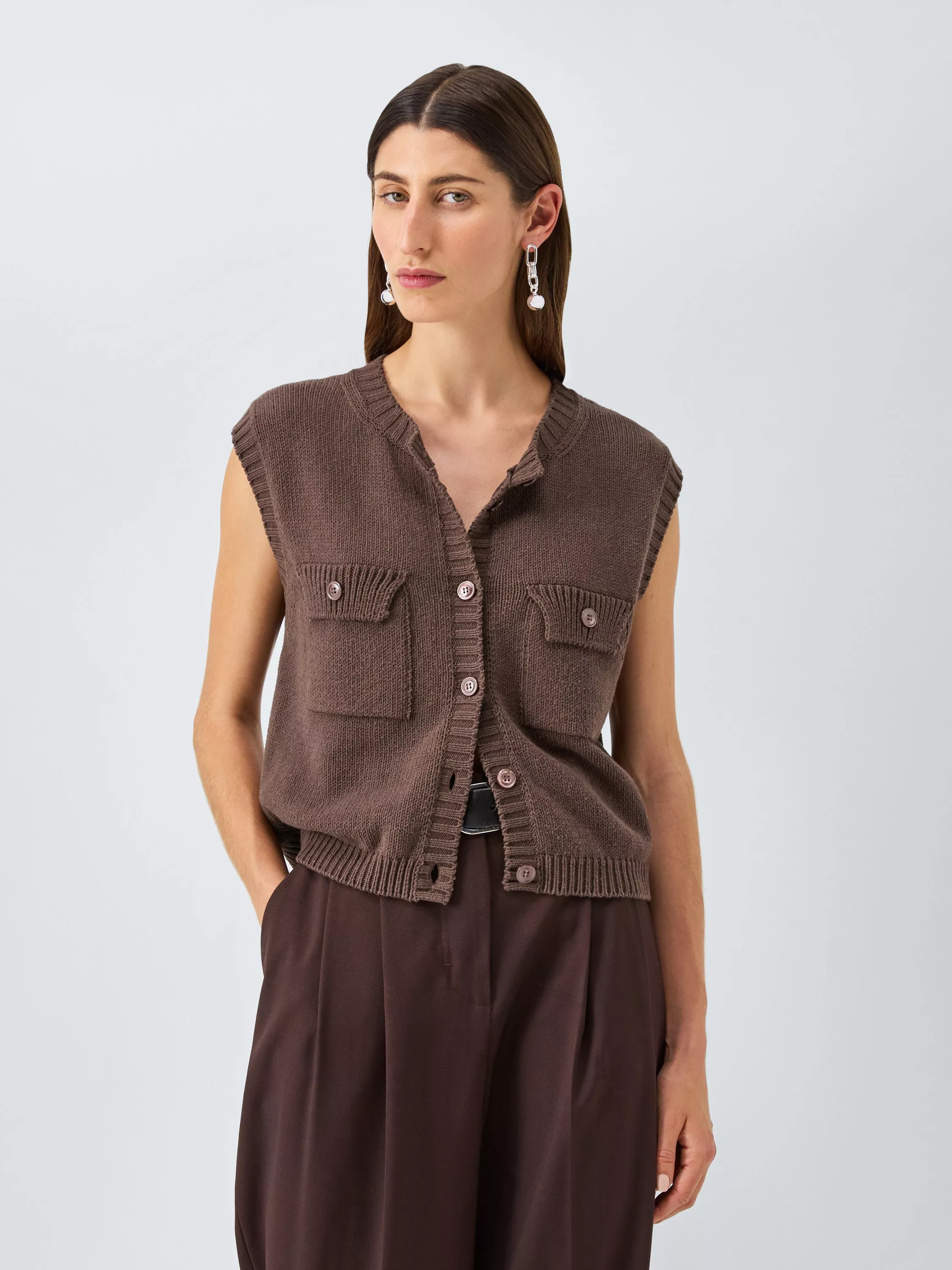 Knitted gilet featuring patch breast pockets and mother-of-pearl buttons.