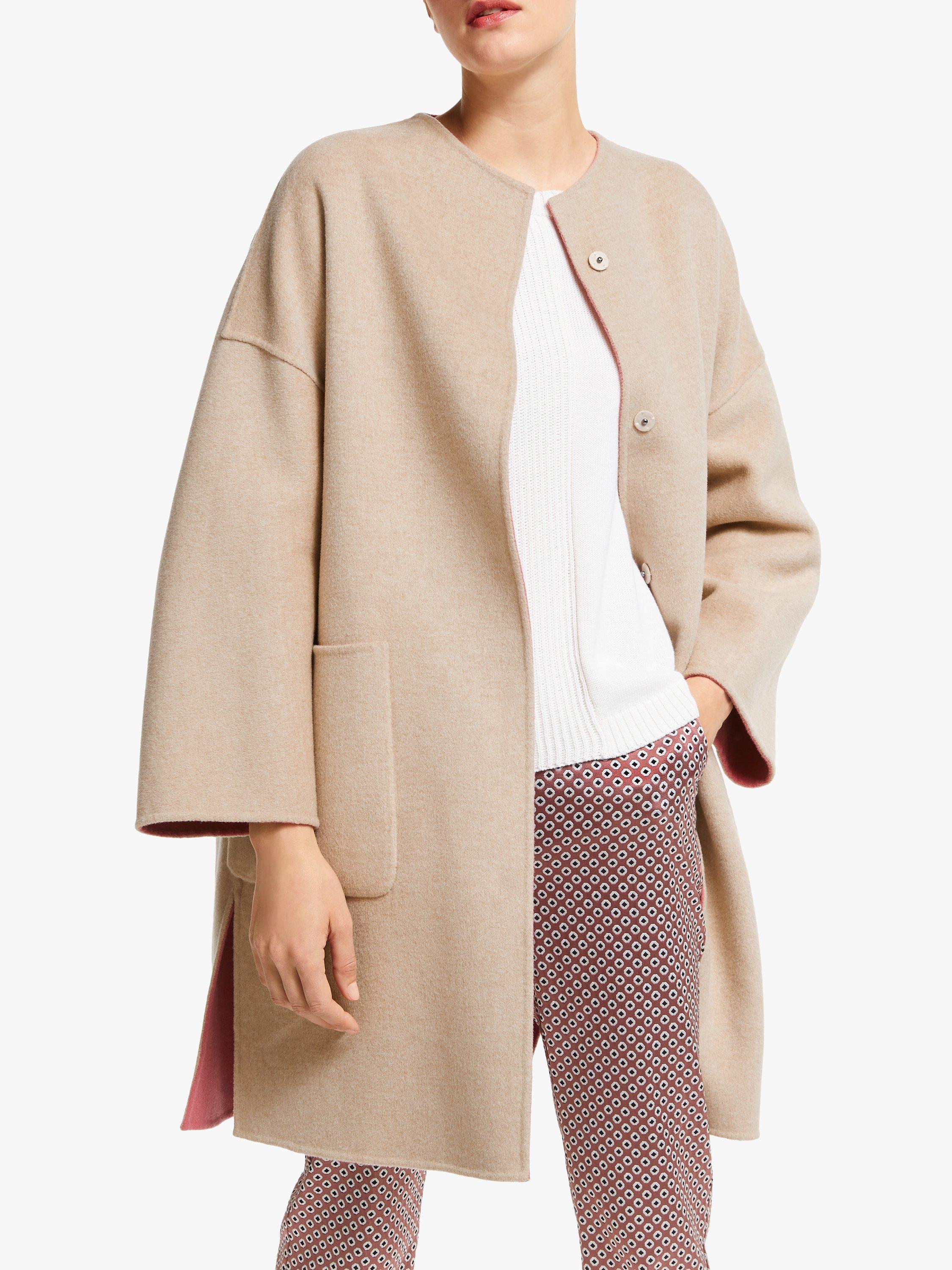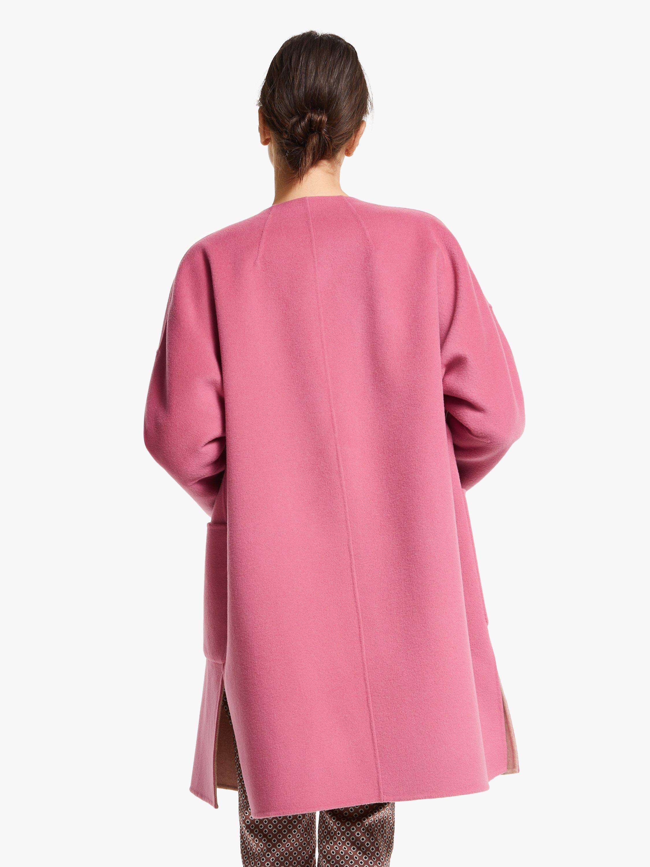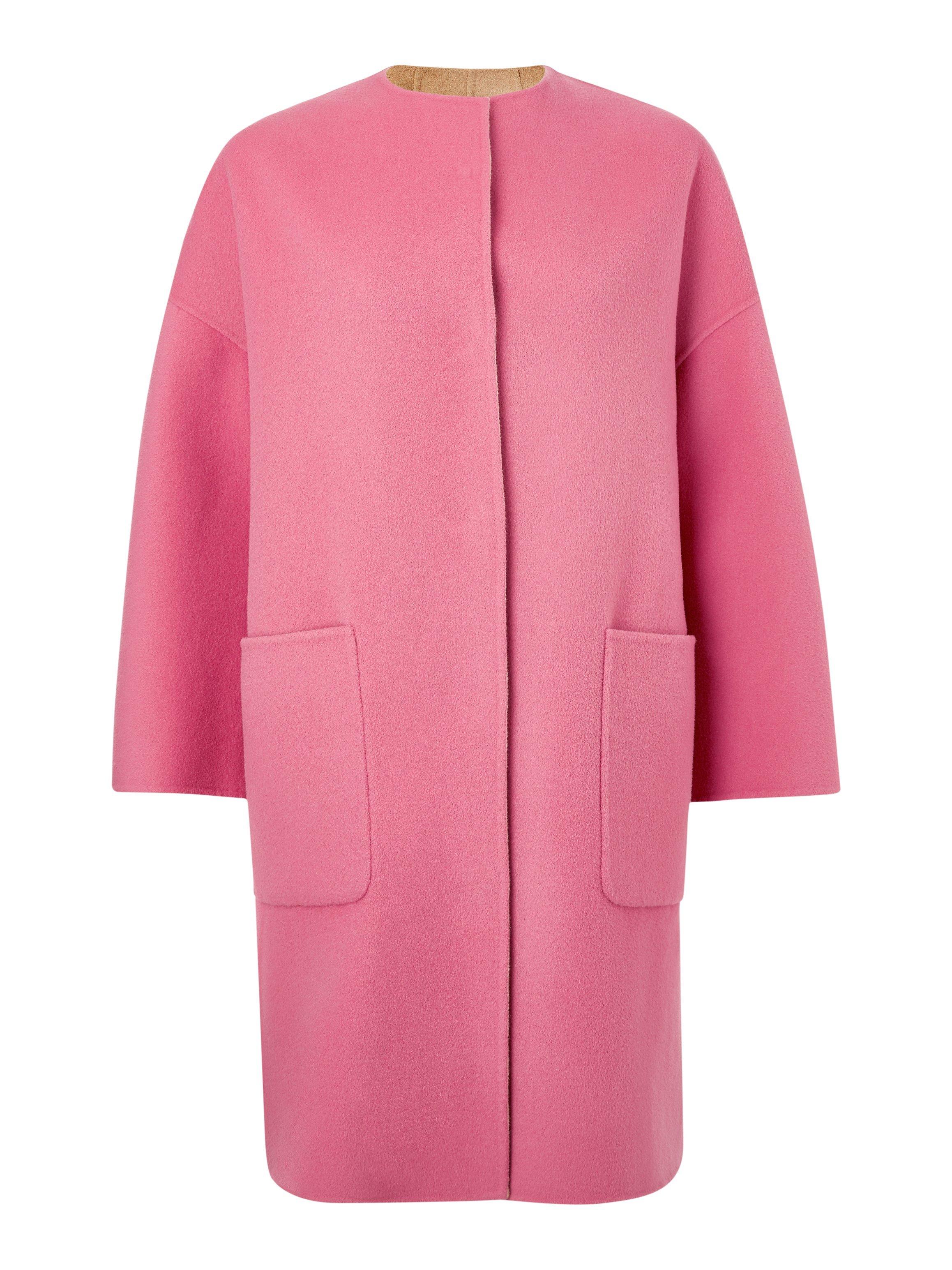 Made from pure wool with contrasting tones so you can wear it on the reverse, this coat has a simple cocoon shape with a collarless neckline, dropped shoulders and modern exposed seams. Its minimal design is perfect for showcasing the soft, wool fabric and creating a bold colour-block look. Try it layered over neutral tailored trousers and a colourful knit.