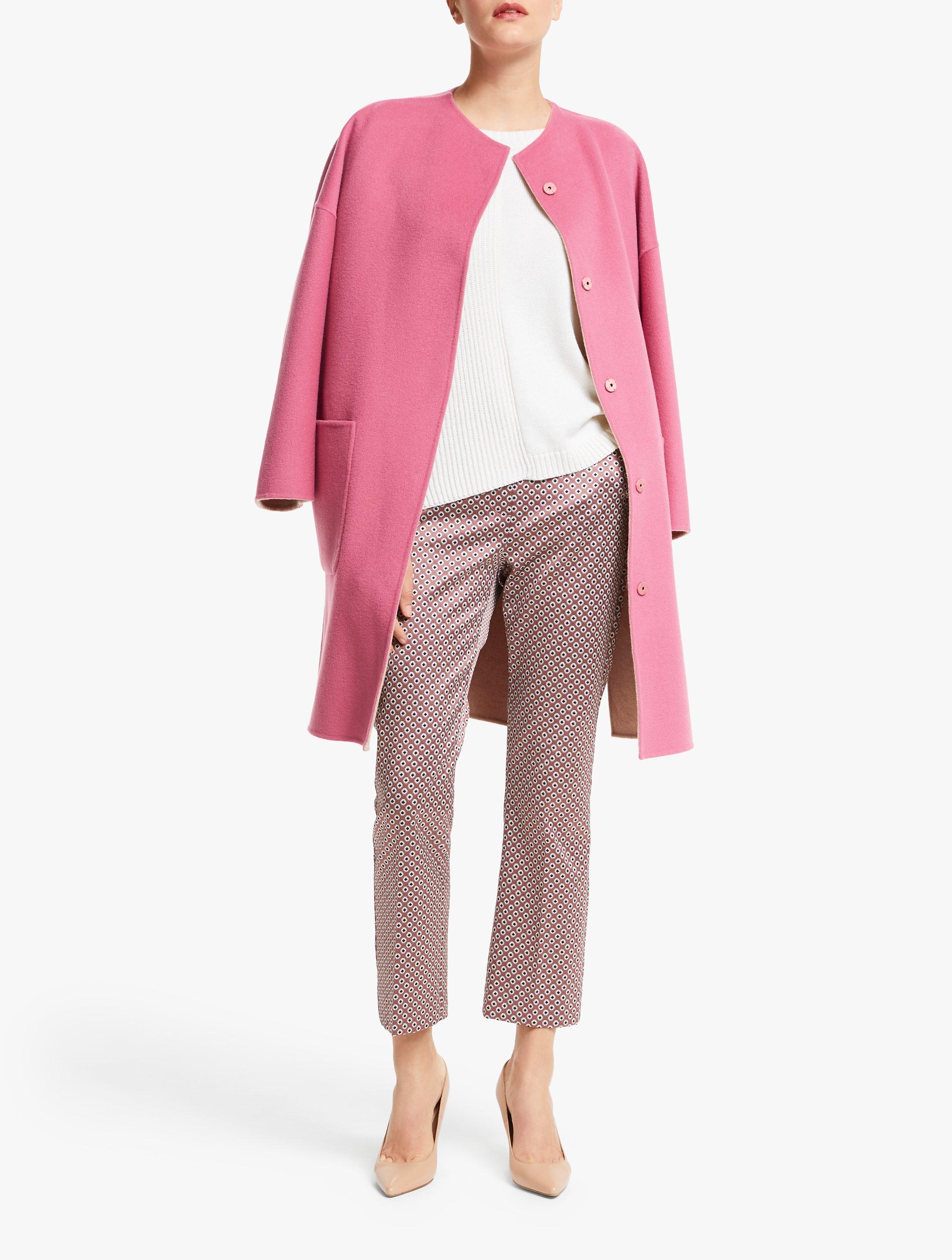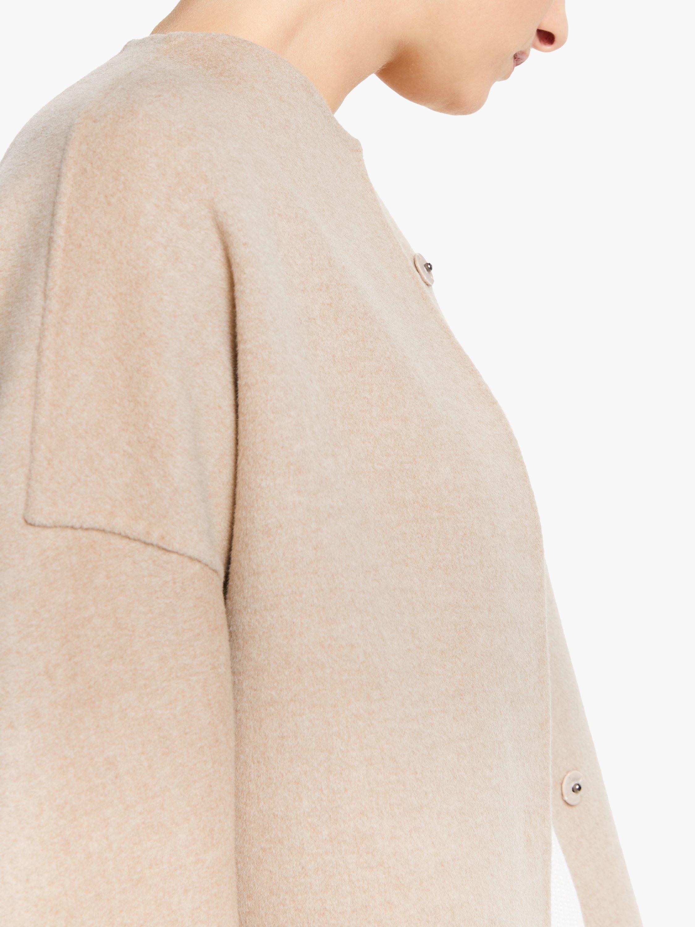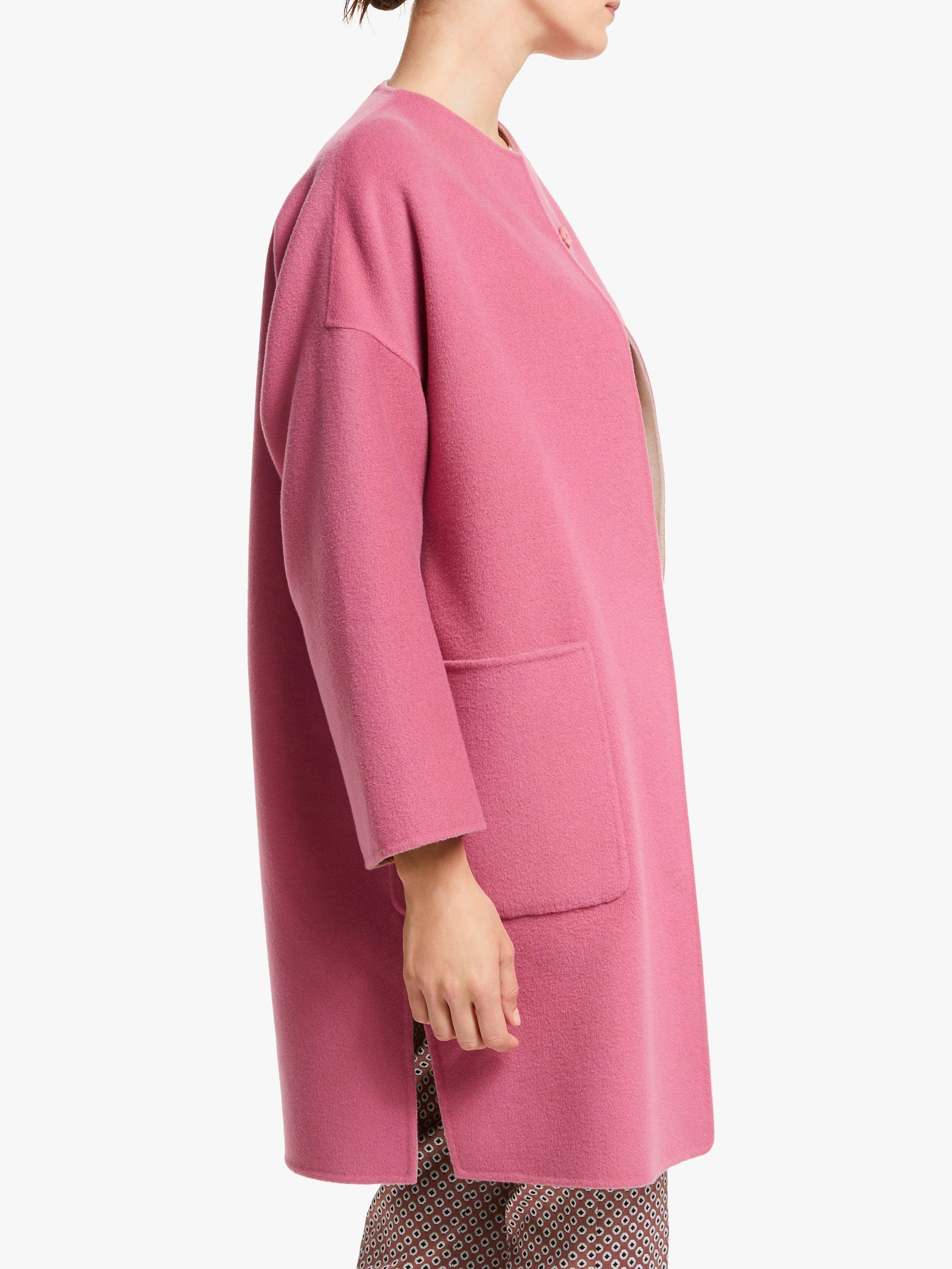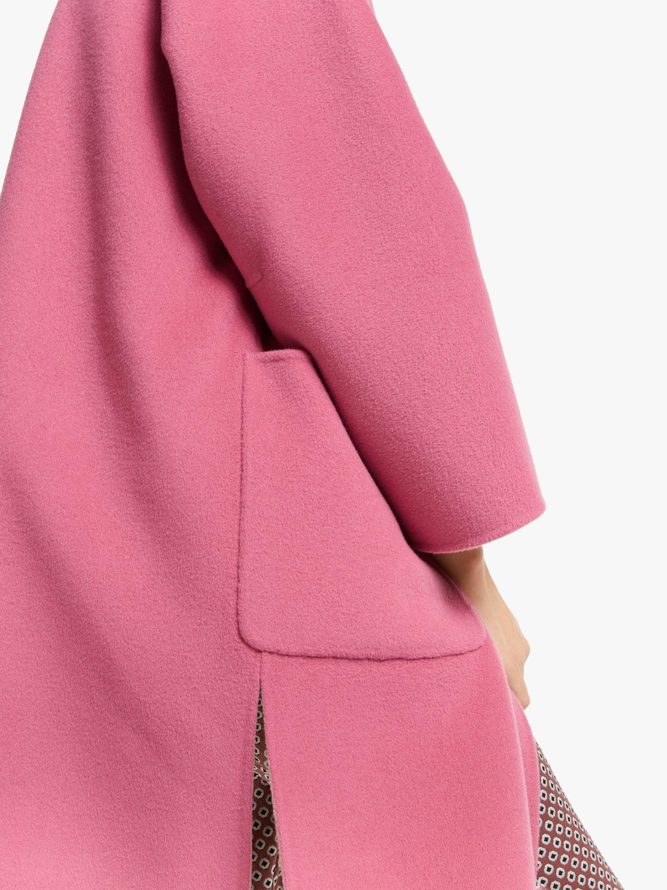 Made from pure wool with contrasting tones so you can wear it on the reverse, this coat has a simple cocoon shape with a collarless neckline, dropped shoulders and modern exposed seams. Its minimal design is perfect for showcasing the soft, wool fabric and creating a bold colour-block look. Try it layered over neutral tailored trousers and a colourful knit.