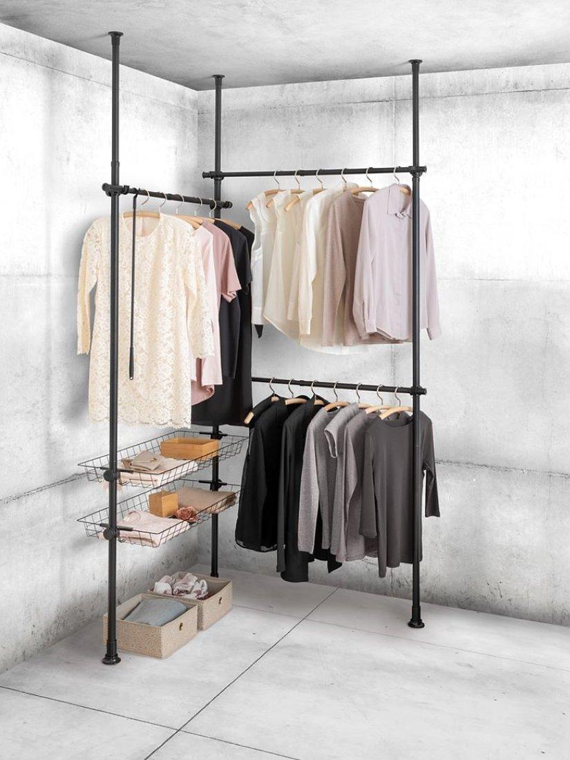 The clothes rails are made of heavy, powder-coated steel and high-quality plastic connecting elements, which can be very easily assembled and disassembled without drilling or screwing, and which are simply clamped between floor and ceiling.
