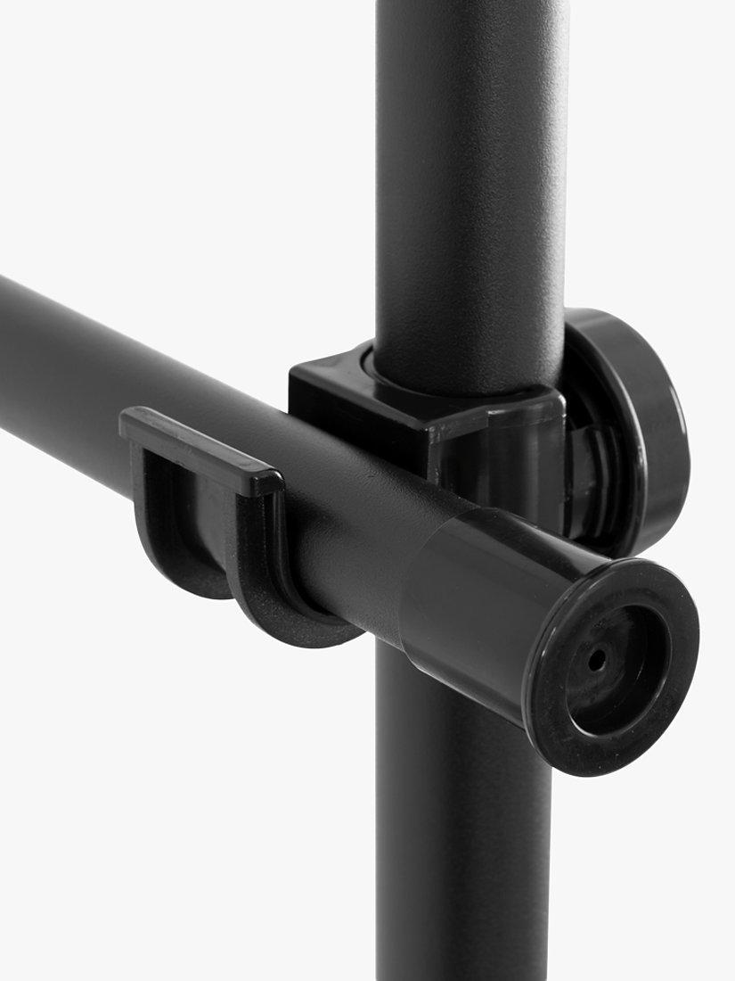 The clothes rails are made of heavy, powder-coated steel and high-quality plastic connecting elements, which can be very easily assembled and disassembled without drilling or screwing, and which are simply clamped between floor and ceiling.