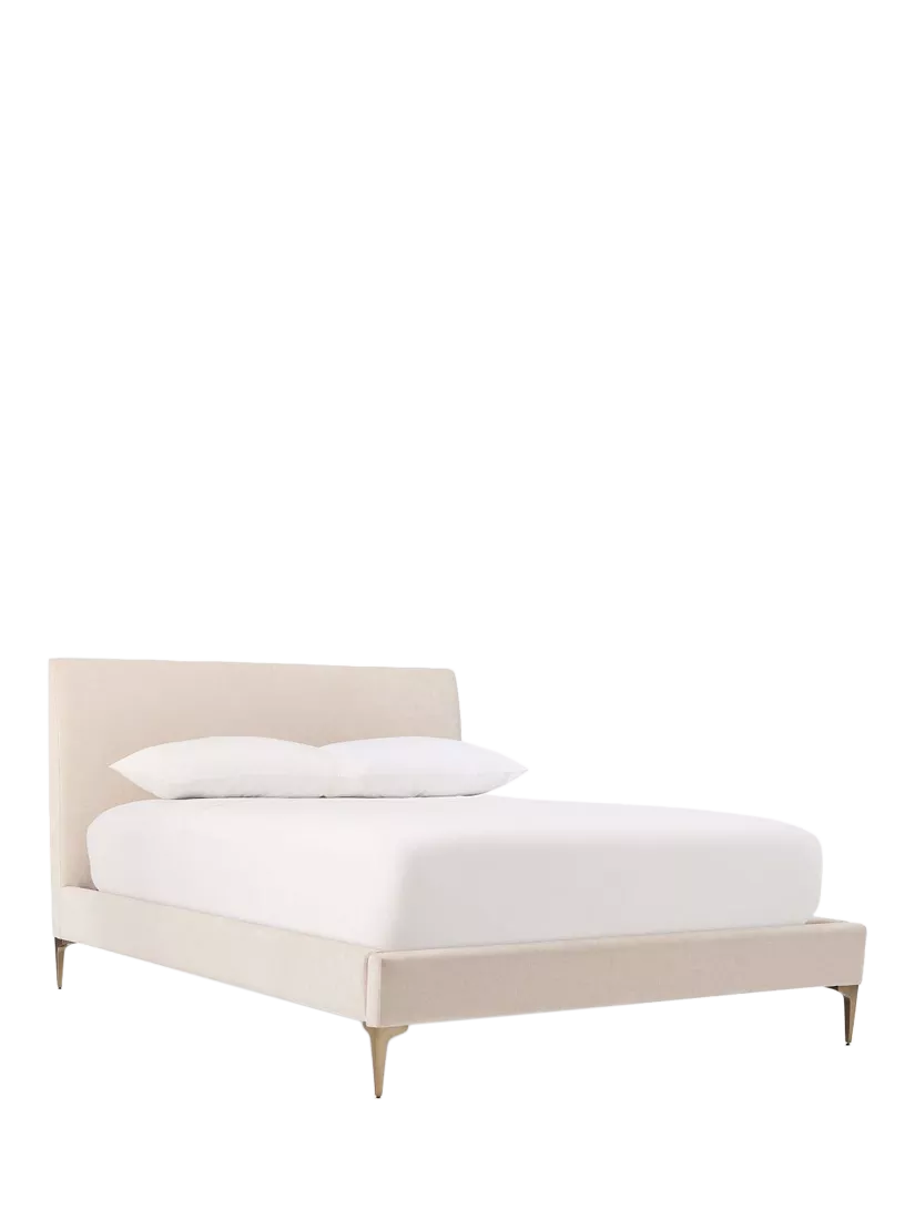 A plush, clean-lined headboard gives this bed a luxe look. Tall cast metal legs create an airy feel.