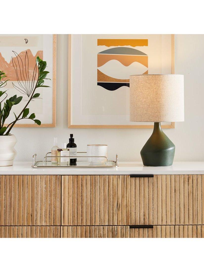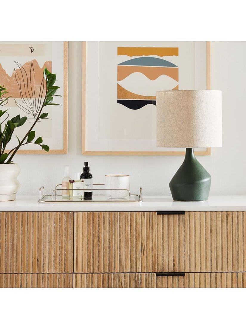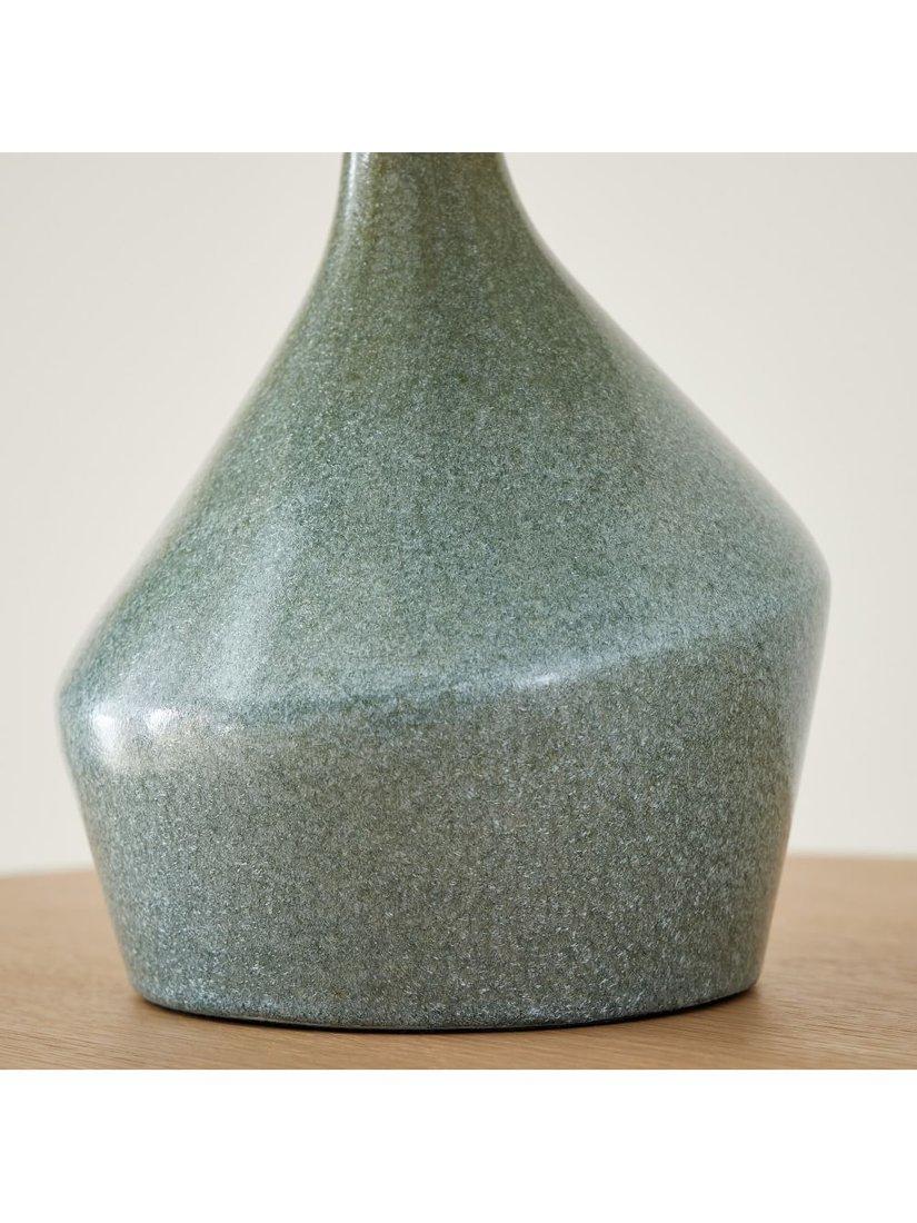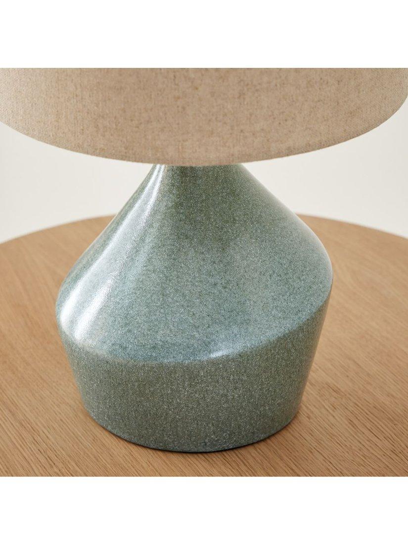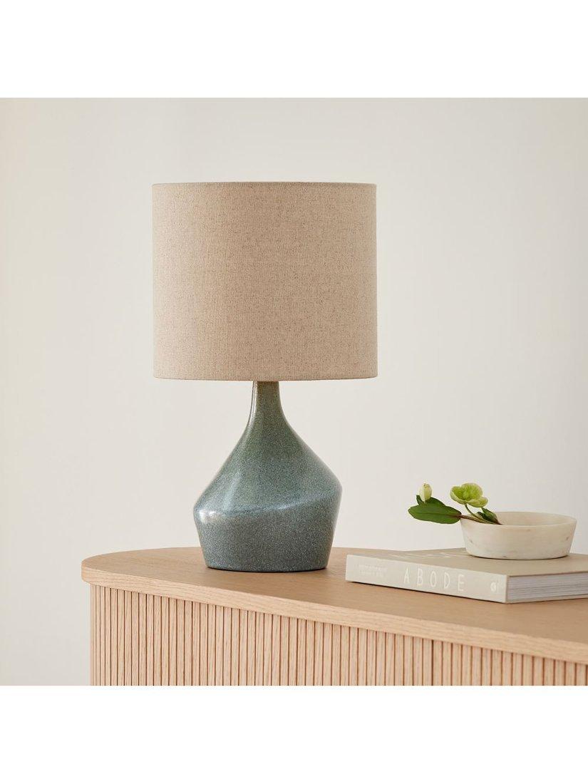 Variegated colouring adds a special touch to the fluid form of the Asymmetry Ceramic Table Lamp, inspired by Japanese pottery. Topped with a linen shade, it offers diffused light next to a bed or a reading nook.