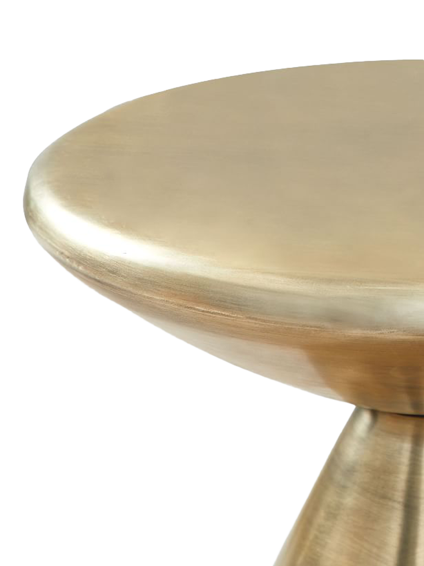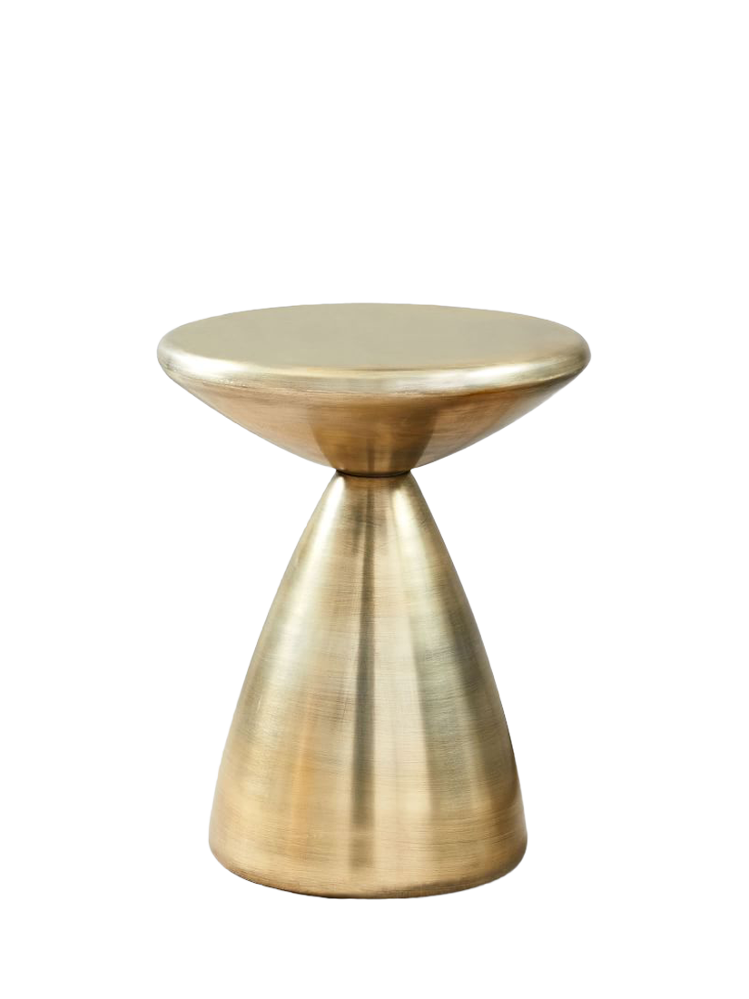 Sculptural frame side table for holding plants, drinks and decor. Made of lightweight, easy-care spun aluminium in an Antique Brass finish. Suitable for both indoor and outdoor use. Its rounded edge and shapely pedestal form combine for an updated yet retro look.