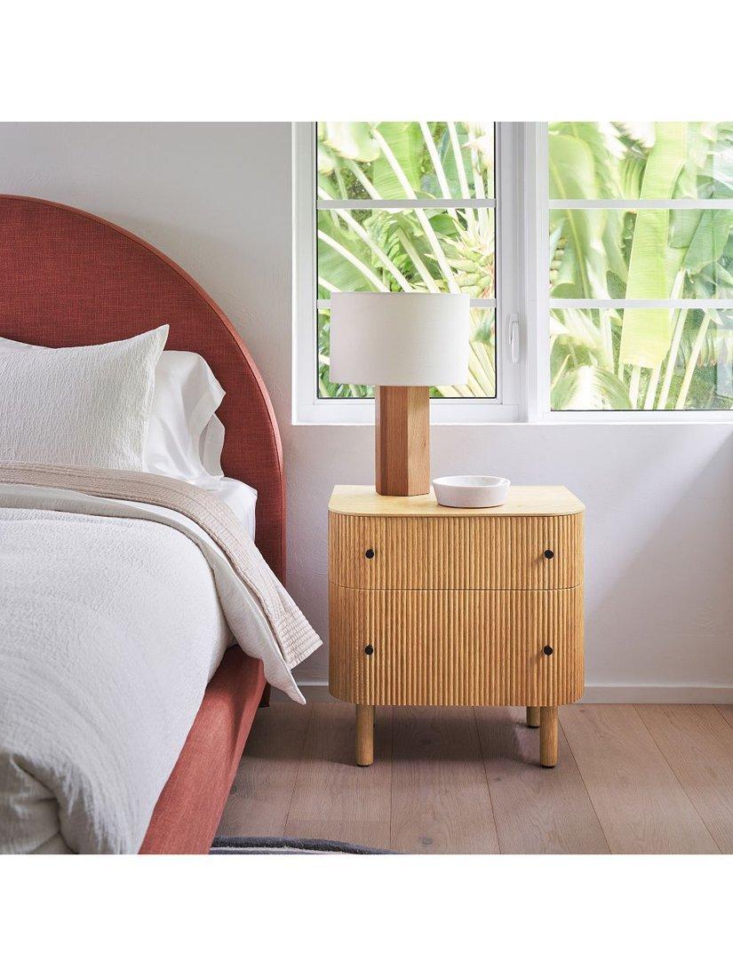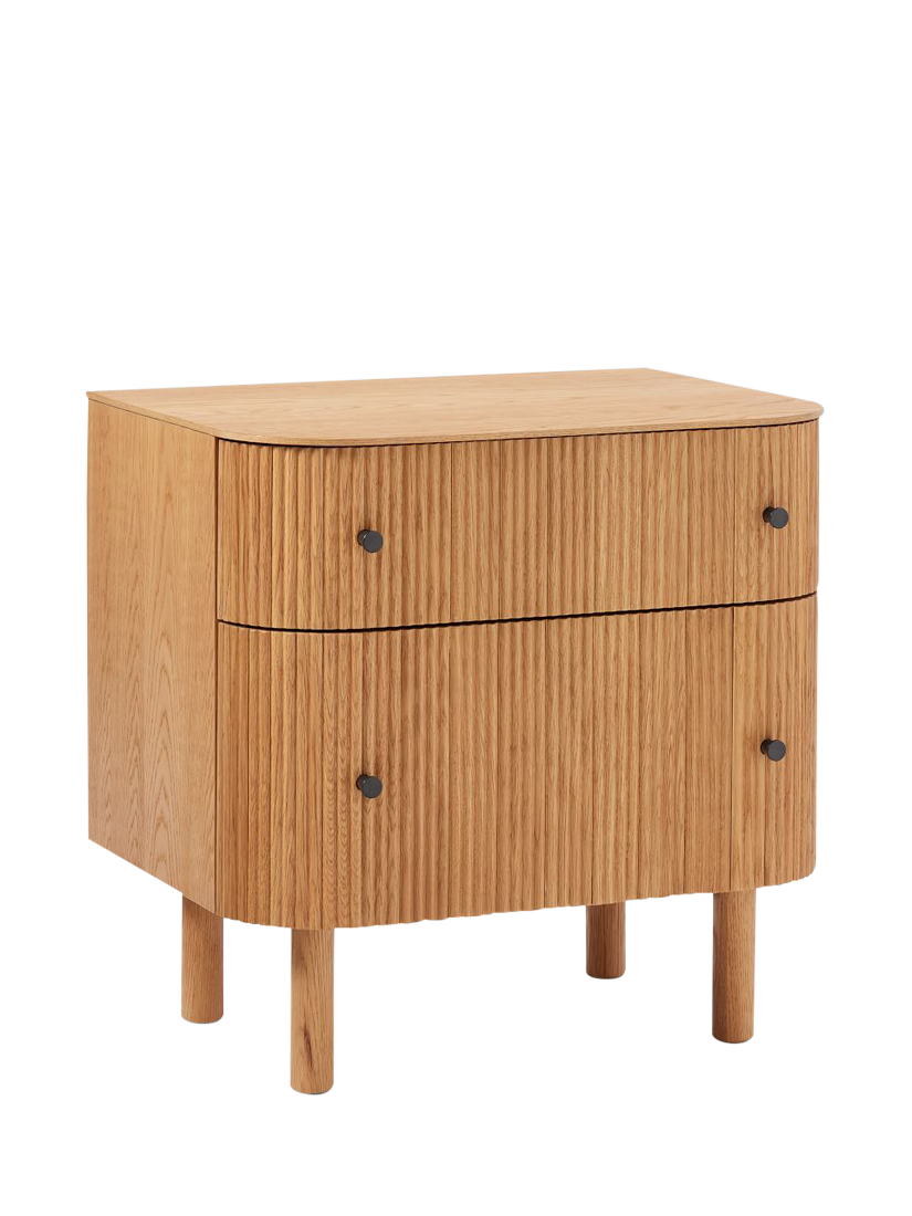 Rounded corners accentuate the fluted front of this bedside table. Elegant cylindrical legs keep it lifted off the floor.