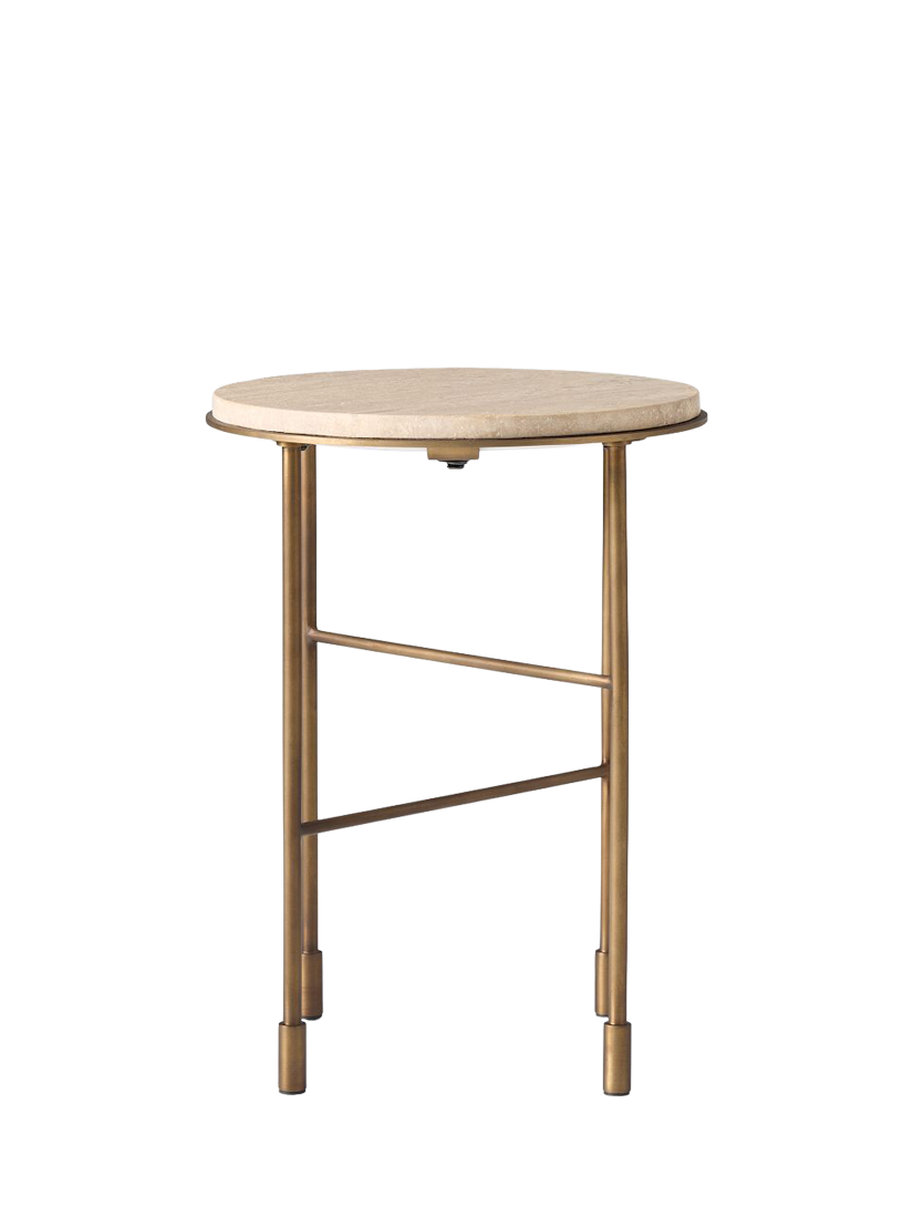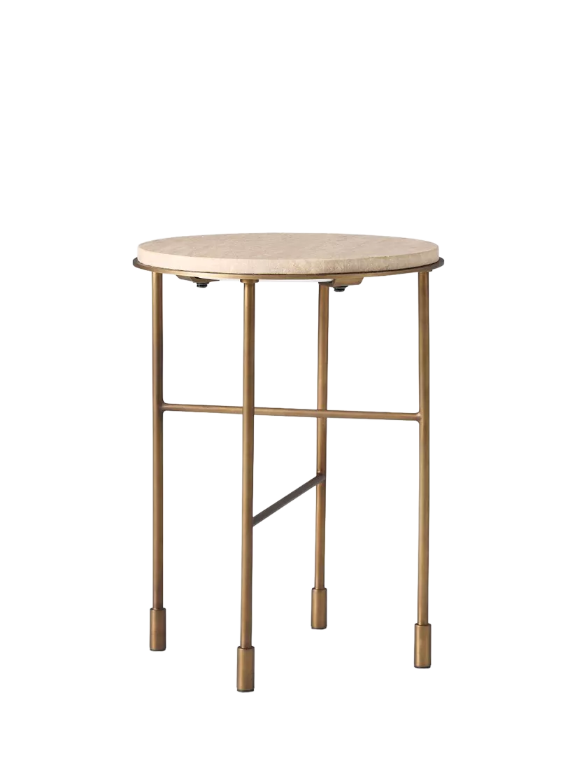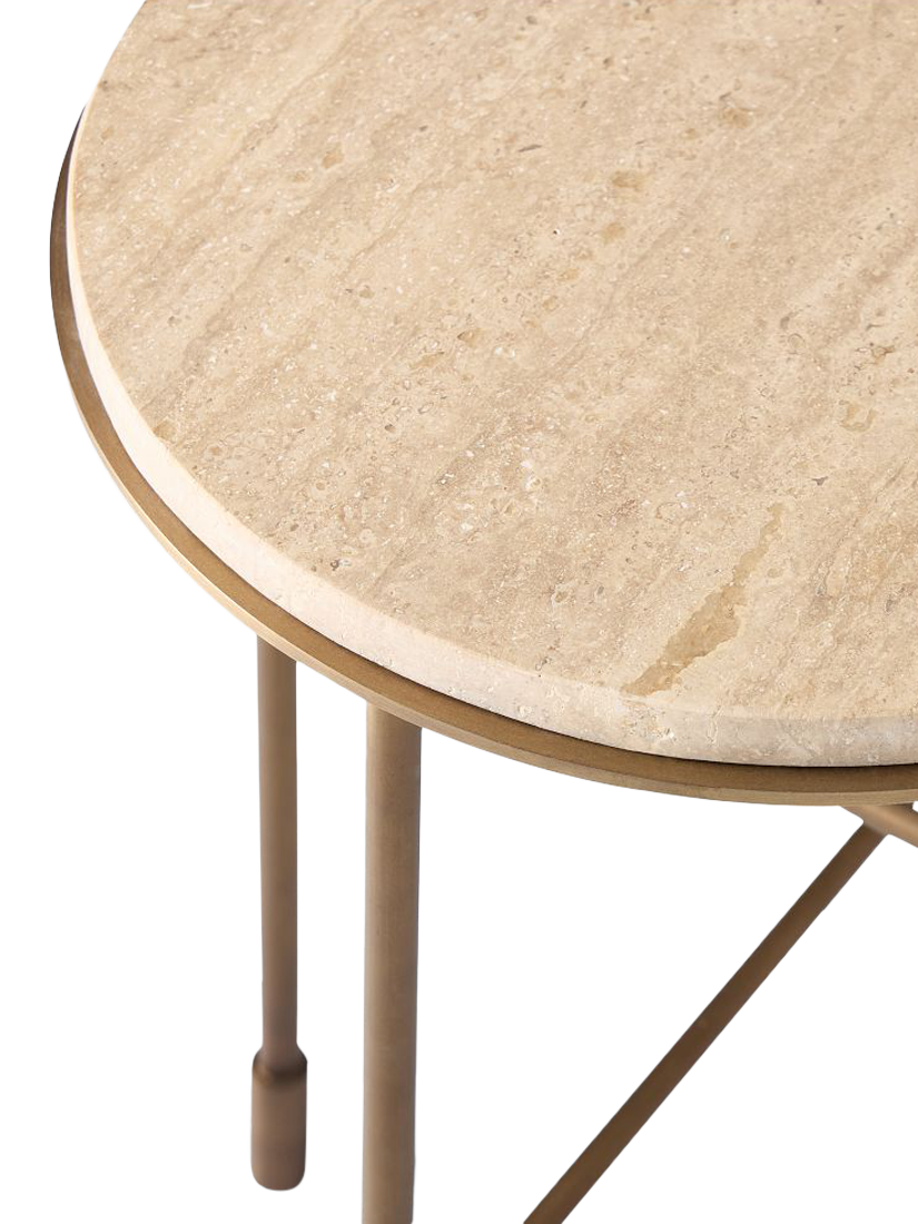This side table pairs a travertine stone top — rich in natural character and reinforced with an engineered wood backing - with a striking asymmetrical crisscross metal base. The base is finished in a warm burnished brass, providing modern angles that contrast beautifully with the organic texture of the stone.