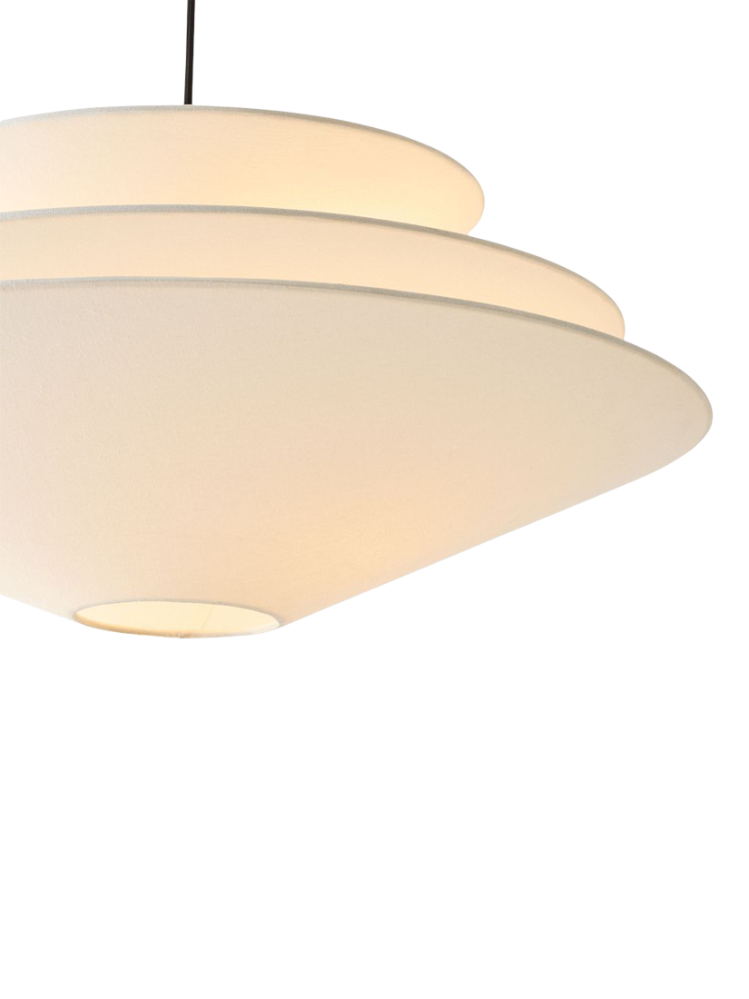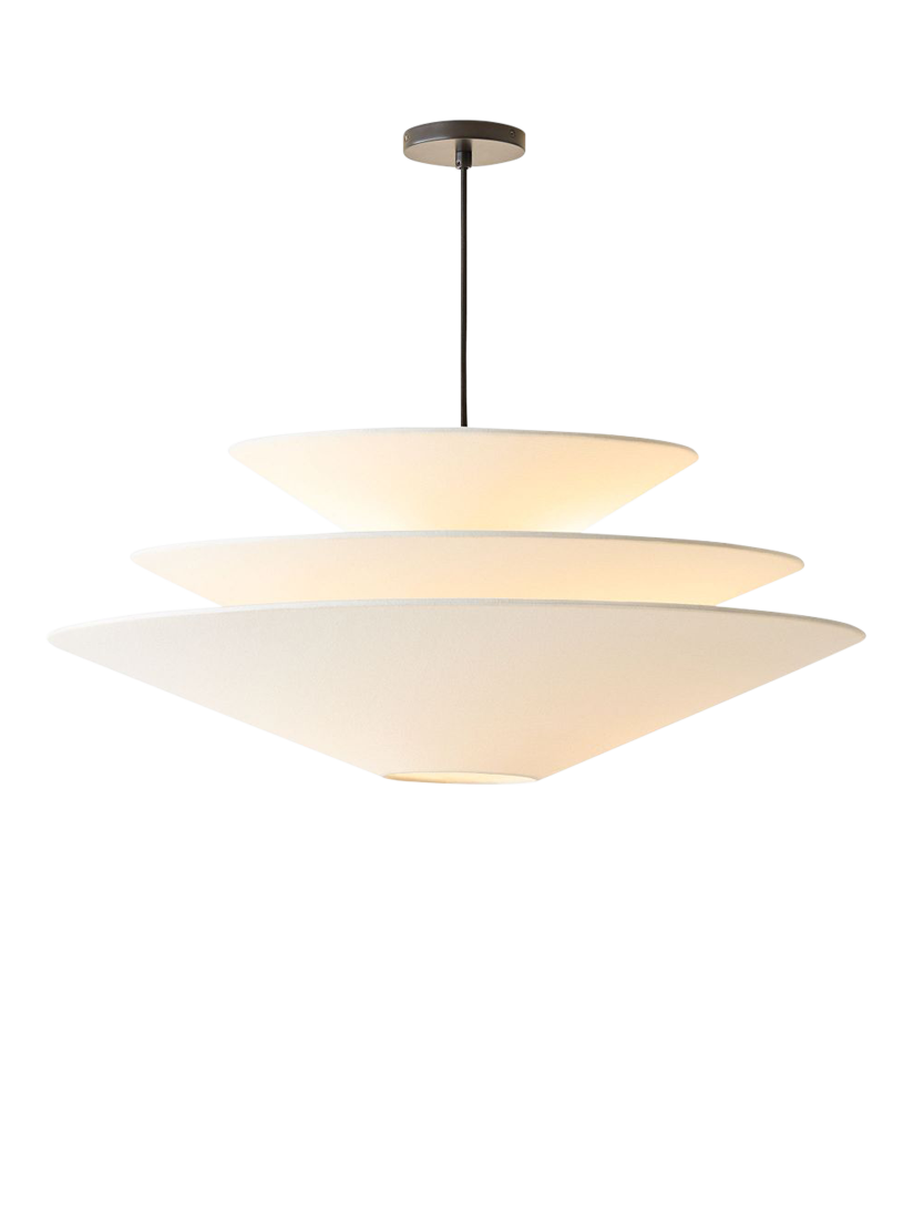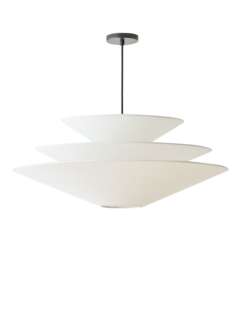 Layers of white linen create triple the texture on this pendant light. Brings a soft and airy look to any space. Perfect for the living room or over the dining table.