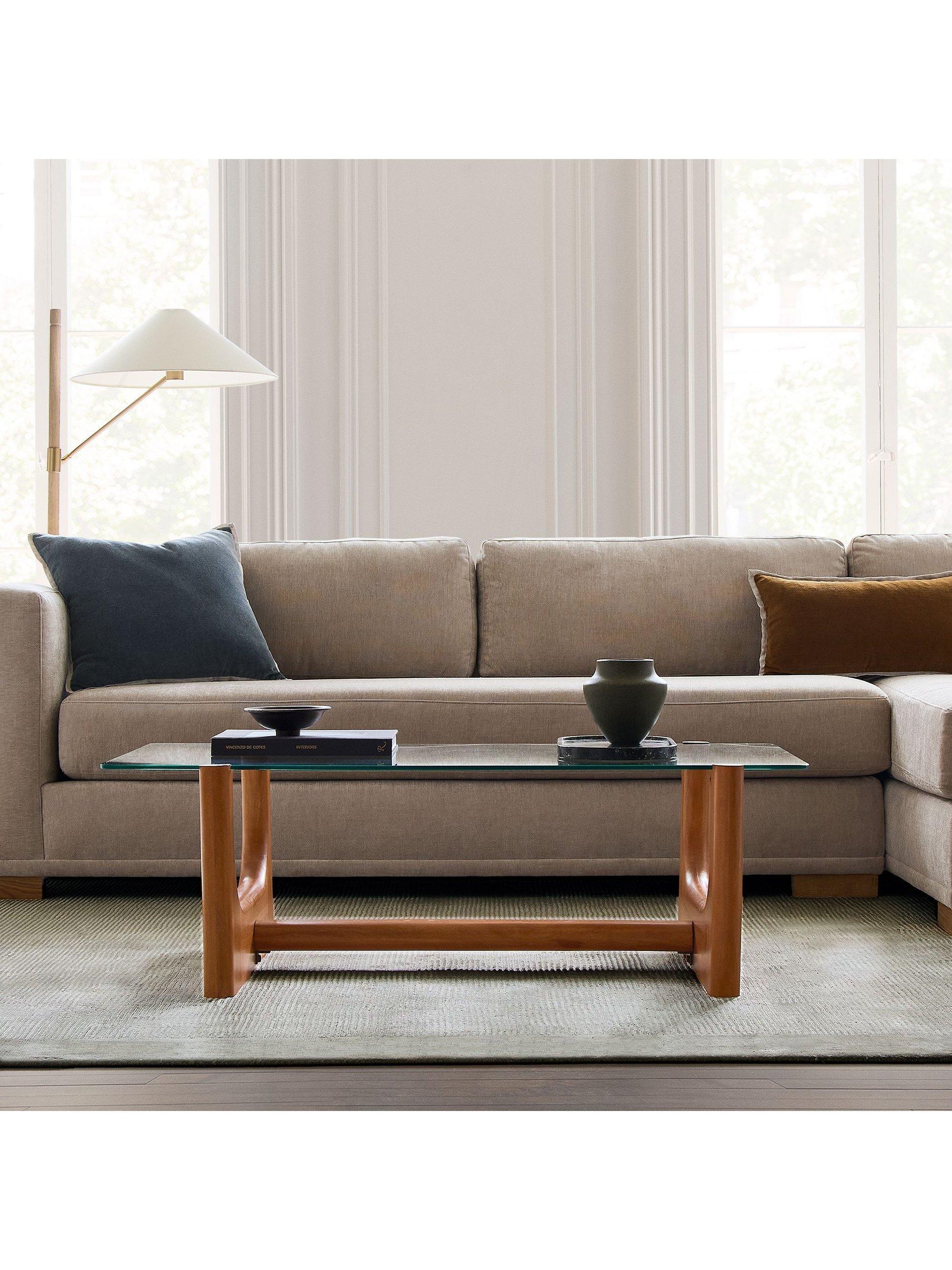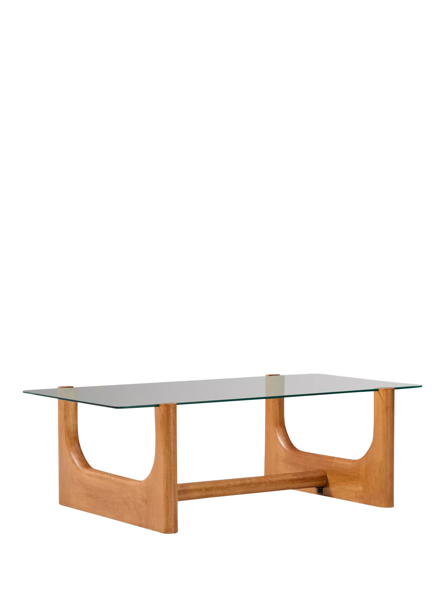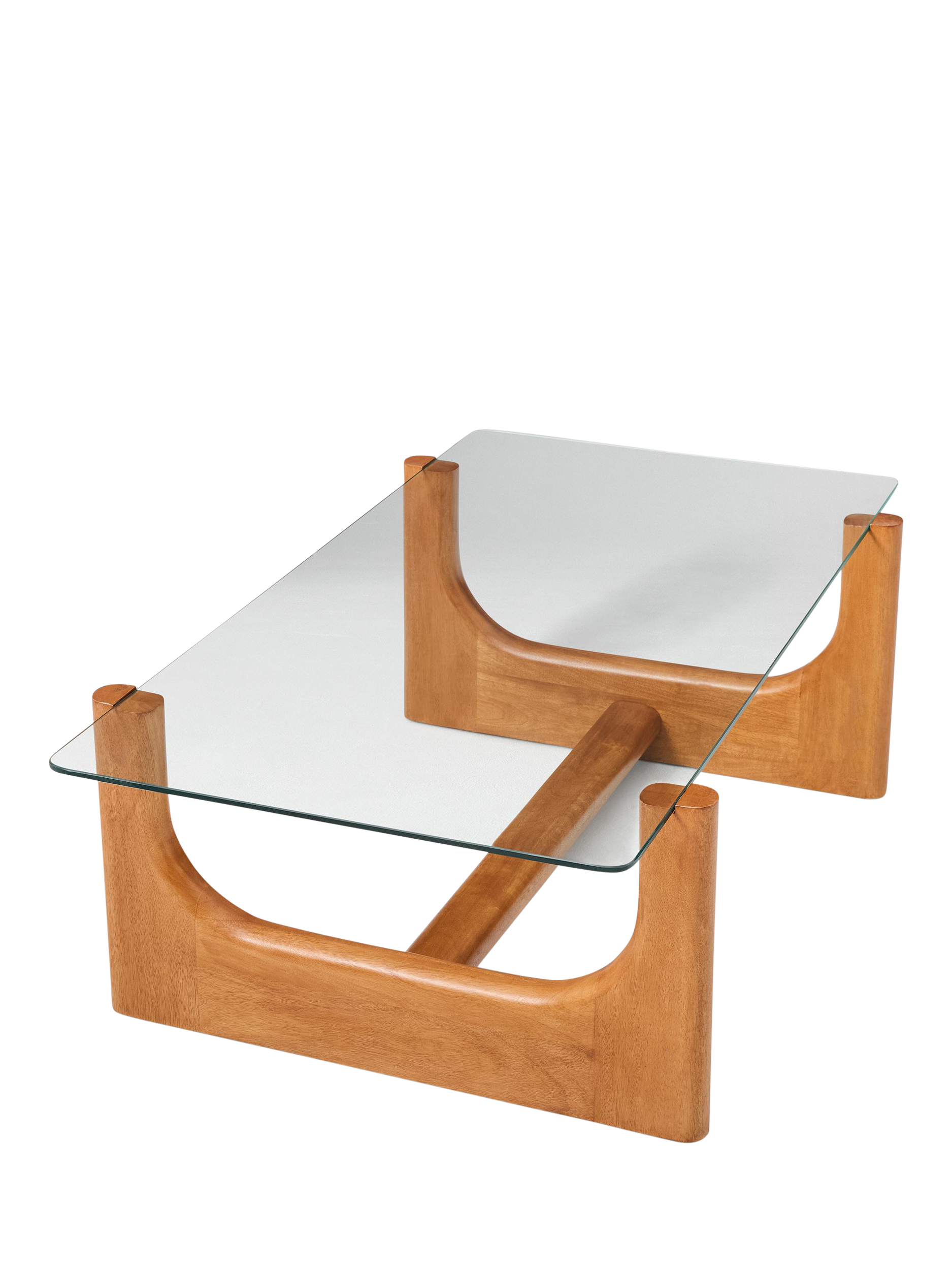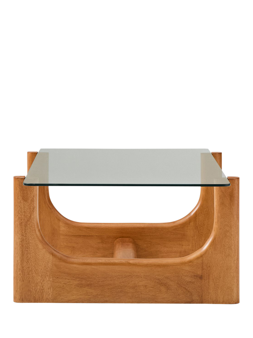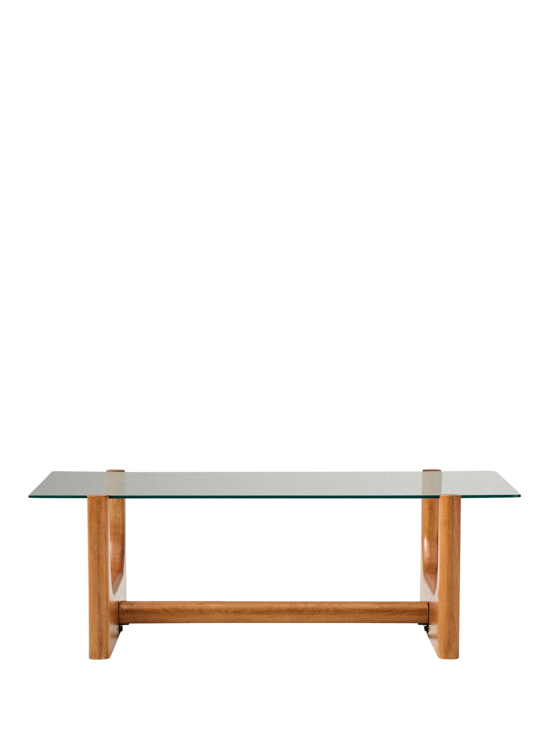 This coffee table is made from solid, sustainably sourced mango wood, with u-shaped legs that underscore an airy tempered glass top.