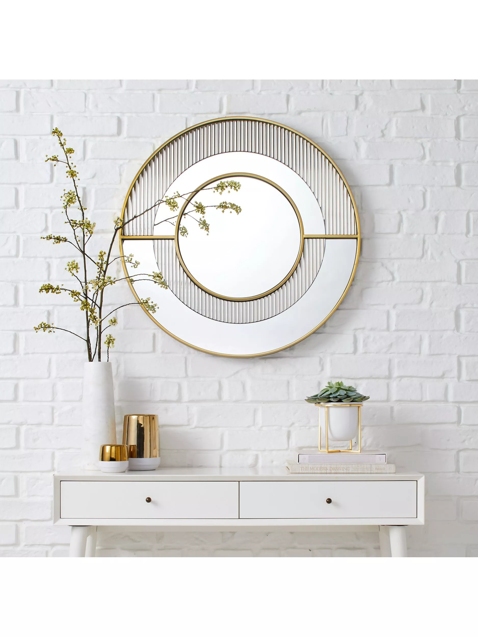 This striking mirror from west elm is designed with a brass-finished frame for a deco-inspired look. Wall-mounted, it will create the illusion of extra space, especially in smaller rooms and it makes for an eye-catching decoration to plain walls.