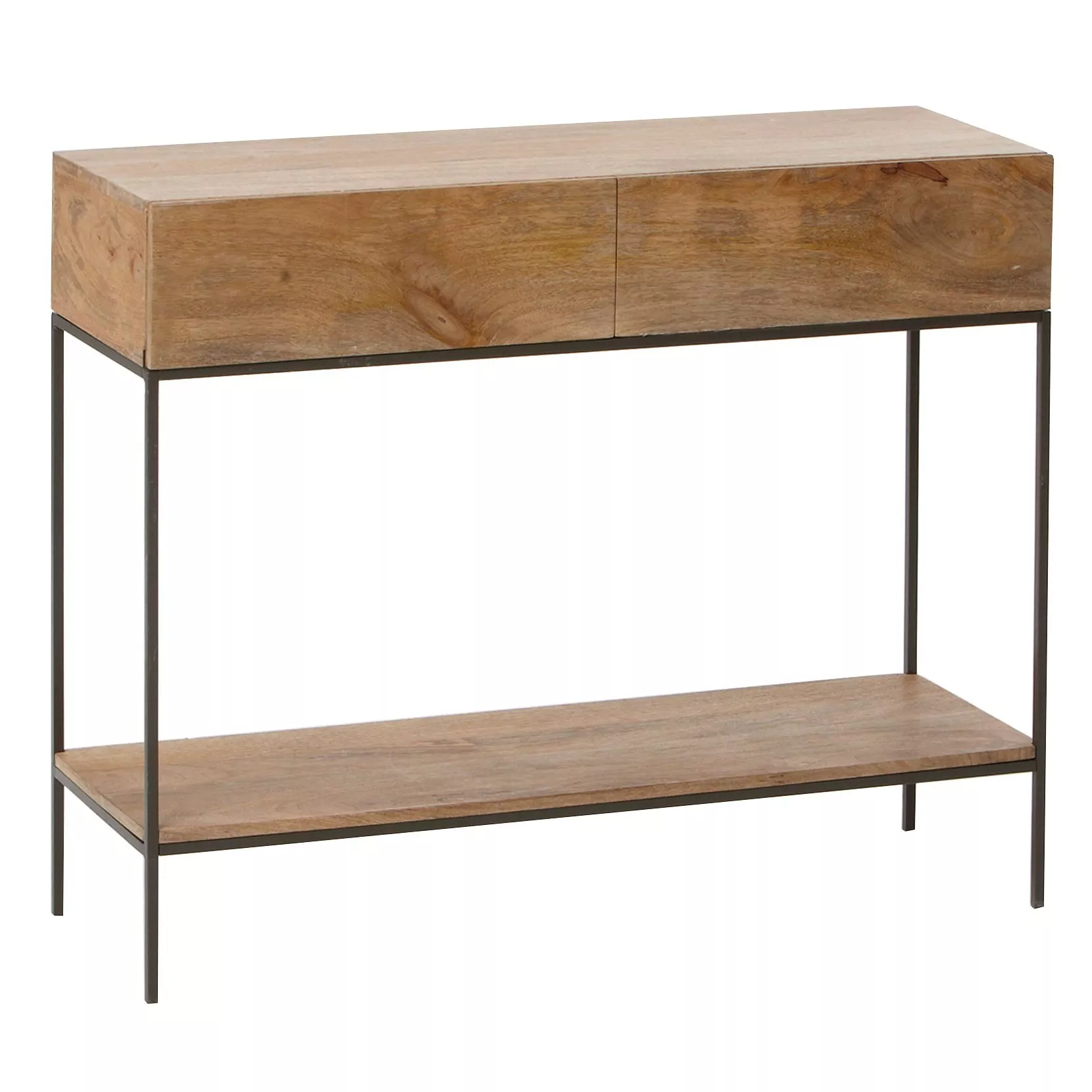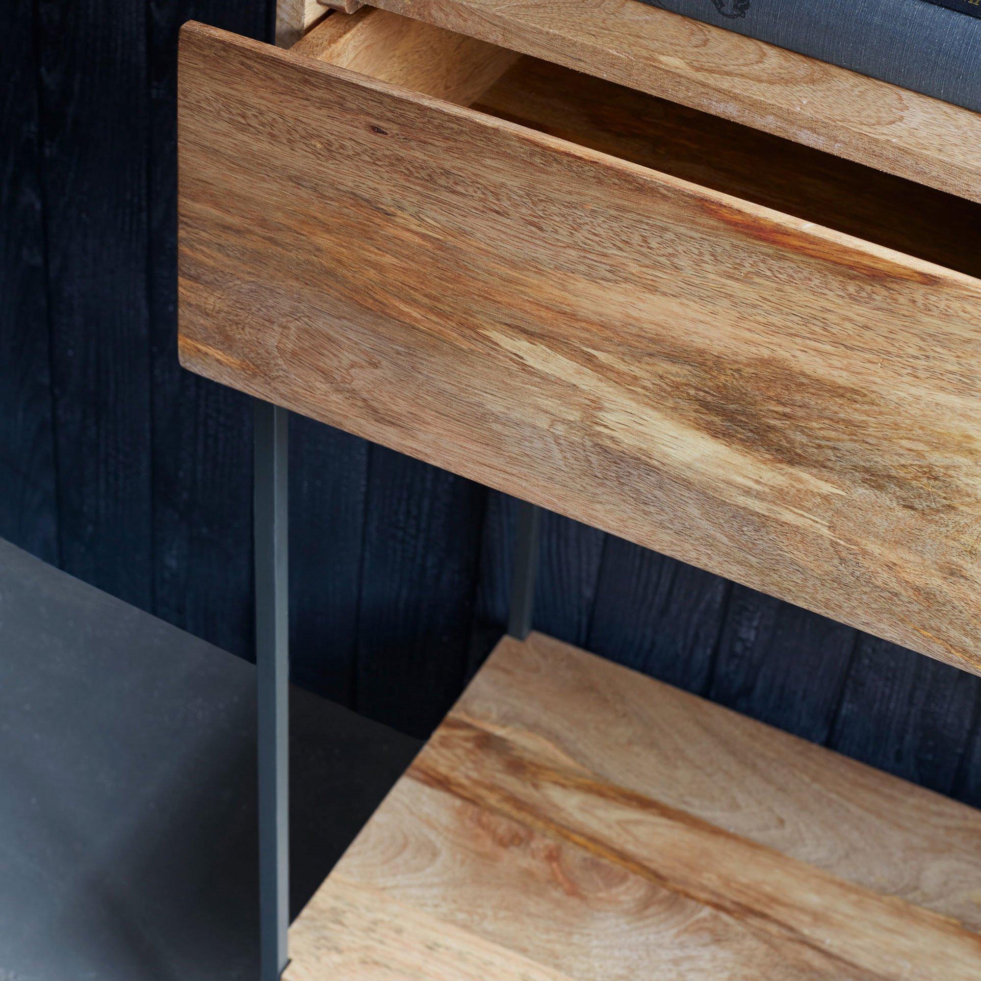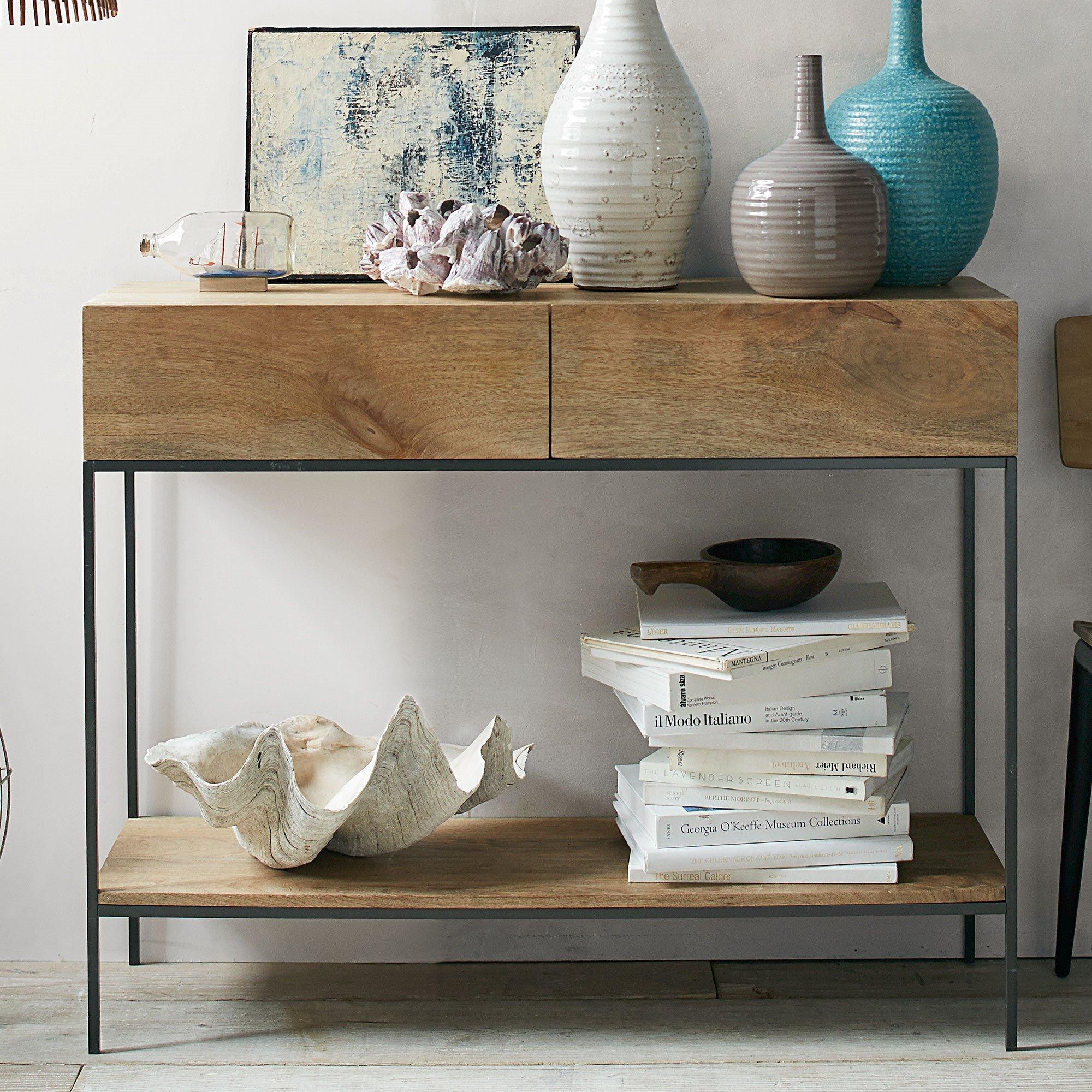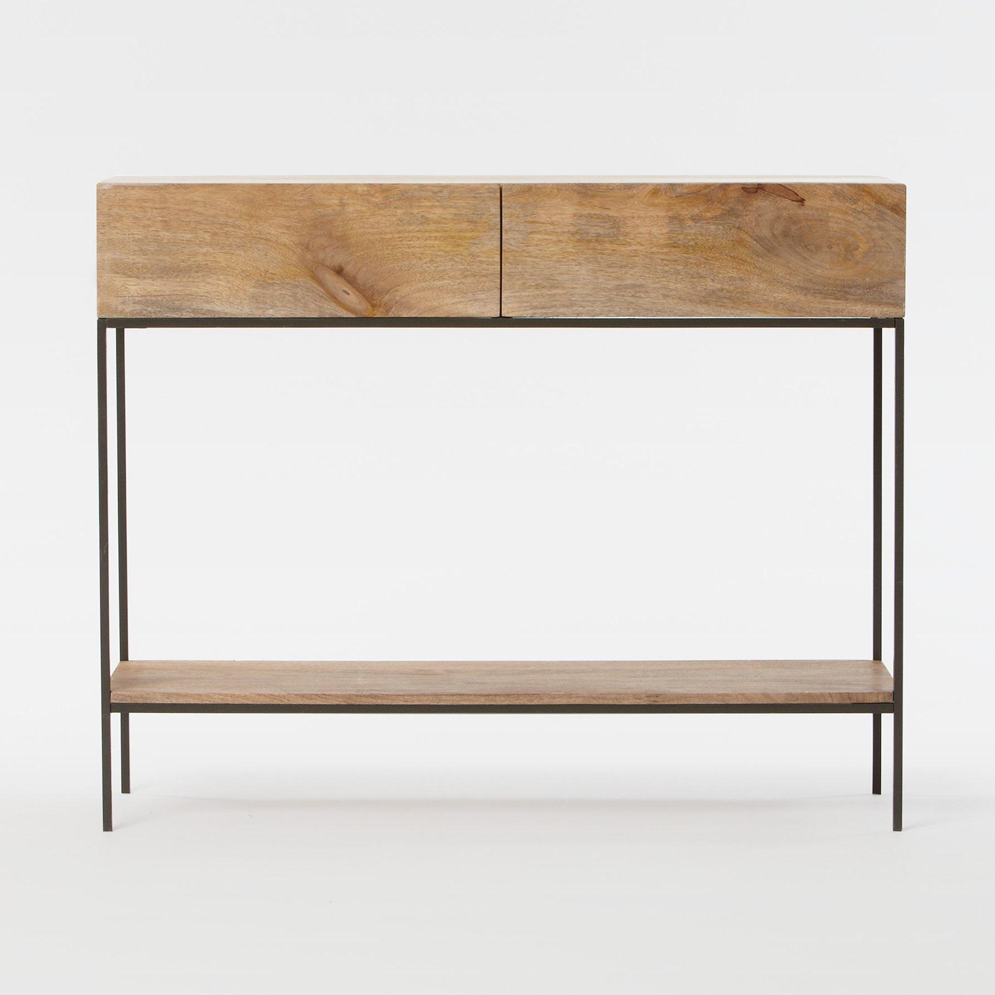 With its rustic, industrial styling this console table gives you lots of versatile storage options and is the perfect addition to your living space. Two roomy drawers help you keep possessions neat and tidily stashed out of sight. In addition, a lower shelf acts as the perfect place to display decorative items and books.