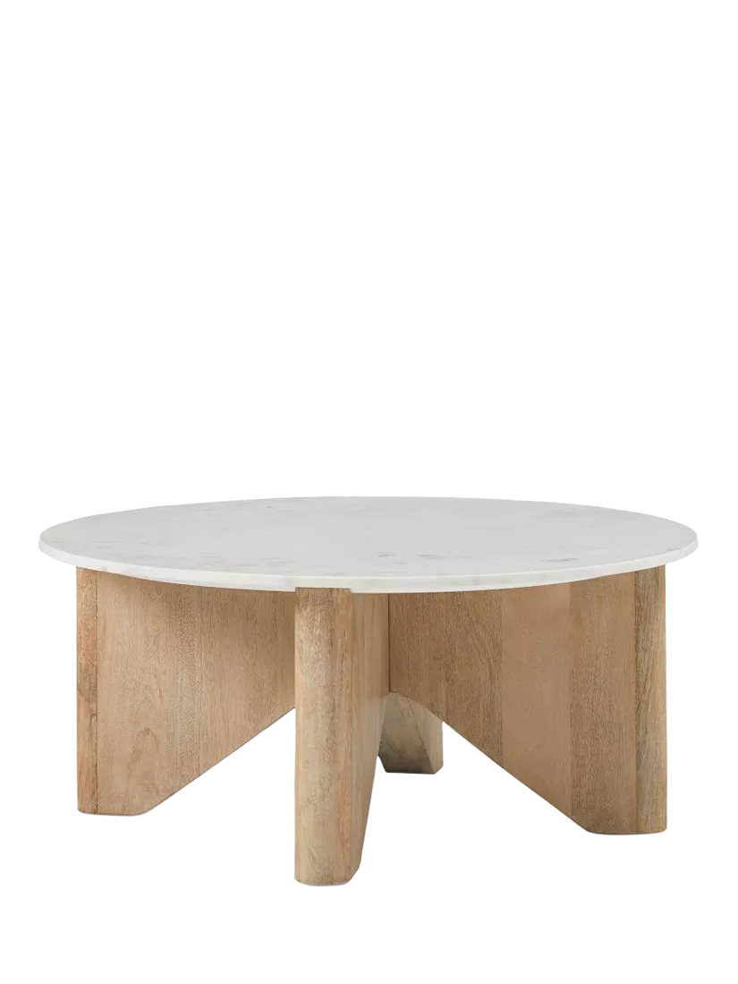 Laid-back and sophisticated coffee table with a chunky mango wood base and marble top. The light finishes exude rustic coastal-inspired style.