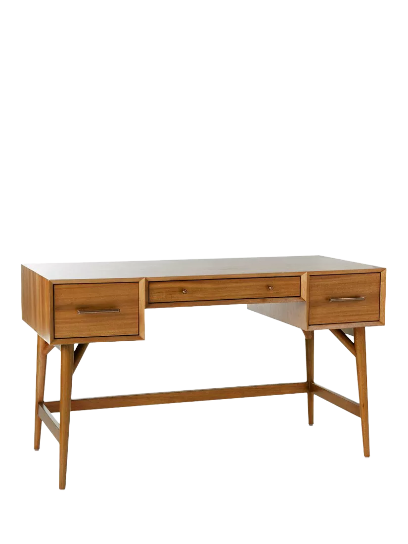 Inspired by iconic '50s and '60s furniture design with its tapered legs, an angular base and bevelled front edges. Space to spare with large side drawers to stow books and supplies, while the centre drawer is perfect for pens.