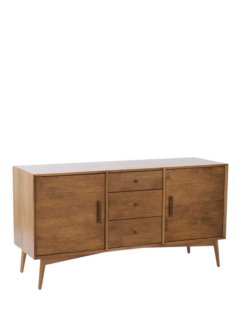 Inspired by iconic '50s and '60s furniture design with its tapered legs, angular base and bevelled front edges. A multi-purpose piece with drawers and shelves to store anything from serveware and linens to books and games.