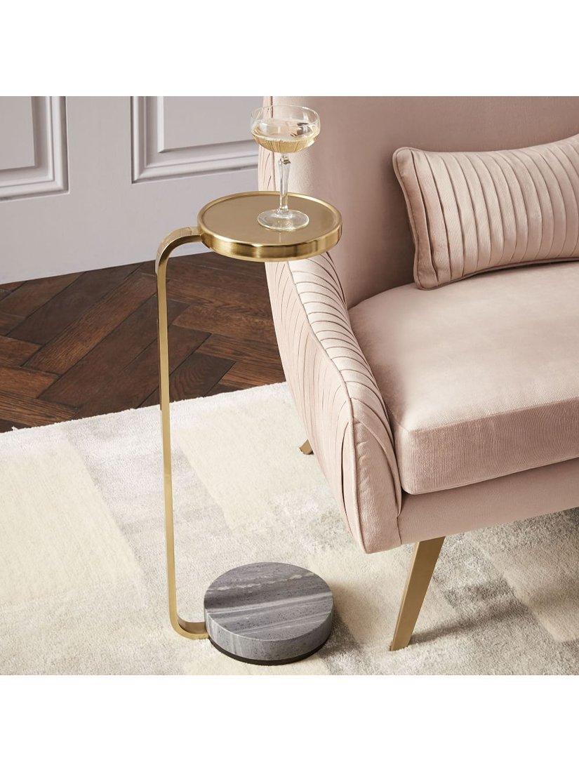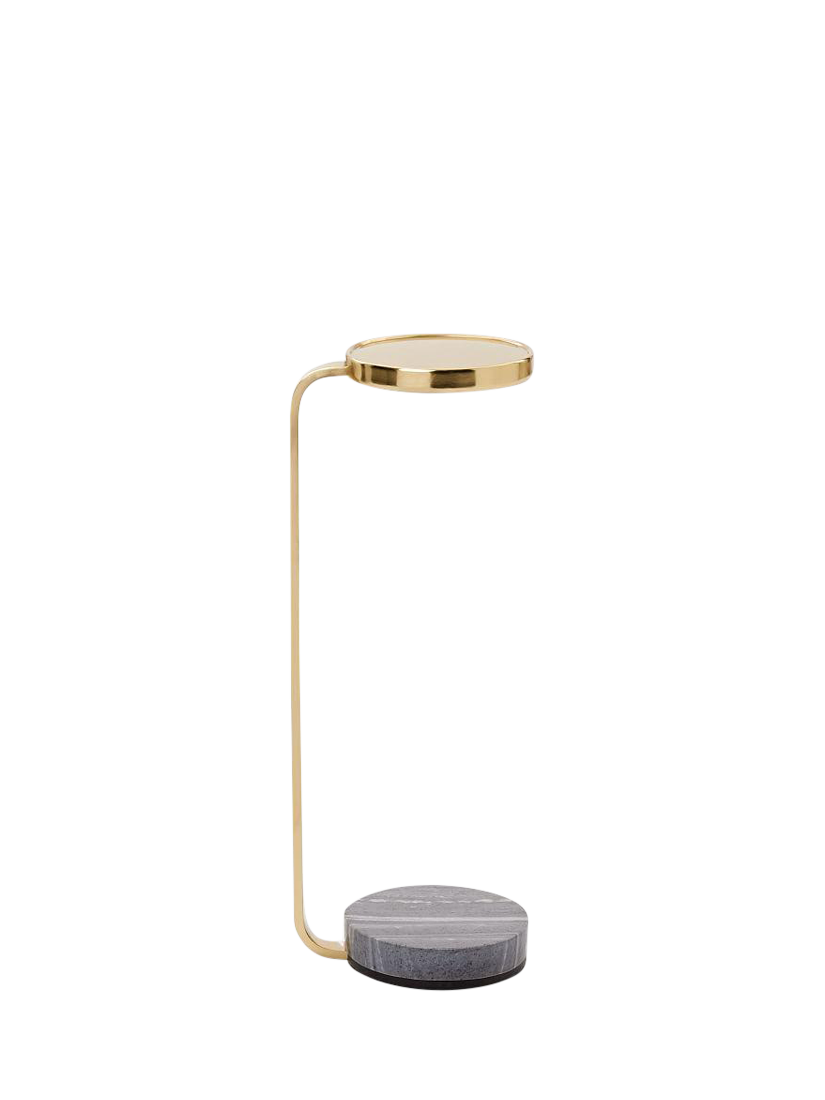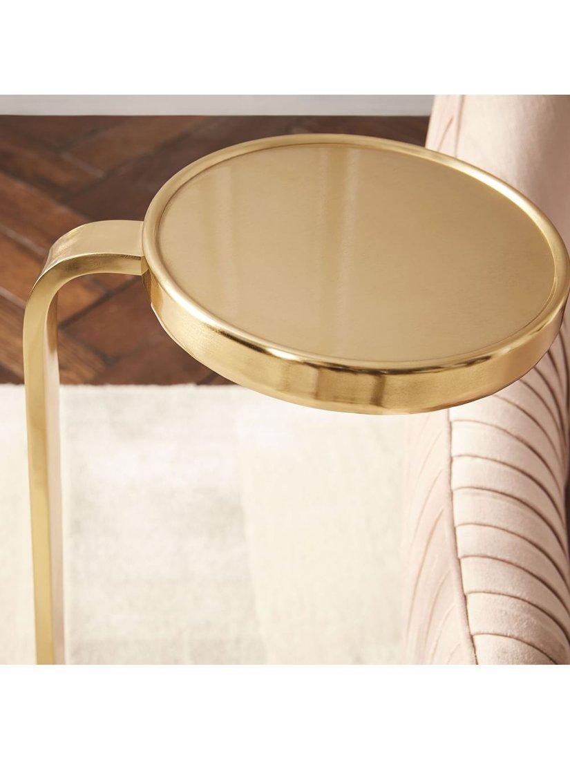 The C-shaped base of this drinks table slips beneath couches. Just the right size to perch a drink.