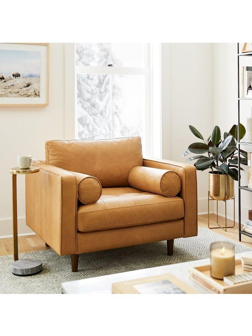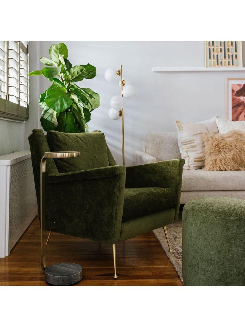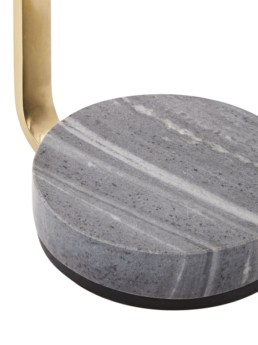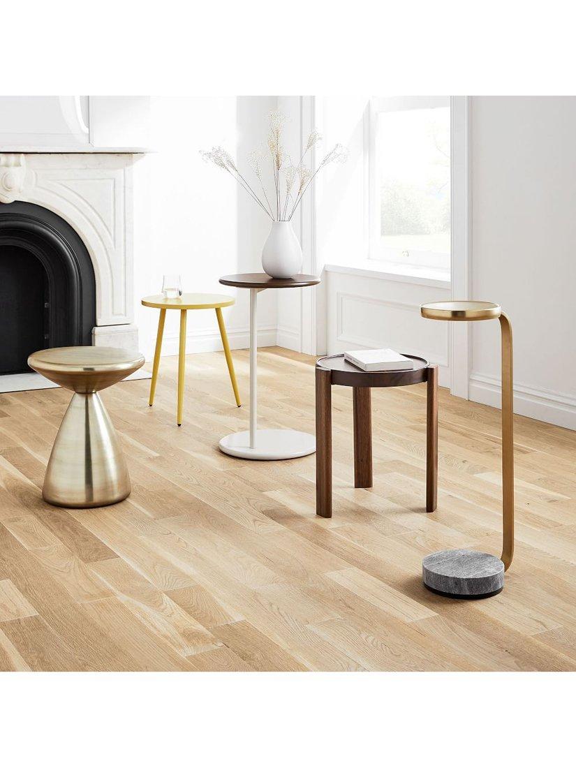 The C-shaped base of this drinks table slips beneath couches. Just the right size to perch a drink.