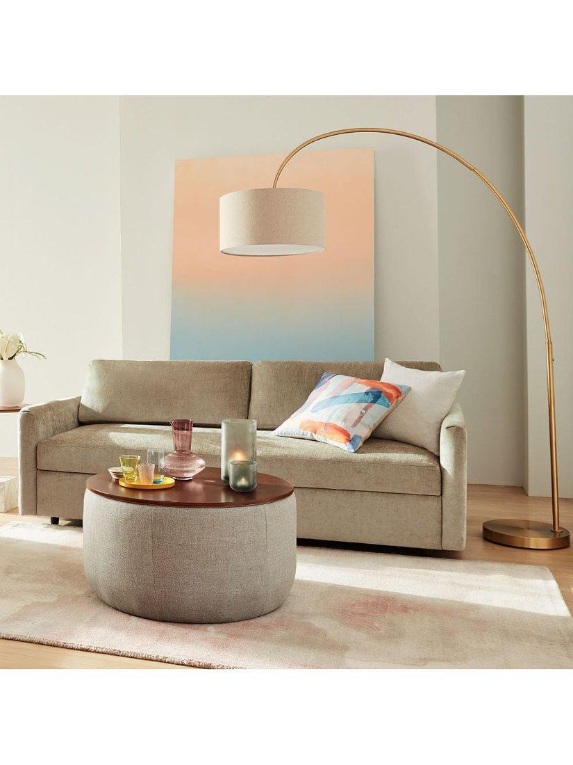 A modern classic. Polished Nickel metal sweeps up in a graceful gravity-defying arc from the base of this Overarching Floor Lamp, finishing with a simple linen shade. The smart design allows overhead light to be cast anywhere in a room.